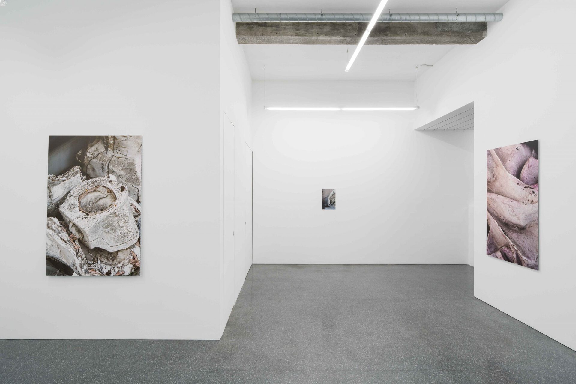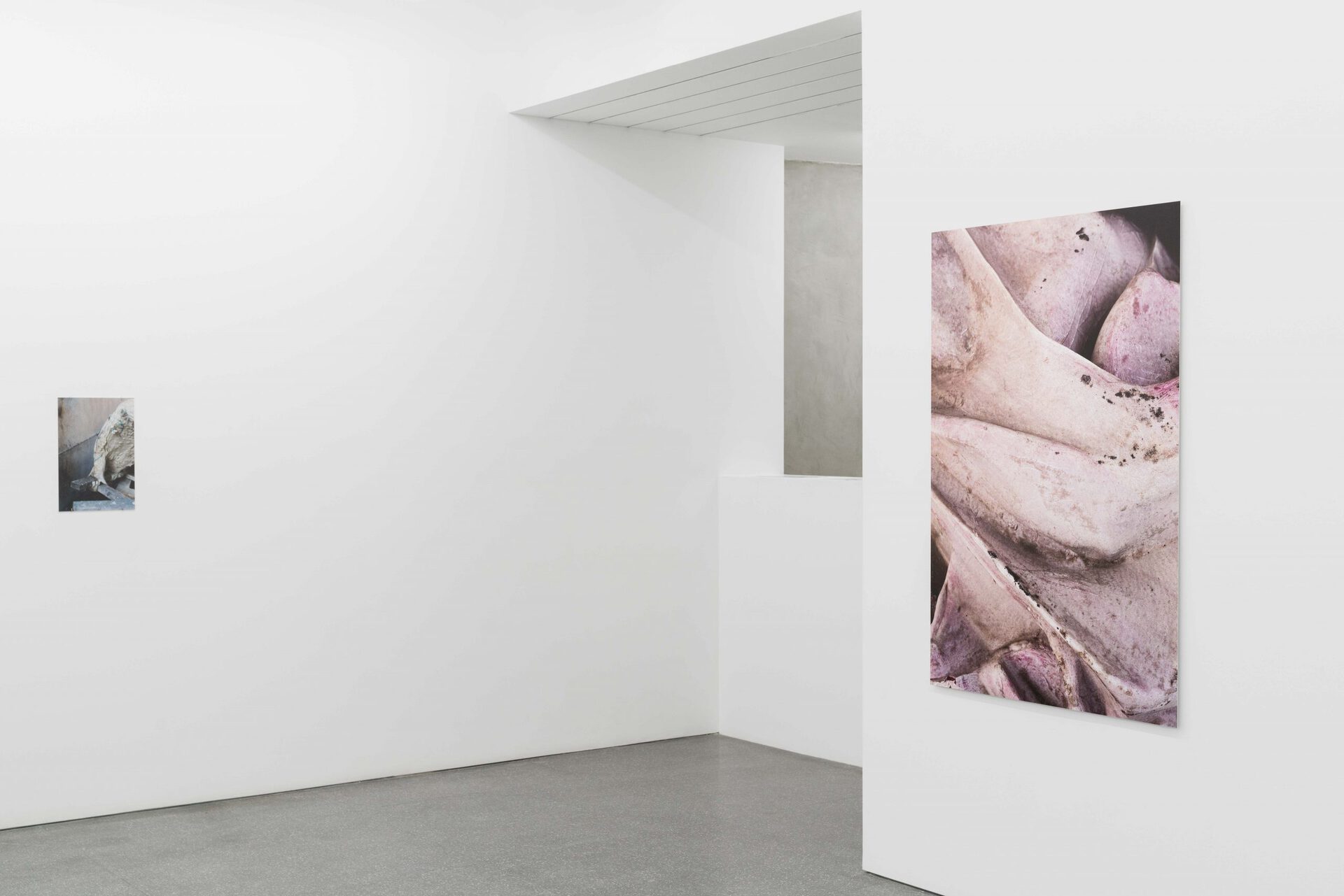 In this series the casts and materials are assigned complete autonomy from their site and placed into the realm of the image. The term rend, coined by Georges Didi-Huberman, applies to the process of making visible, inverting the image from its logic into a layered interpretation. The framing of the camera is a way to resignify specific surfaces, and of shaping meaning from a mass of cast-away objects. From within a cavern-like chamber, nails stitch together incised material and leave rusted remains that stain the white interior. Delicate incisions are found on the pink surface of another object which has begun to accumulate fungal organisms. Its alien and fleshy ligaments bend one over the other in a frozen caress. The implication of anthropomorphic forms renders this site a complex image – one in which the mind struggles to find recognizability in the negative.