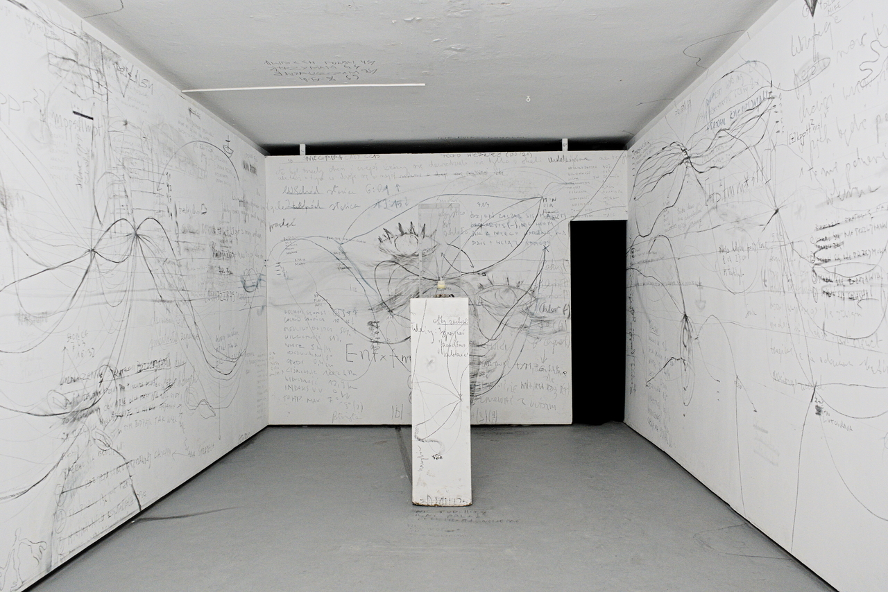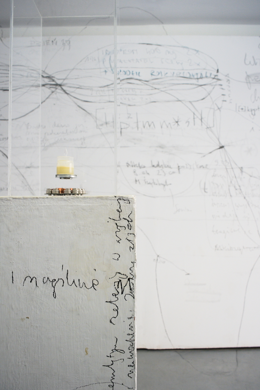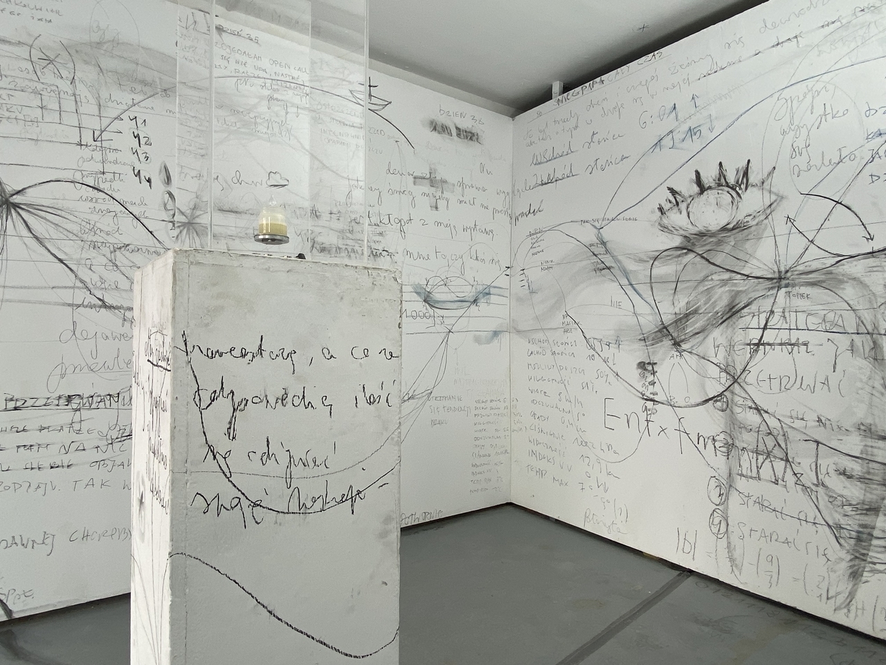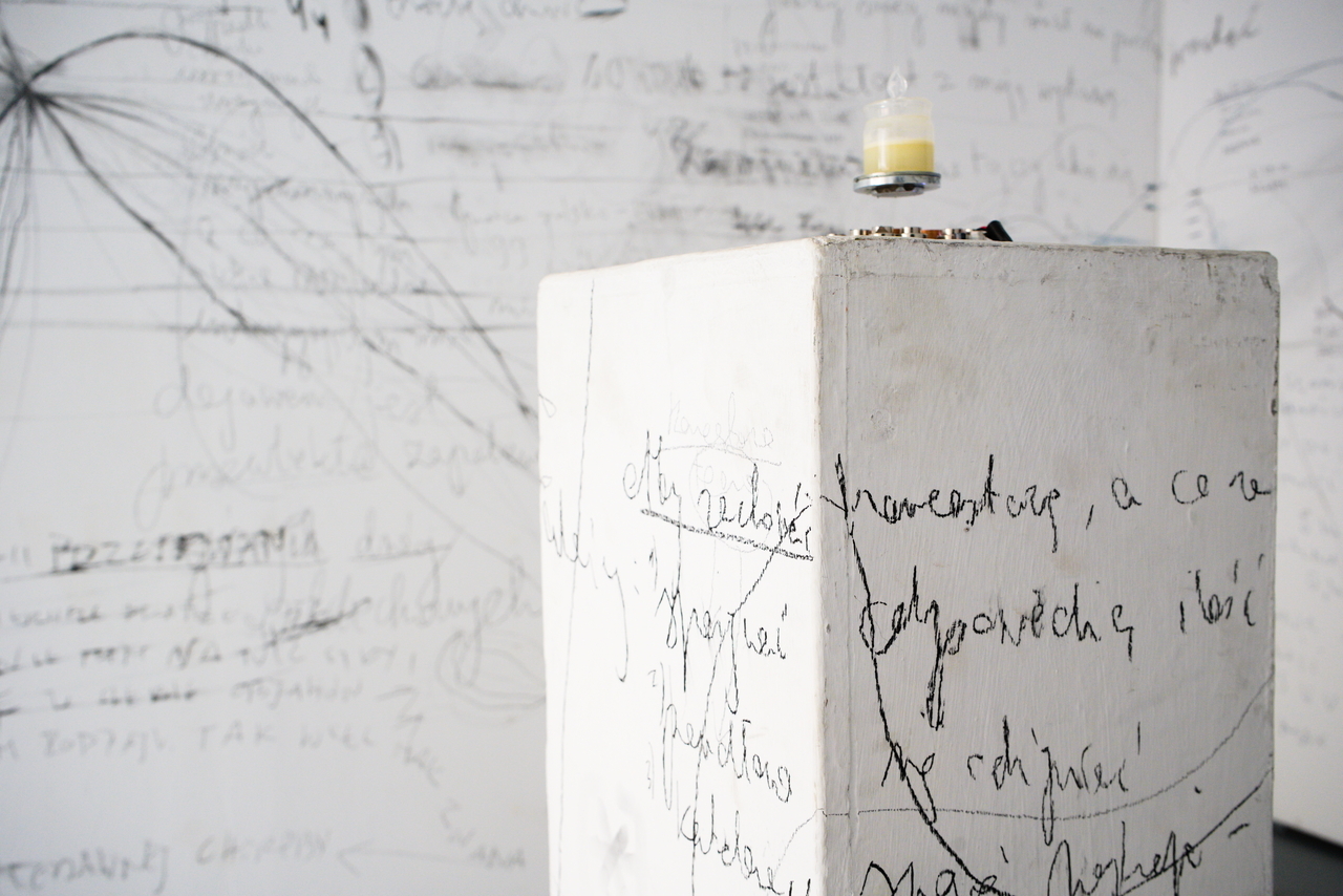 The components of FEEDBACK occur in two parts: a series of wall drawings and a sculpture with human breast milk.