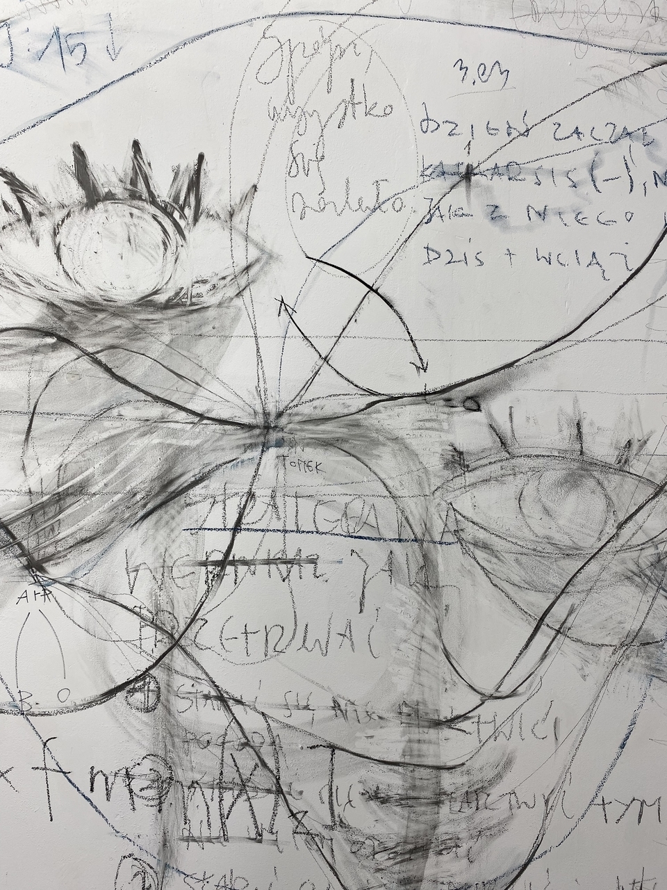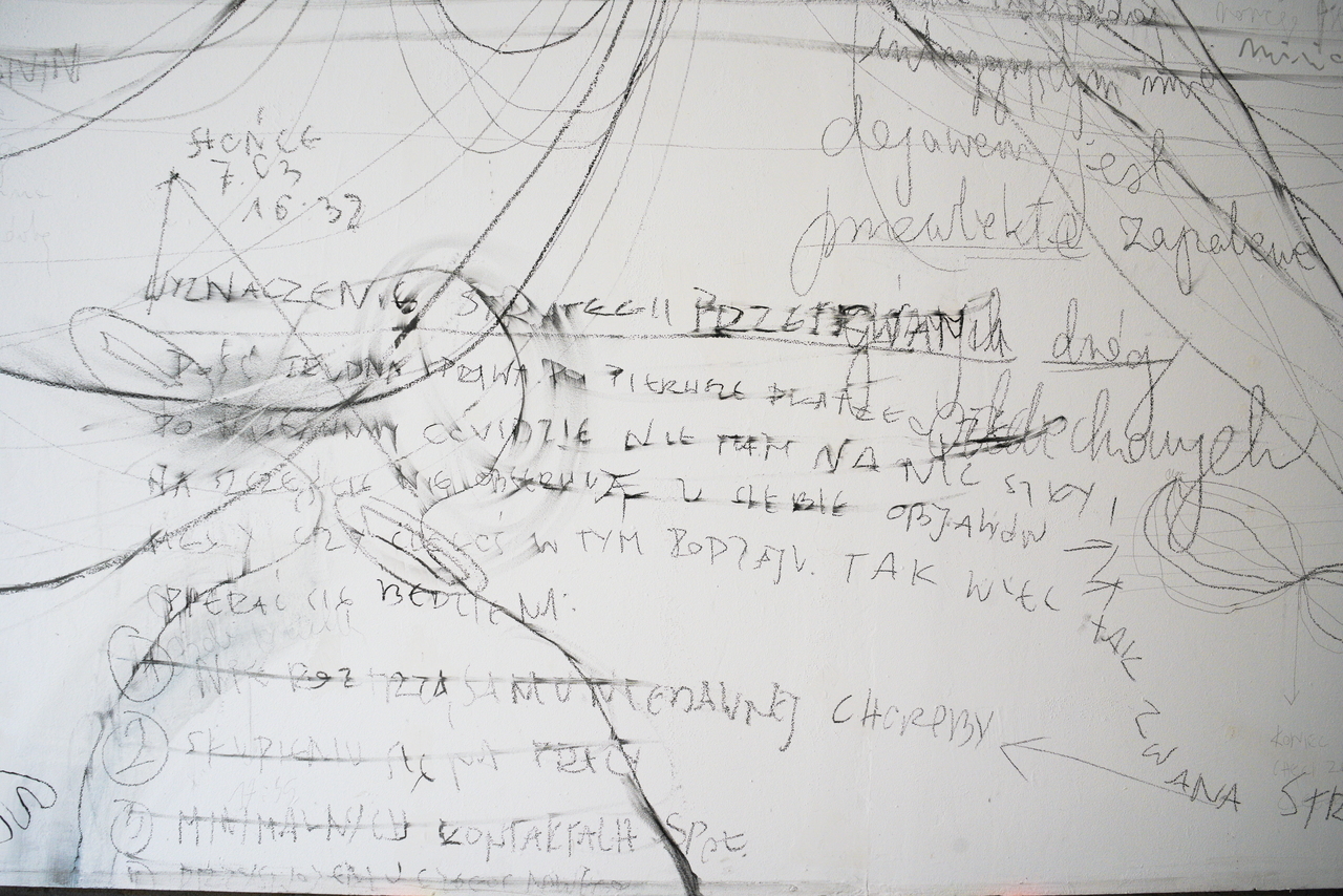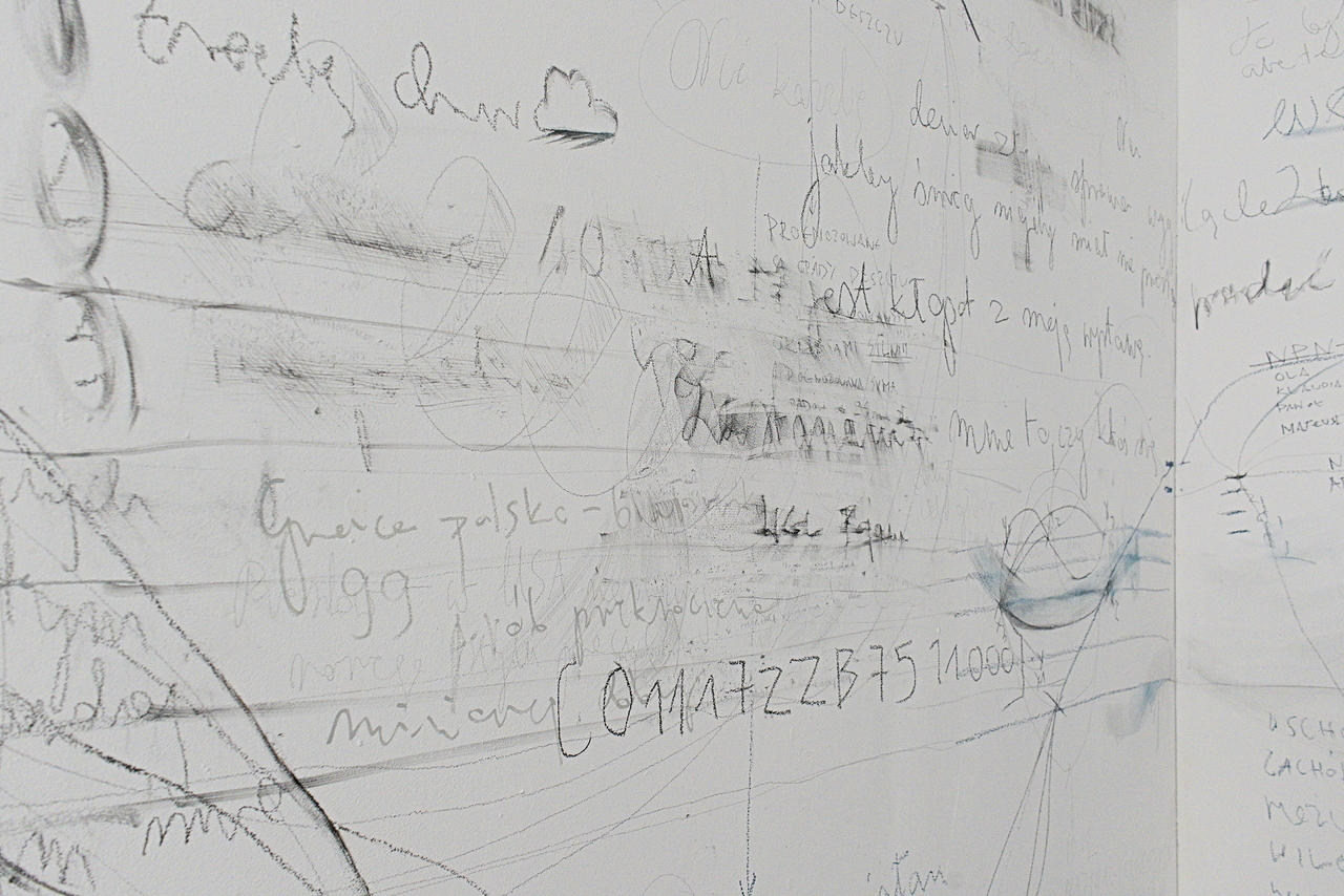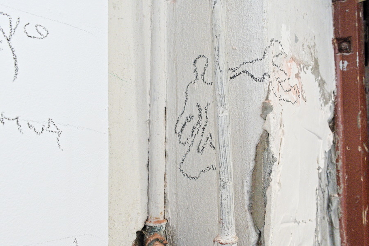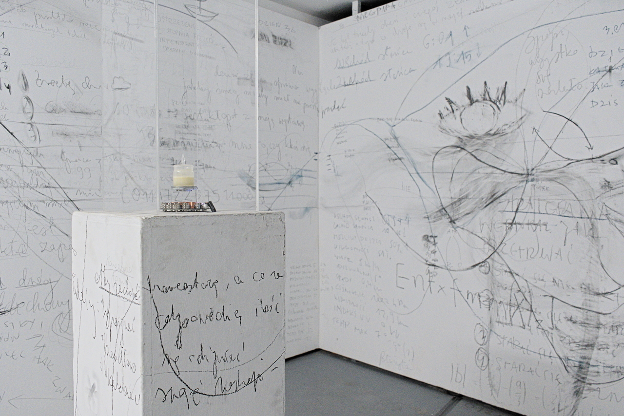 The components of FEEDBACK occur in two parts: a series of wall drawings and a sculpture with human breast milk.