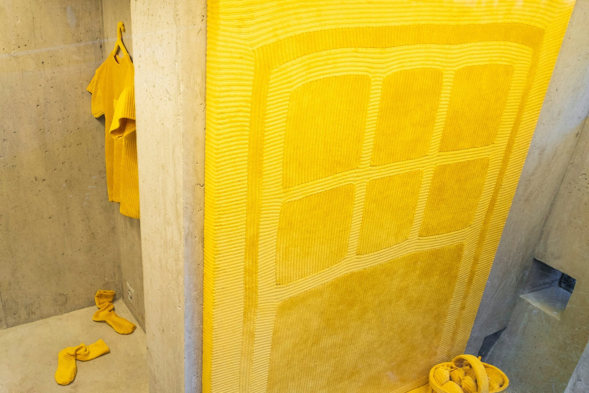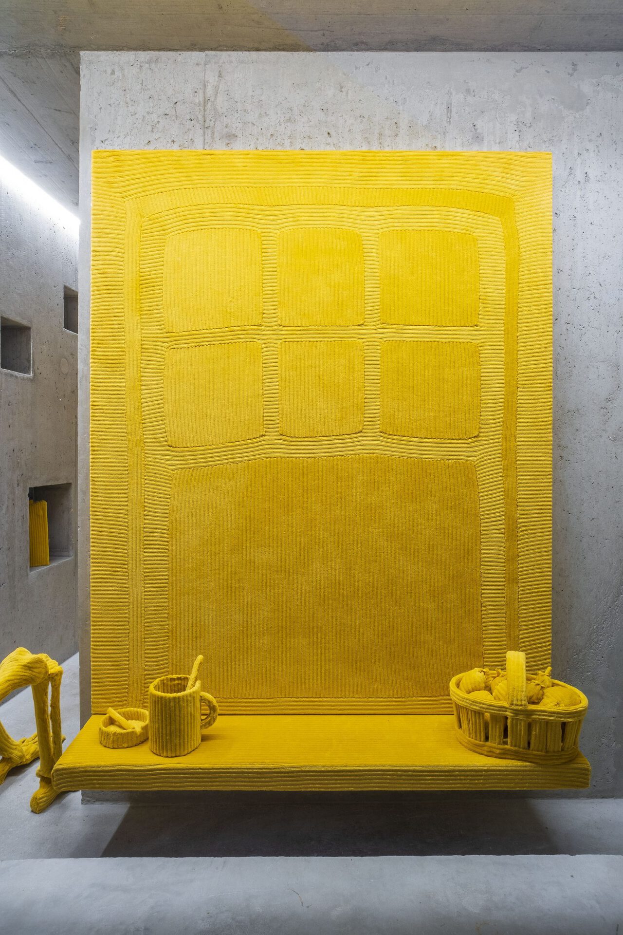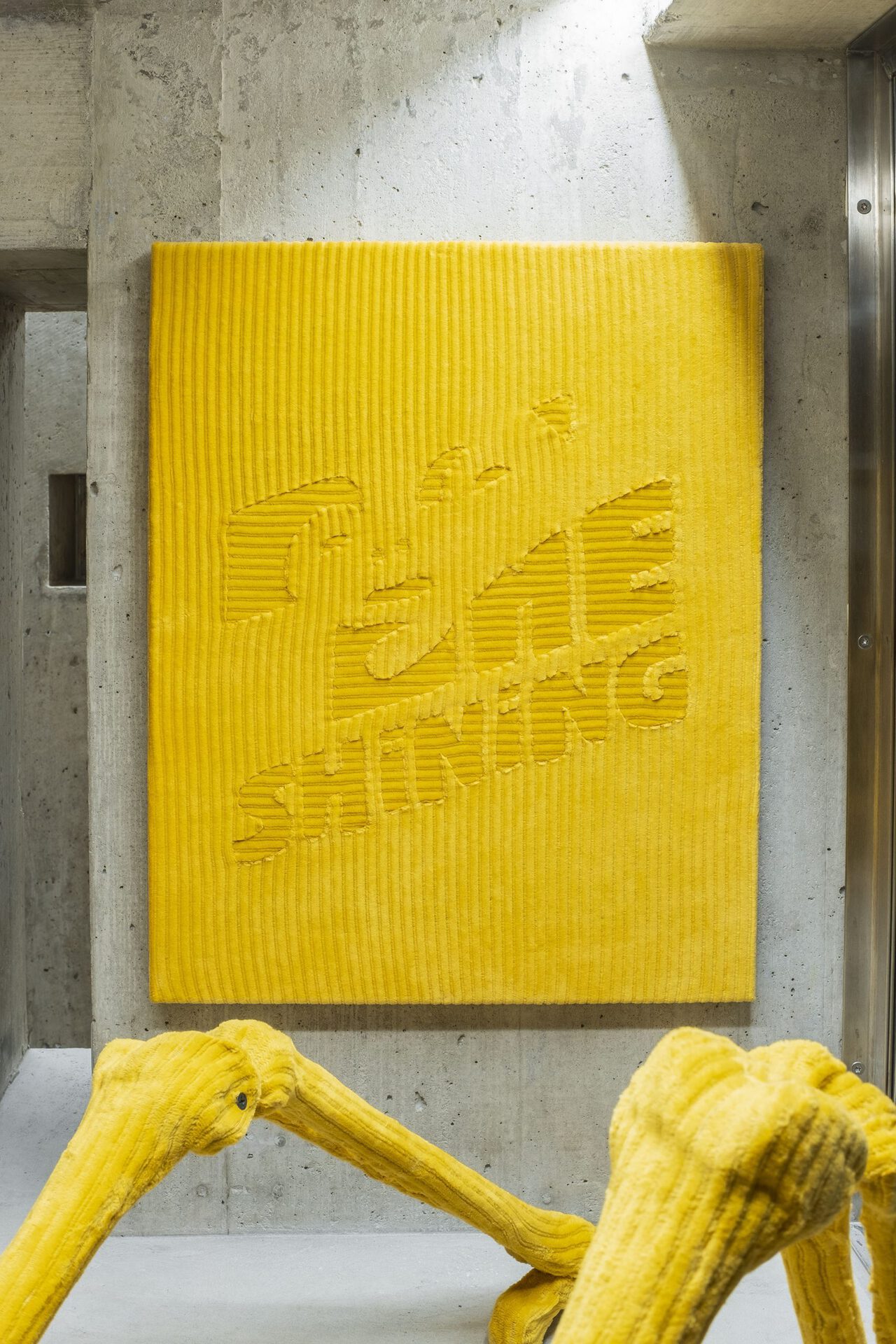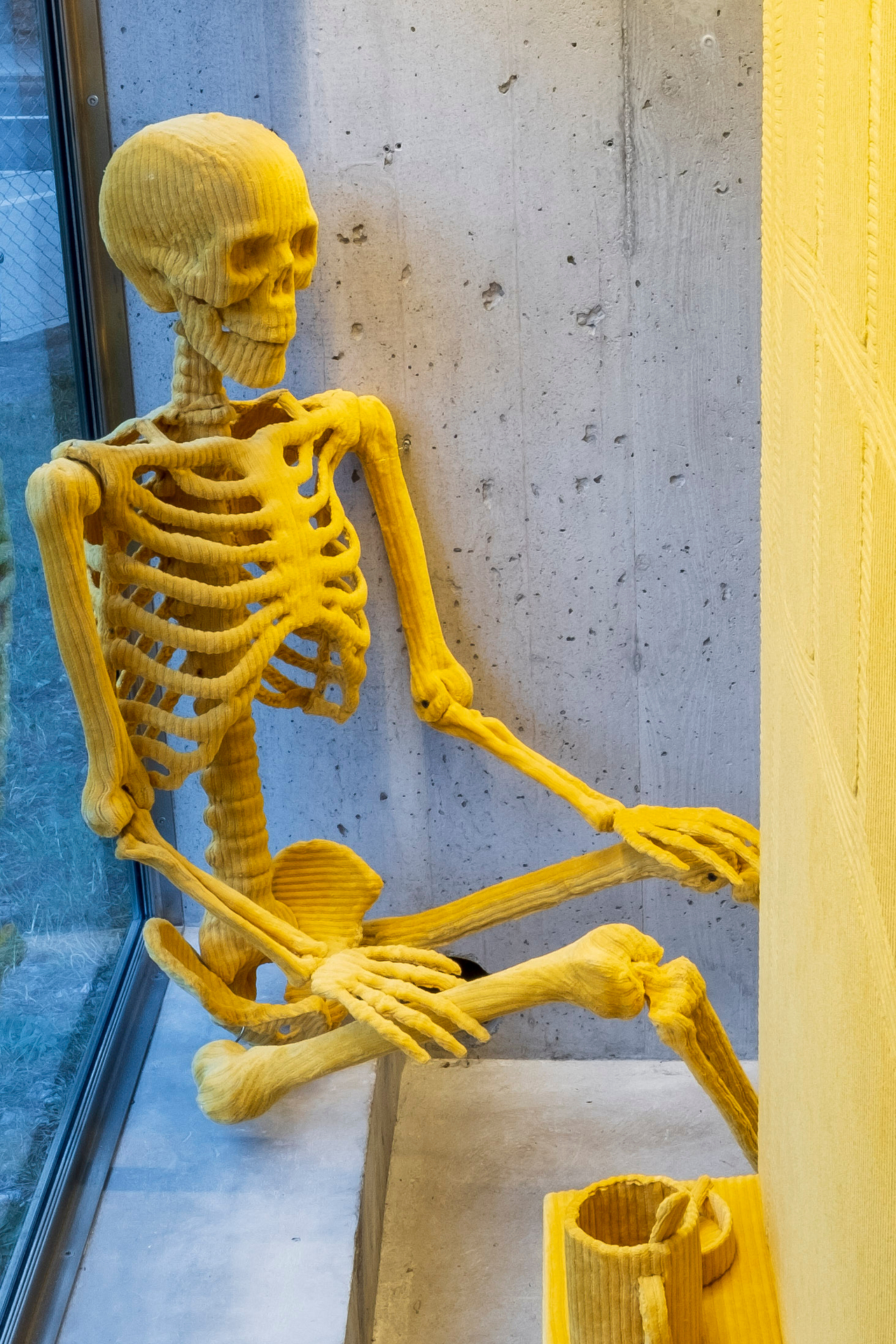 When approaching Lemme, the first thing that catches the eye is that everything on display – the skeletons, everyday objects, and wall pieces – is covered in the same ochre-yellow fabric. This gives the impression that they all spring from the same alternative reality. The soft quality of the corduroy and its ribbed contours are perfect for lending the skeletons a sense of vitality. In the case of the pillow and the two wall pieces, the characteristics of the corduroy are used to generate images. These images are informed by a cultural archive, combining references from art history with universal symbols and pop culture motifs.
