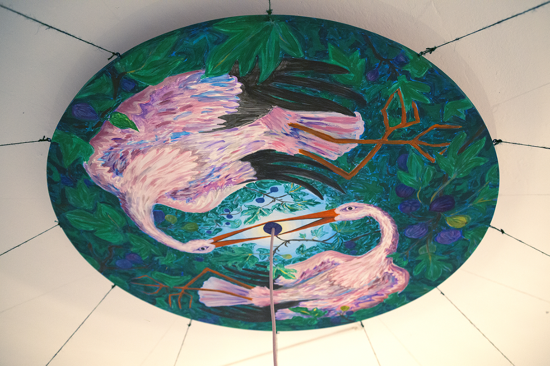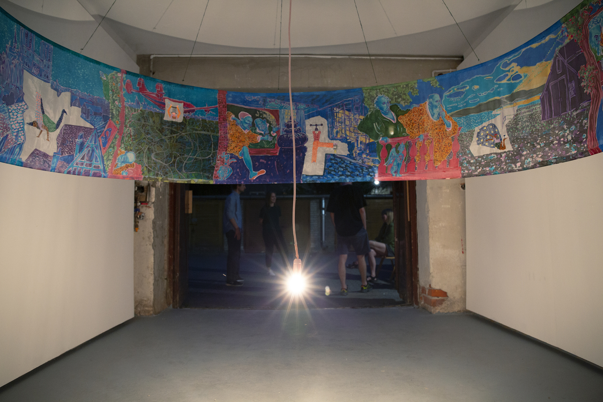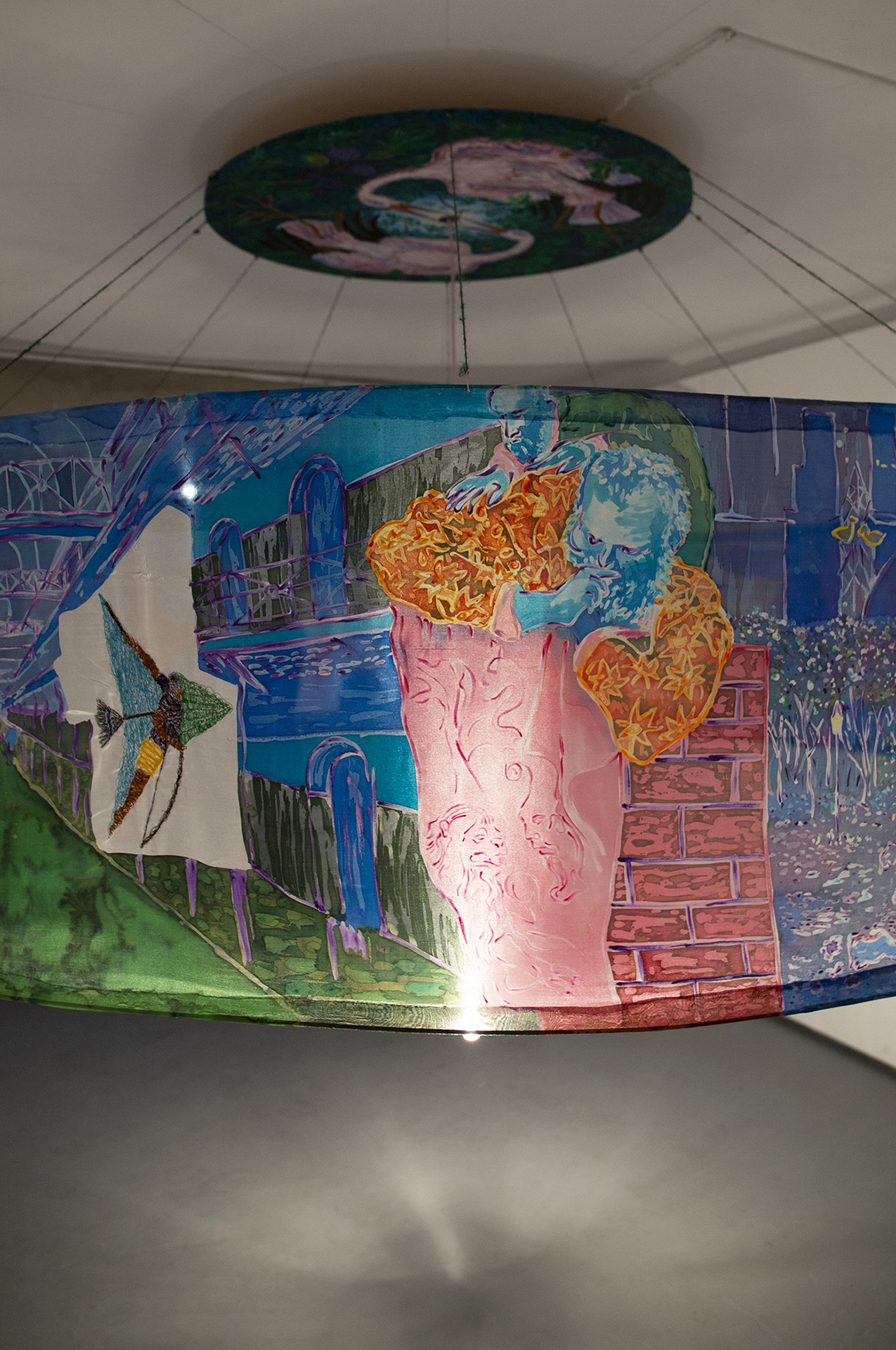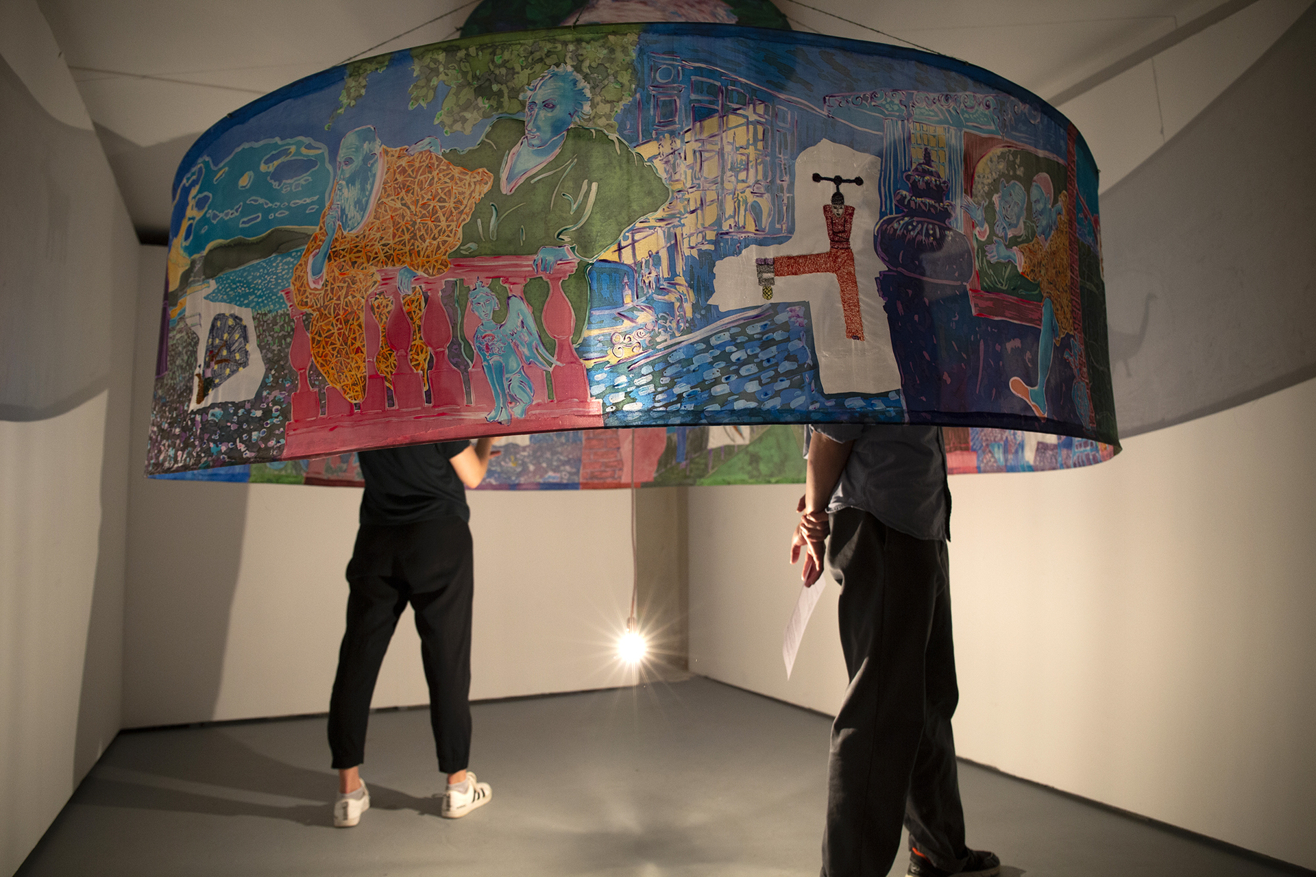 Lamps with various supports and painted silk shades have become a recurring form and motif in Paul DD Smith's work. At Stroboskop, Smith presents a new lamp sculpture that fills the entire space, and, for the first time, invites the viewer to step inside of it. In making this space available, Smith evokes the tradition of the nineteenth century panorama, a hybrid of painting and architecture designed to create the unobstructed impression of a 360 degree view of a simulated environment. Smith uses this circular form of display to explore variations on the iconography of Susanna and the Elders, a story from the old testament in which a bathing female protagonist becomes subject to the voyeurism of two old men. The topic often has a double edged treatment, dramatizing the Elders' voyeurism as obscene while offering Susanna's naked body to the patron's/viewer's gaze. Rather than recreating this invasive gaze and the illusory panoptic principle of the traditional panorama, Smith's lamp intends to frustrate a definitive reading of the scene and fixed interpretation of bodies. The semi-transparent material of the lampshade itself, made of painted and partially embroidered silk, questions the stability and placement of the image: is it inside or outside (inverse and obverse) or cast as shadows on the walls? The aim is for this instability to reflect a metamorphic and “chimerical” approach to figuration that resists an acquisitive and petrifying gaze.