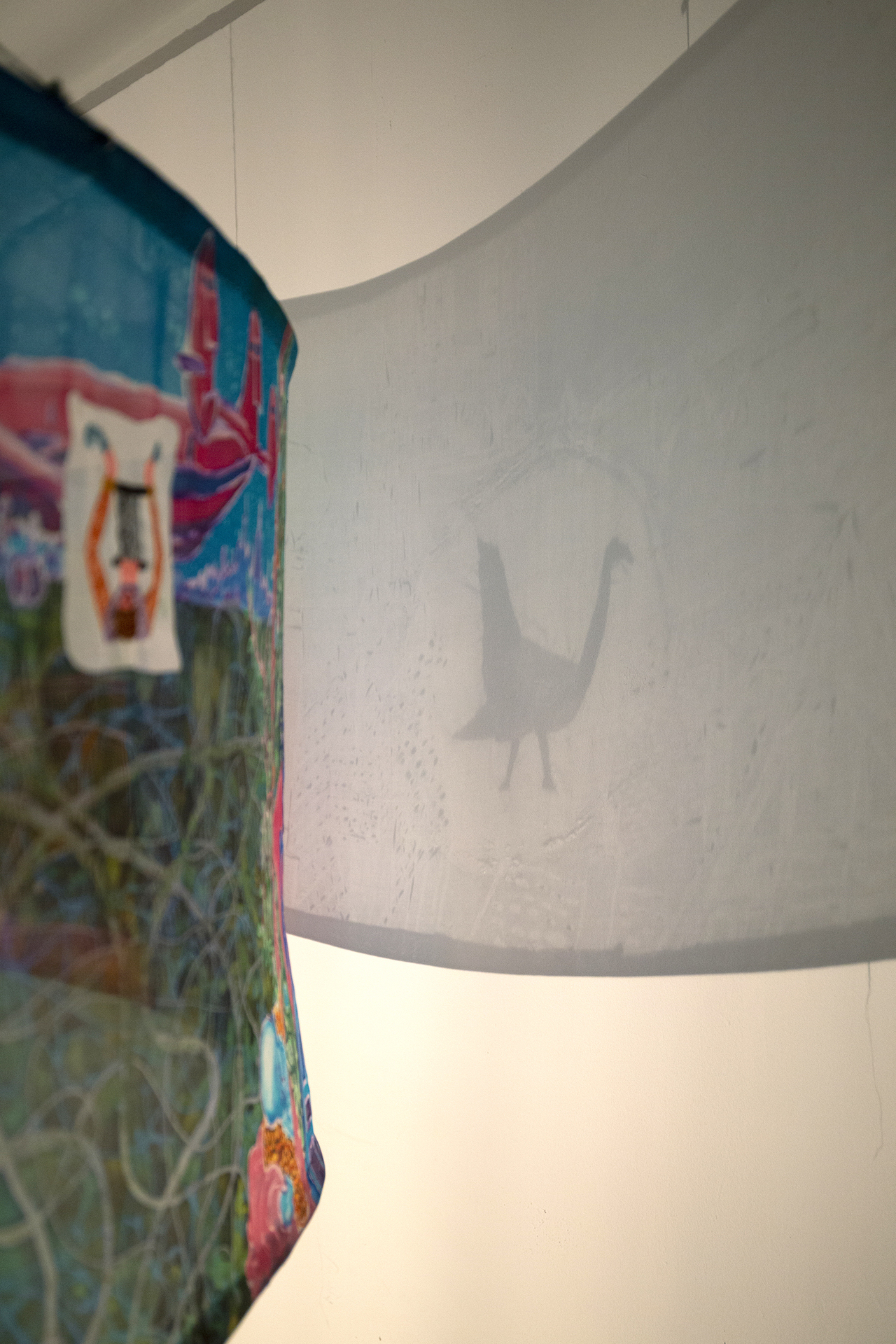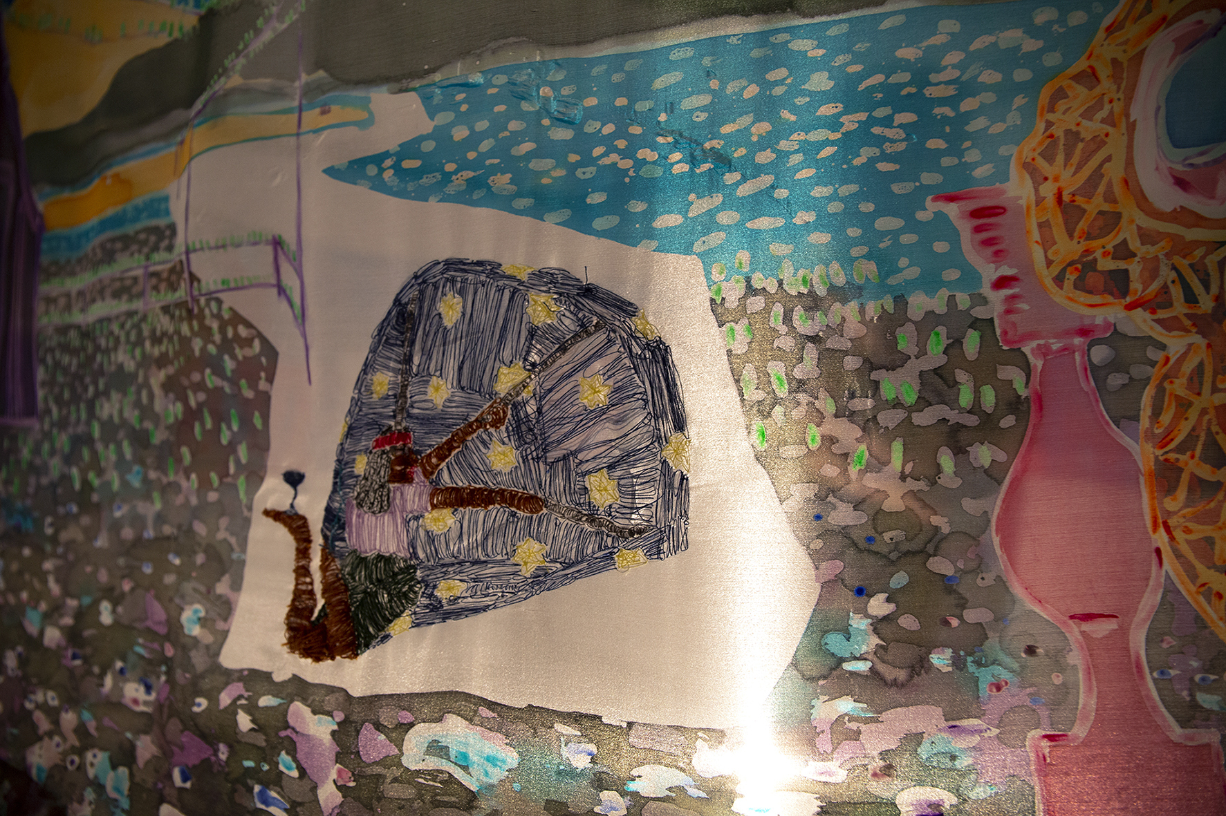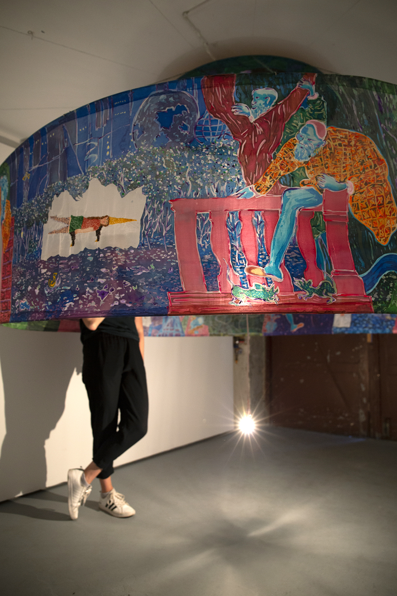 Lamps with various supports and painted silk shades have become a recurring form and motif in Paul DD Smith's work. At Stroboskop, Smith presents a new lamp sculpture that fills the entire space, and, for the first time, invites the viewer to step inside of it. In making this space available, Smith evokes the tradition of the nineteenth century panorama, a hybrid of painting and architecture designed to create the unobstructed impression of a 360 degree view of a simulated environment. Smith uses this circular form of display to explore variations on the iconography of Susanna and the Elders, a story from the old testament in which a bathing female protagonist becomes subject to the voyeurism of two old men. The topic often has a double edged treatment, dramatizing the Elders' voyeurism as obscene while offering Susanna's naked body to the patron's/viewer's gaze. Rather than recreating this invasive gaze and the illusory panoptic principle of the traditional panorama, Smith's lamp intends to frustrate a definitive reading of the scene and fixed interpretation of bodies. The semi-transparent material of the lampshade itself, made of painted and partially embroidered silk, questions the stability and placement of the image: is it inside or outside (inverse and obverse) or cast as shadows on the walls? The aim is for this instability to reflect a metamorphic and “chimerical” approach to figuration that resists an acquisitive and petrifying gaze.