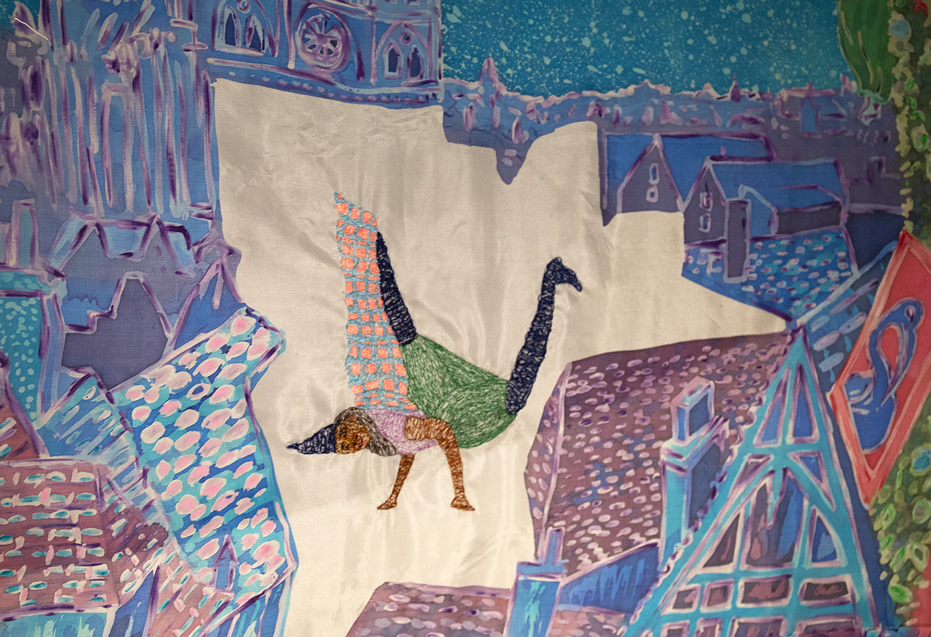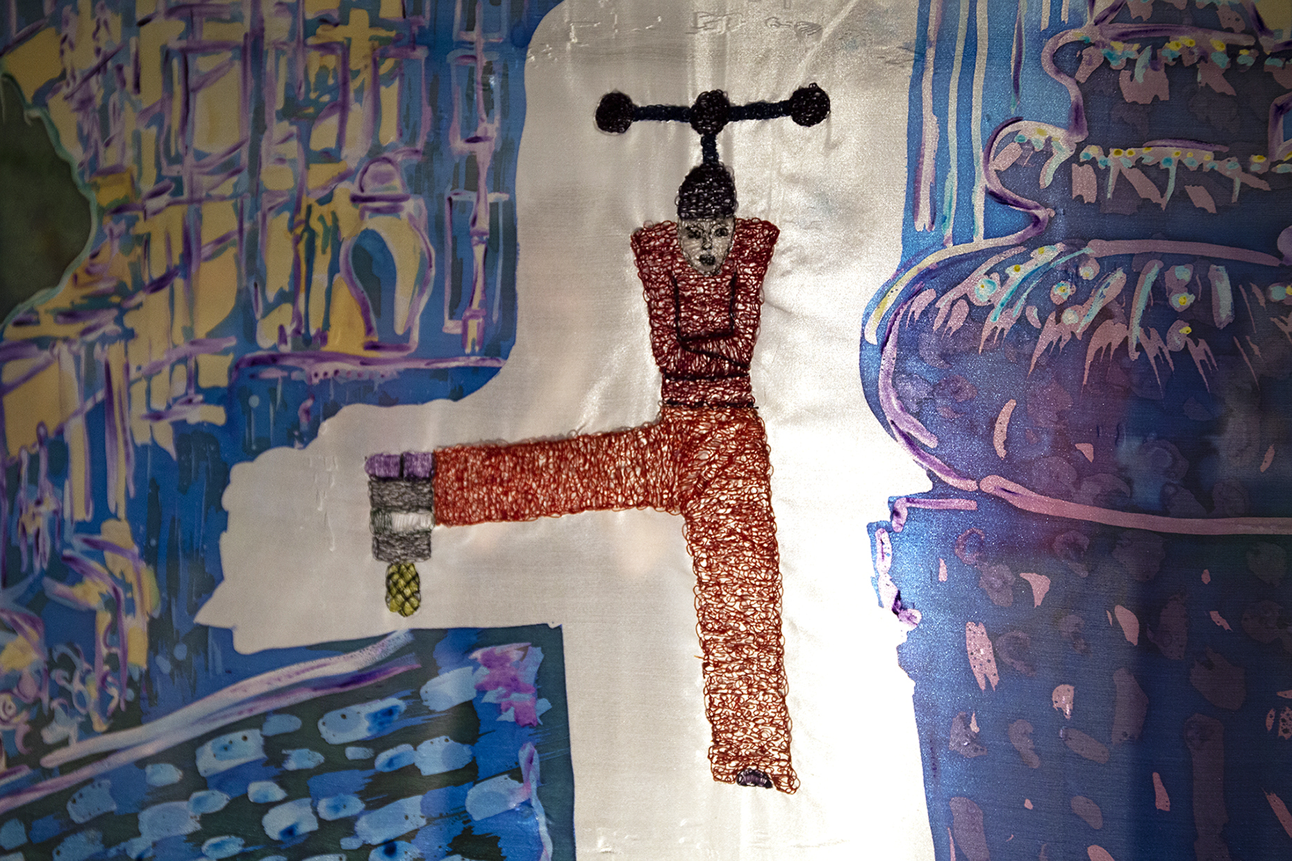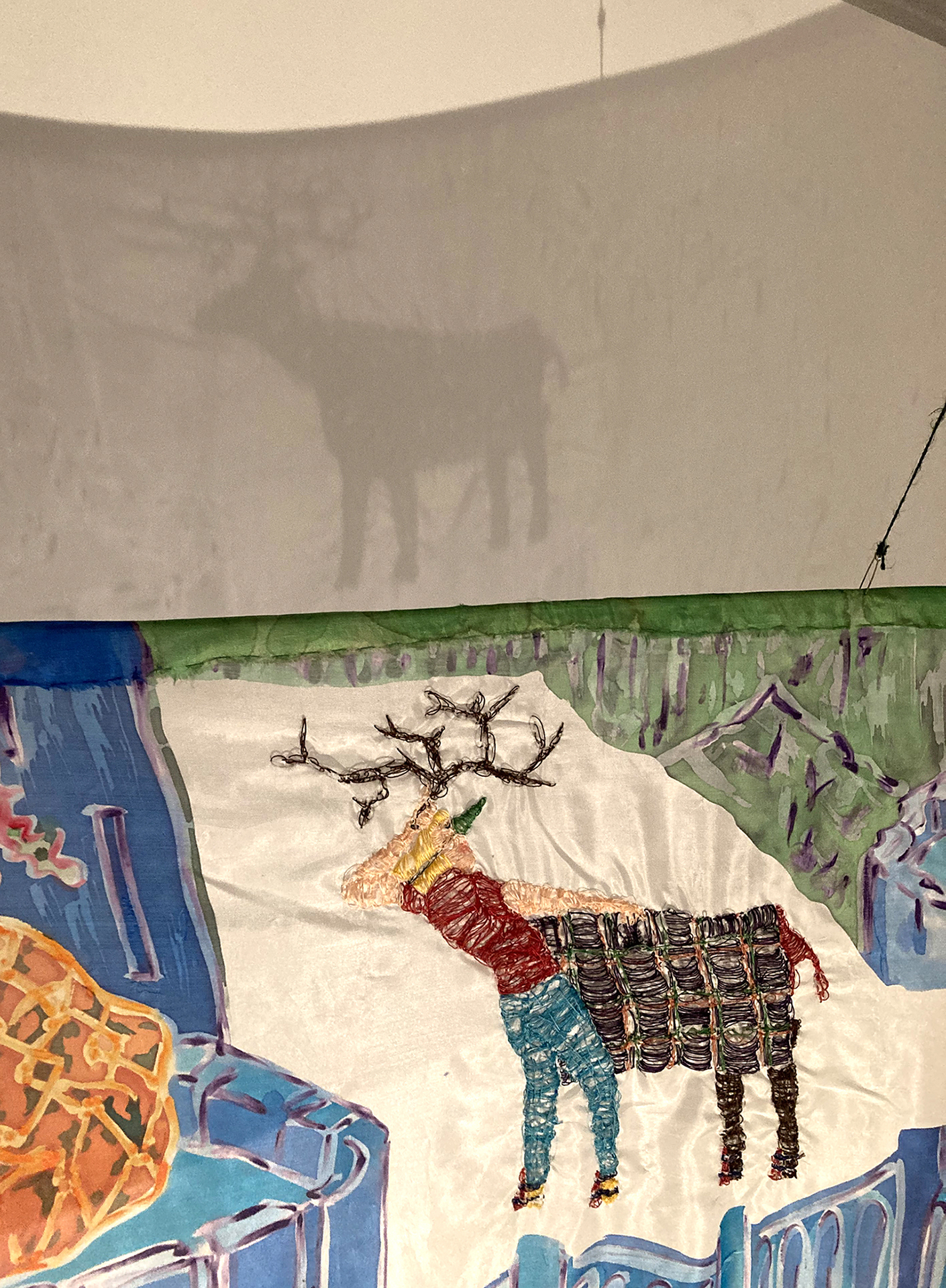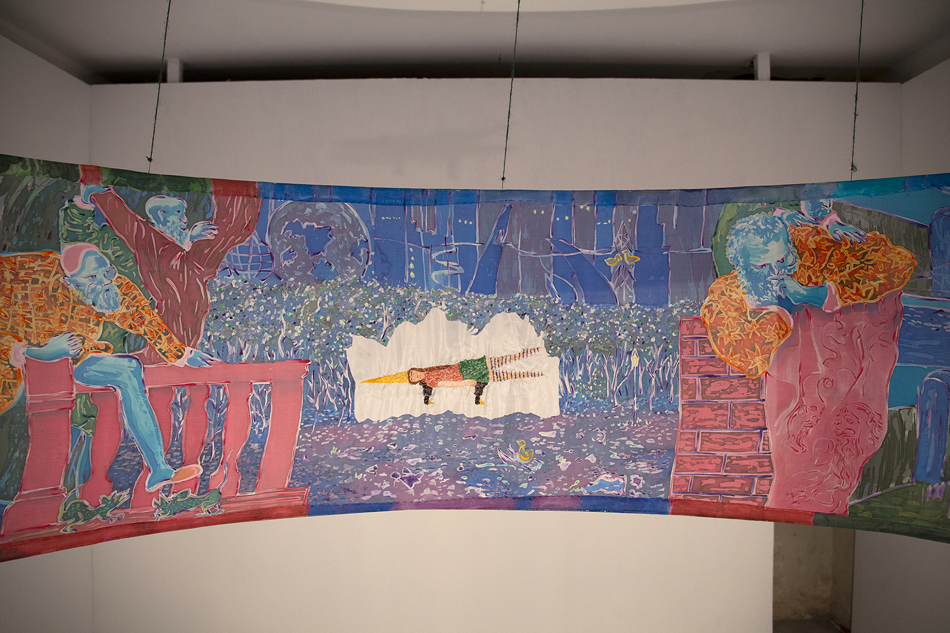 Lamps with various supports and painted silk shades have become a recurring form and motif in Paul DD Smith's work. At Stroboskop, Smith presents a new lamp sculpture that fills the entire space, and, for the first time, invites the viewer to step inside of it. In making this space available, Smith evokes the tradition of the nineteenth century panorama, a hybrid of painting and architecture designed to create the unobstructed impression of a 360 degree view of a simulated environment. Smith uses this circular form of display to explore variations on the iconography of Susanna and the Elders, a story from the old testament in which a bathing female protagonist becomes subject to the voyeurism of two old men. The topic often has a double edged treatment, dramatizing the Elders' voyeurism as obscene while offering Susanna's naked body to the patron's/viewer's gaze. Rather than recreating this invasive gaze and the illusory panoptic principle of the traditional panorama, Smith's lamp intends to frustrate a definitive reading of the scene and fixed interpretation of bodies. The semi-transparent material of the lampshade itself, made of painted and partially embroidered silk, questions the stability and placement of the image: is it inside or outside (inverse and obverse) or cast as shadows on the walls? The aim is for this instability to reflect a metamorphic and “chimerical” approach to figuration that resists an acquisitive and petrifying gaze.
