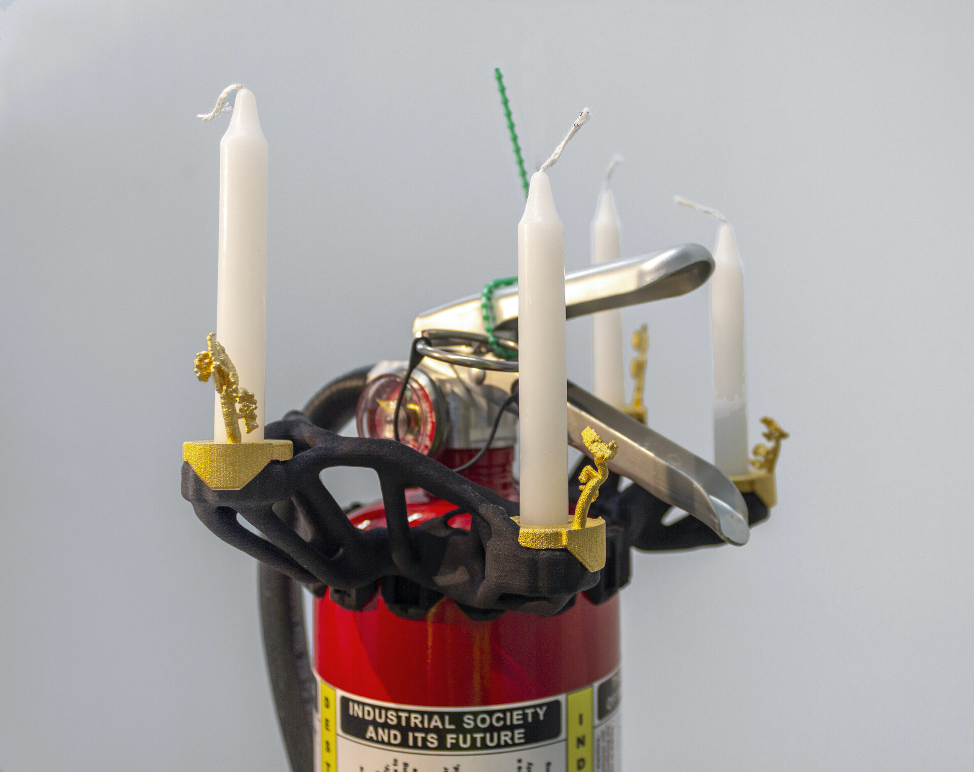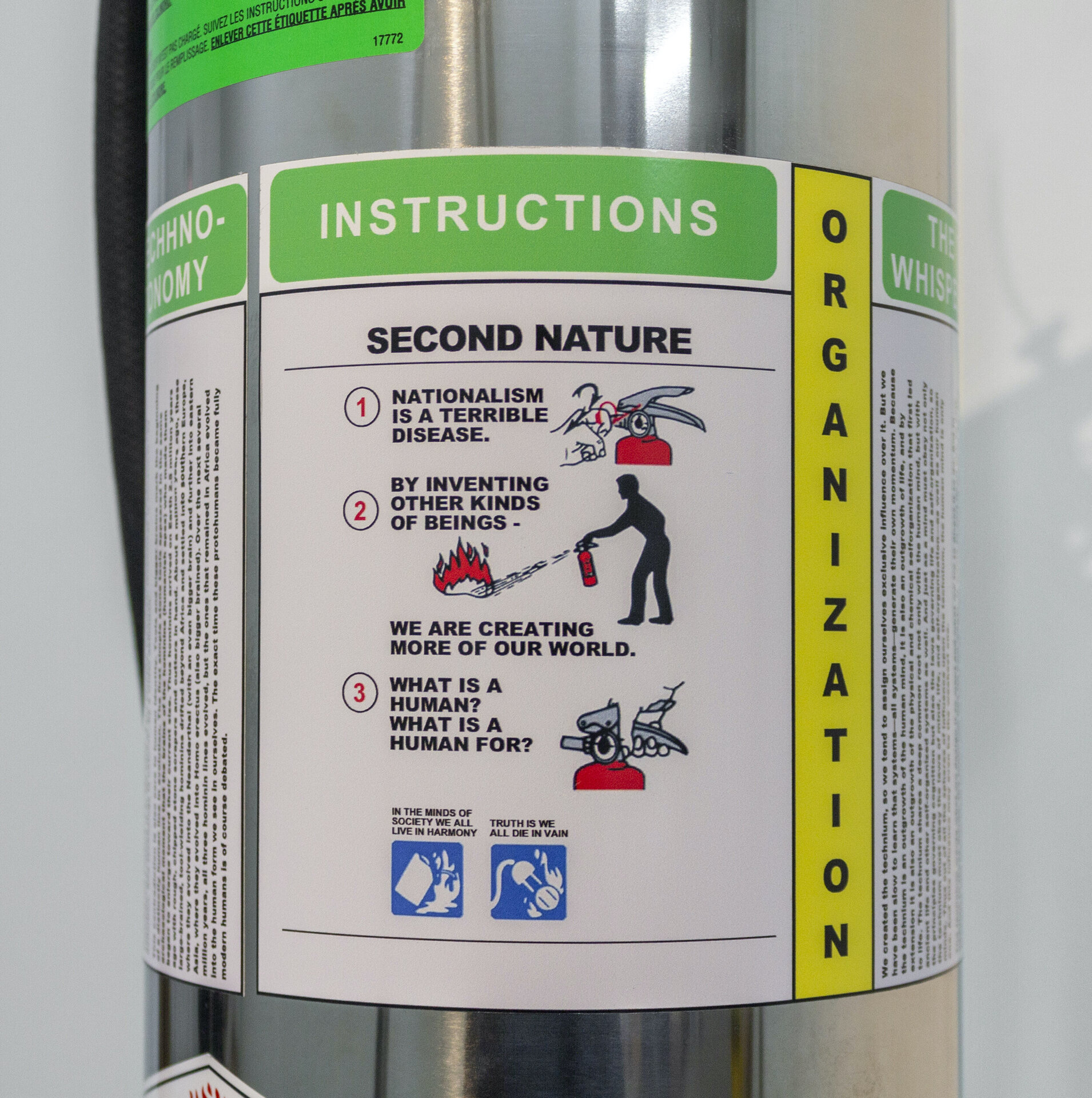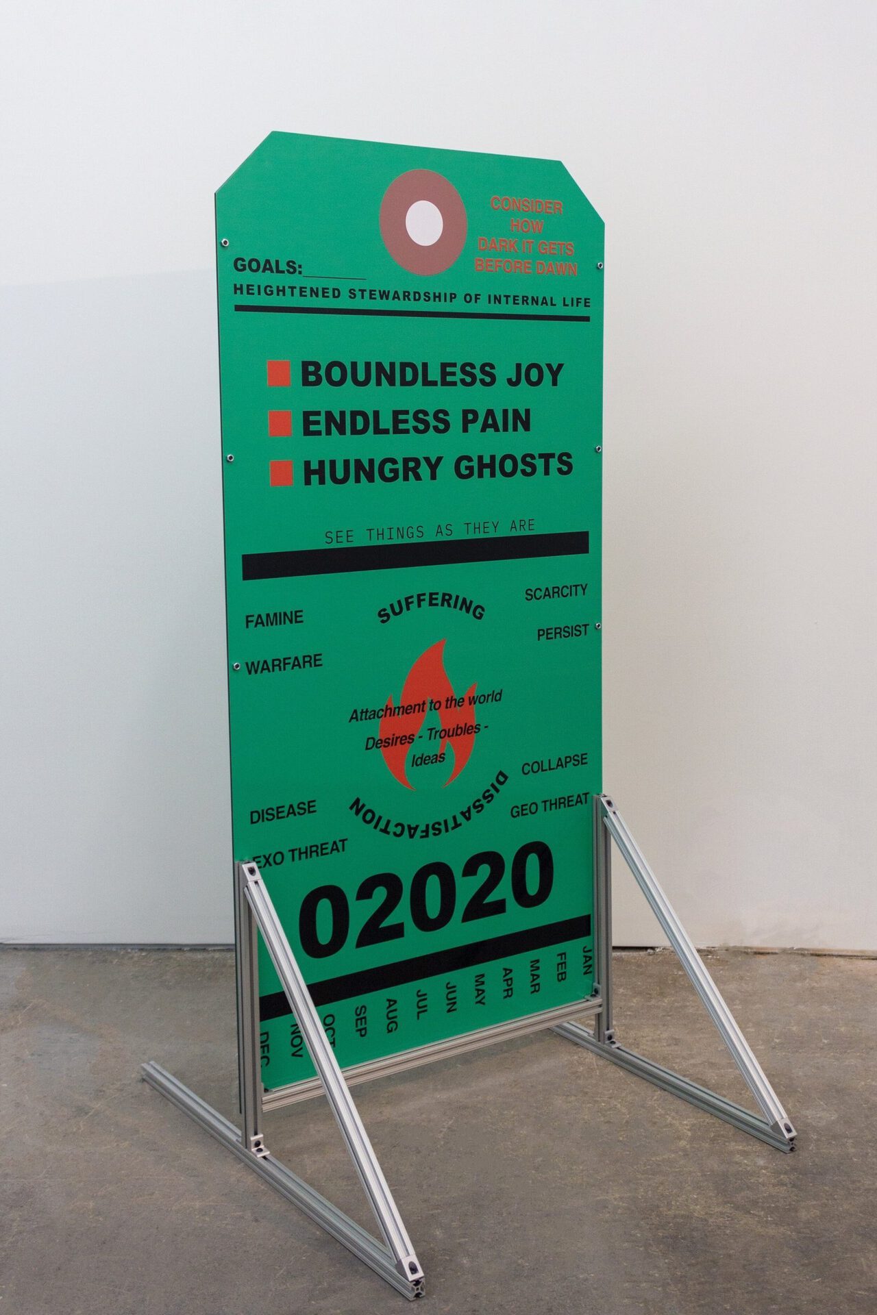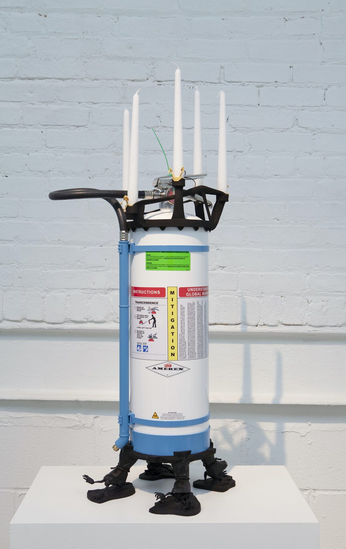 Encompassing a remarkable aesthetic and technical range, the exhibition co-opts the aesthetics of Silicon Valley: overwhelming infographics, branded identities, slick logos. Crispin undermines and explodes this visual language with a transhumanist mysticism drawn from global cultural reference points. The clock is ticking down. Metaphors of time and progress recur throughout: from 3D-printed candelabras to a wristwatch that only tells us not to panic. (Always relevant.) A series of modified fire hydrants and safety labels augur an unresolved future that is simultaneously utopian and dystopian: Boundless Joy, Endless Pain, Hungry Ghosts.