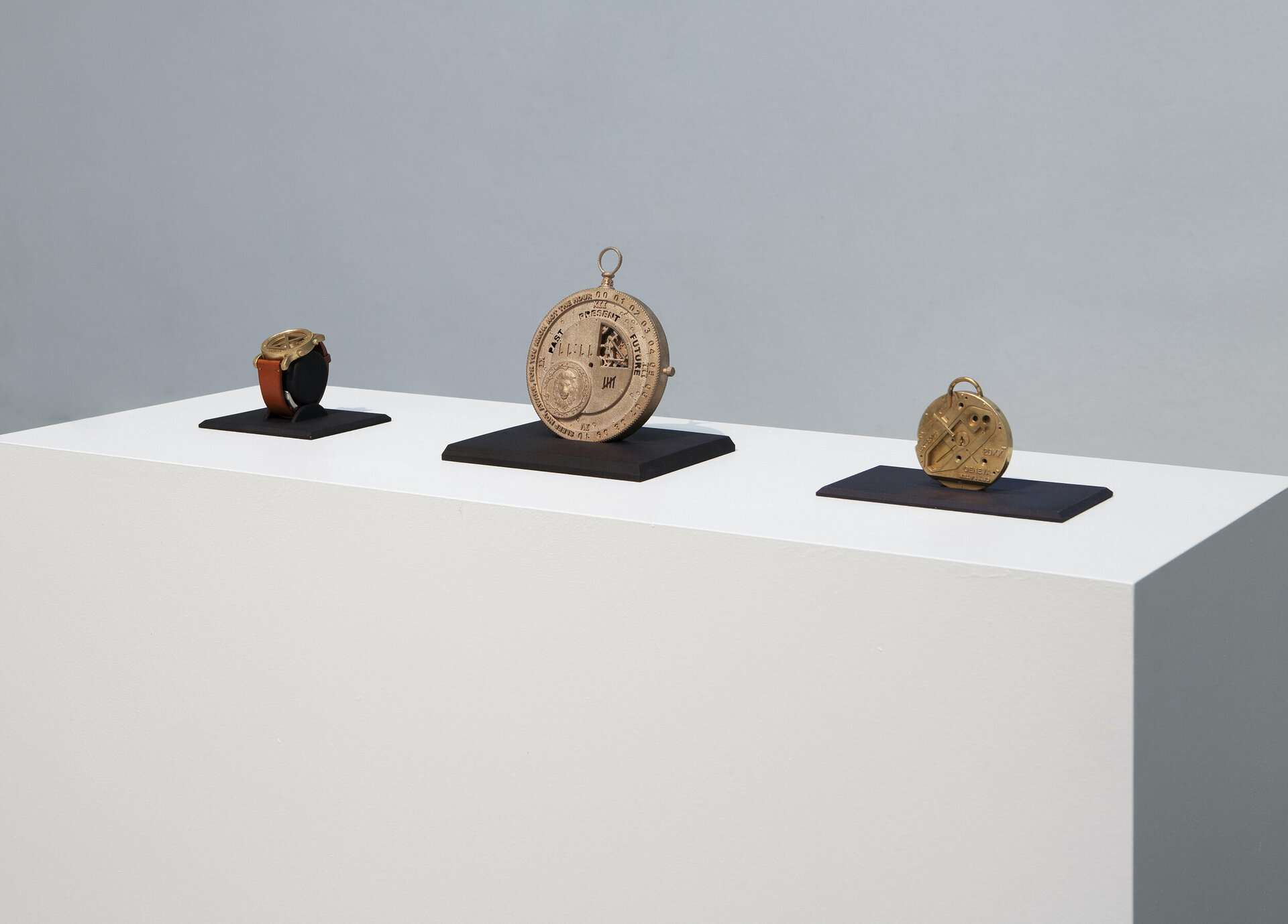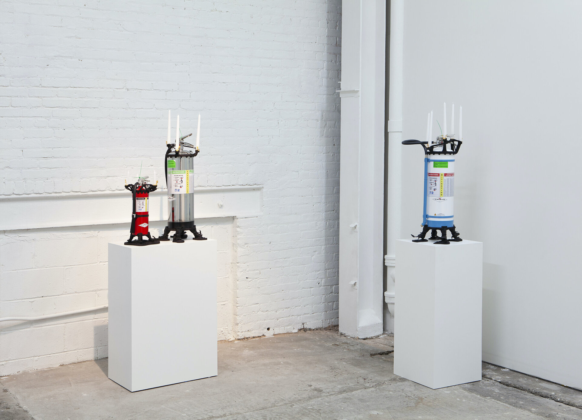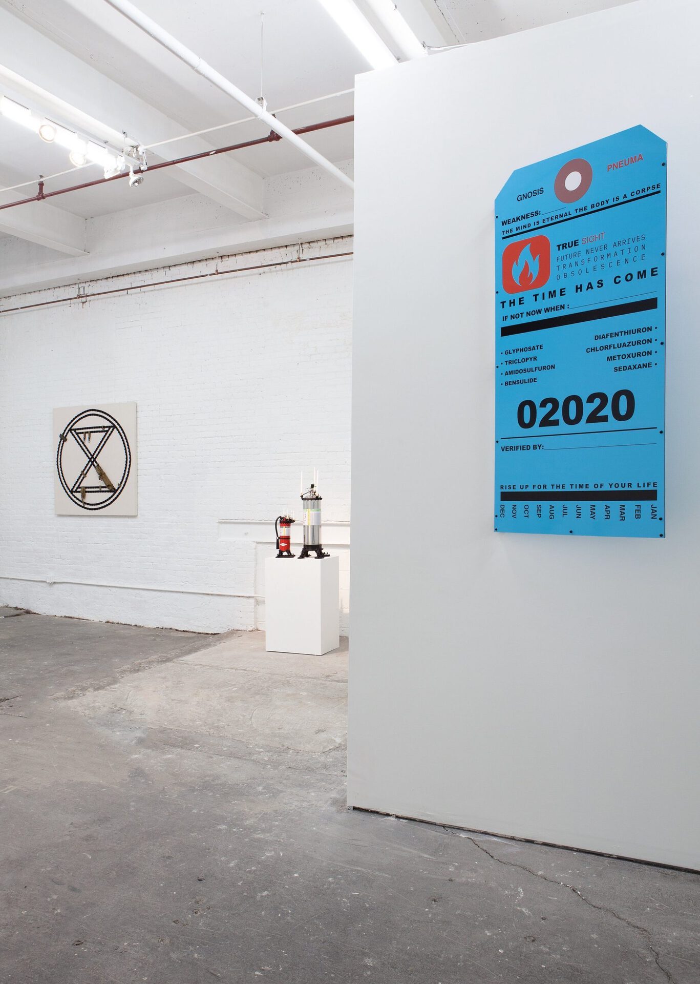 Encompassing a remarkable aesthetic and technical range, the exhibition co-opts the aesthetics of Silicon Valley: overwhelming infographics, branded identities, slick logos. Crispin undermines and explodes this visual language with a transhumanist mysticism drawn from global cultural reference points. The clock is ticking down. Metaphors of time and progress recur throughout: from 3D-printed candelabras to a wristwatch that only tells us not to panic. (Always relevant.) A series of modified fire hydrants and safety labels augur an unresolved future that is simultaneously utopian and dystopian: Boundless Joy, Endless Pain, Hungry Ghosts.
