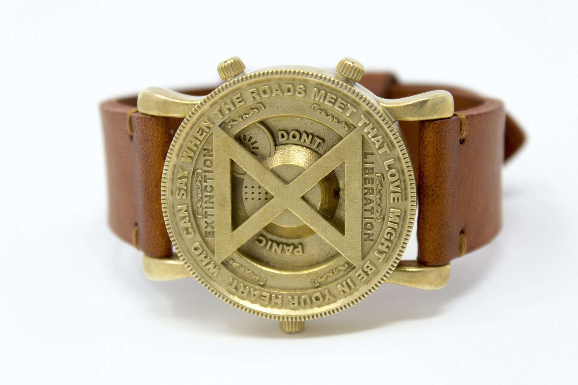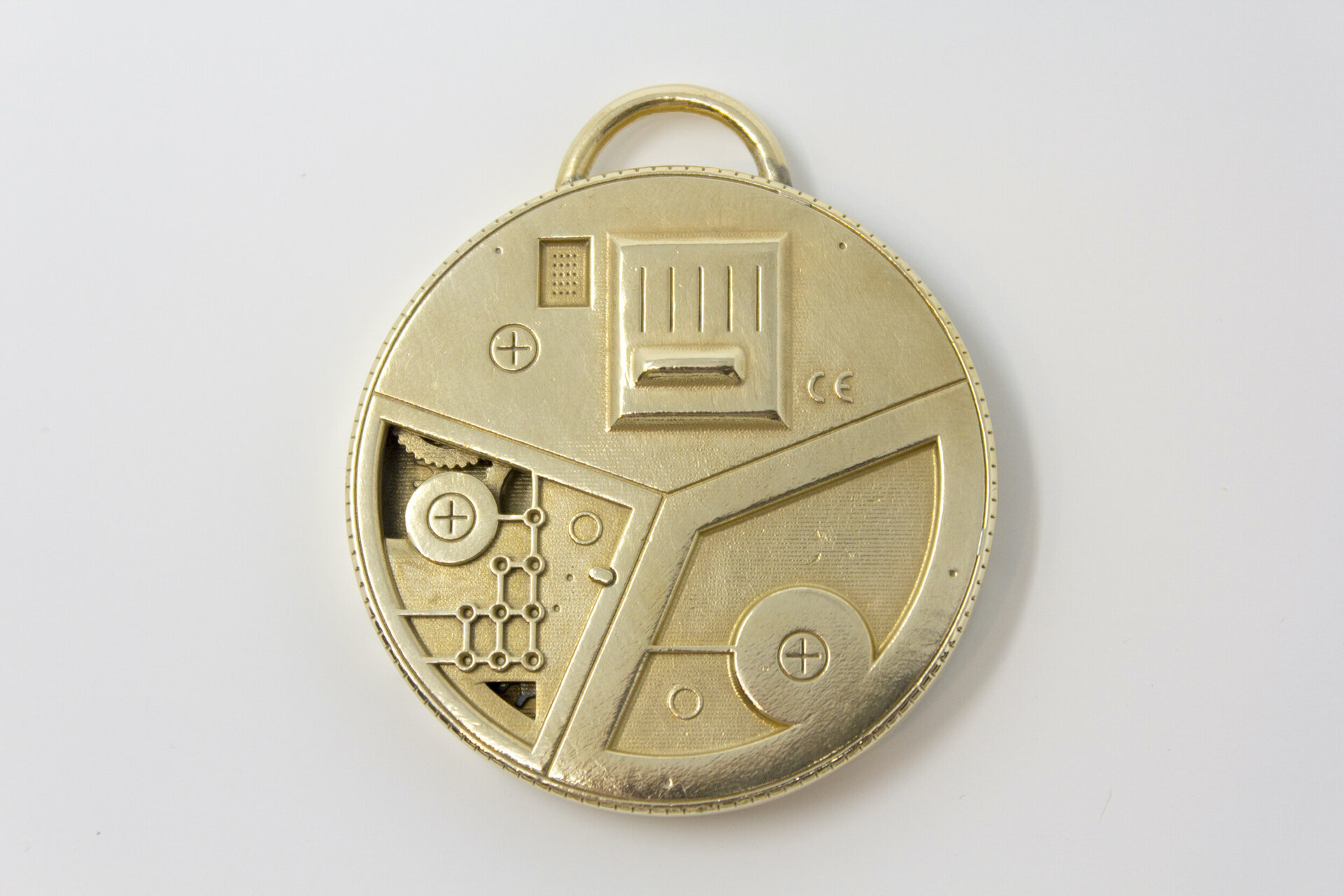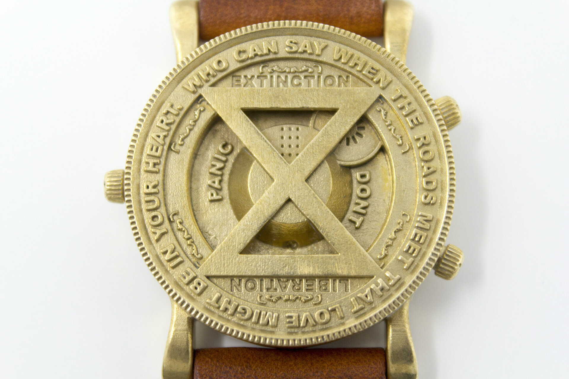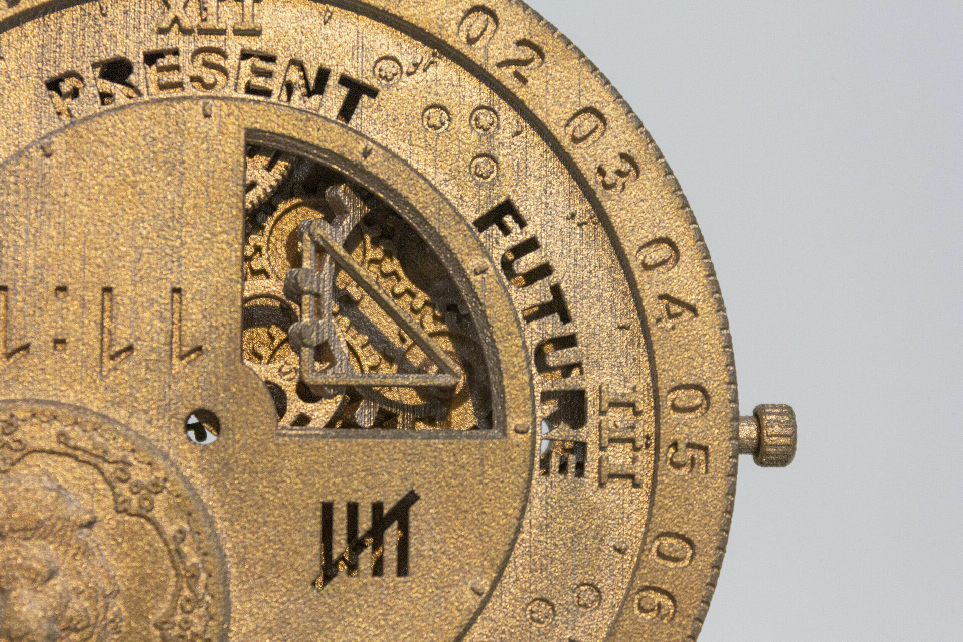 Encompassing a remarkable aesthetic and technical range, the exhibition co-opts the aesthetics of Silicon Valley: overwhelming infographics, branded identities, slick logos. Crispin undermines and explodes this visual language with a transhumanist mysticism drawn from global cultural reference points. The clock is ticking down. Metaphors of time and progress recur throughout: from 3D-printed candelabras to a wristwatch that only tells us not to panic. (Always relevant.) A series of modified fire hydrants and safety labels augur an unresolved future that is simultaneously utopian and dystopian: Boundless Joy, Endless Pain, Hungry Ghosts.