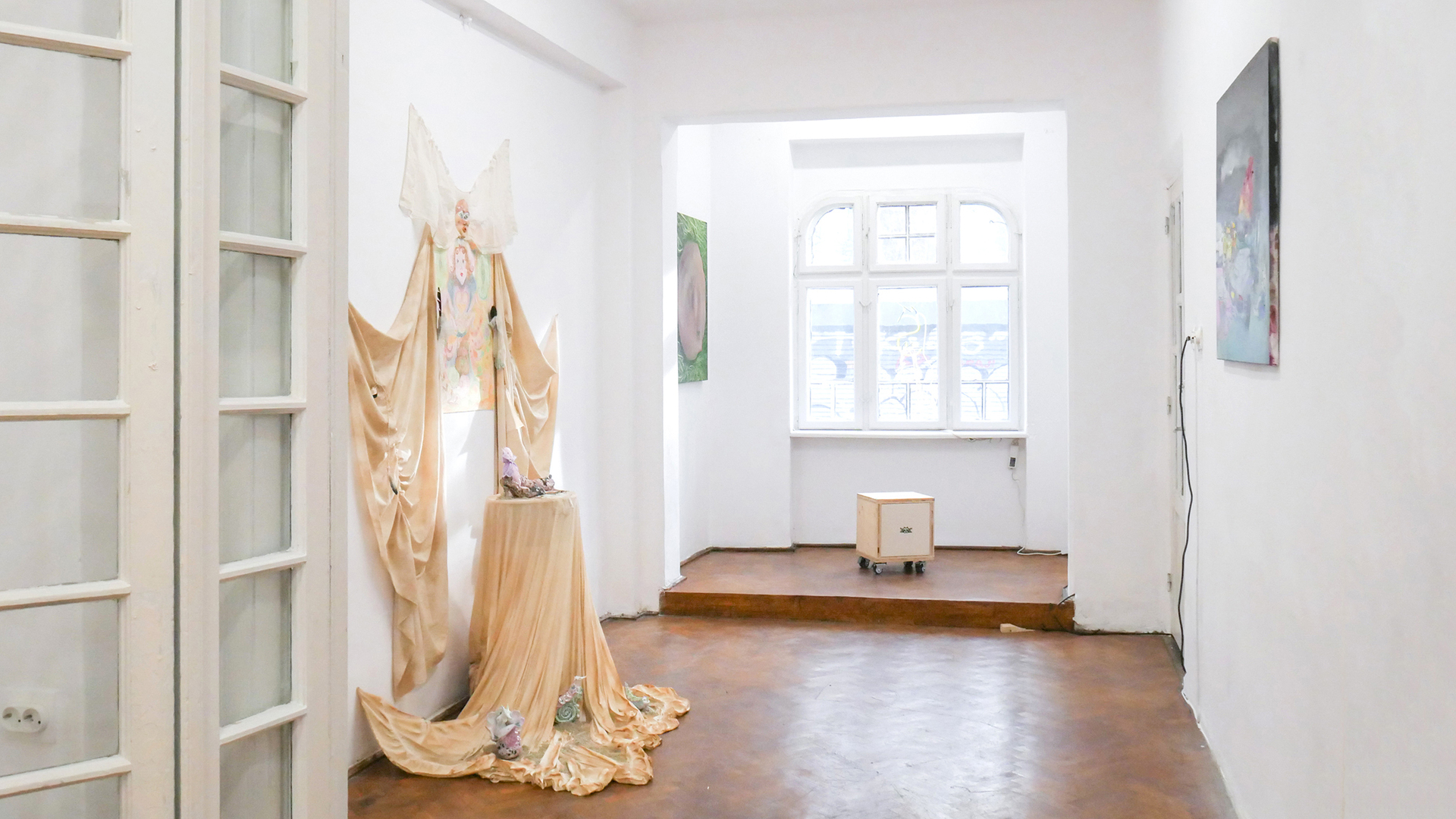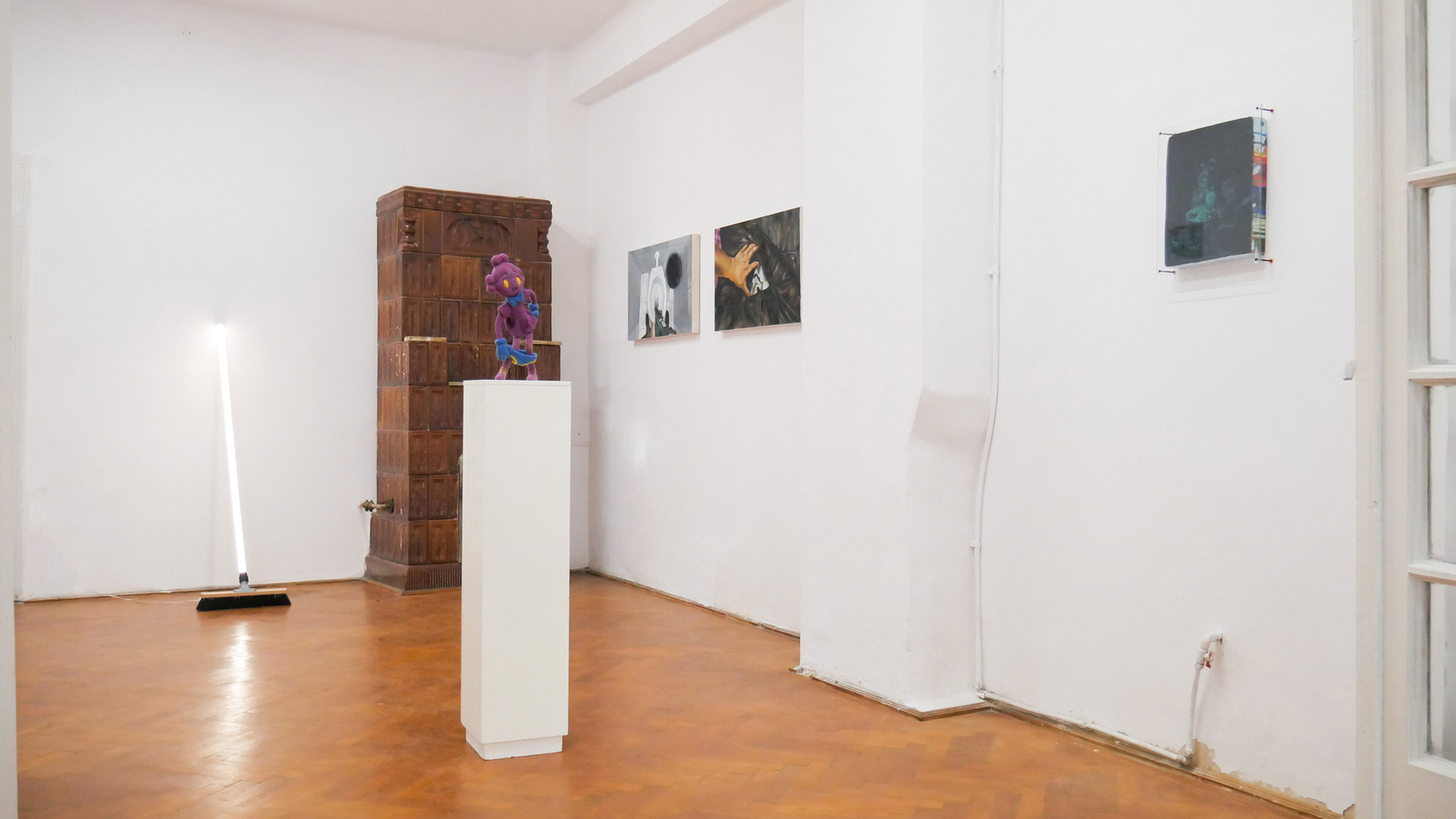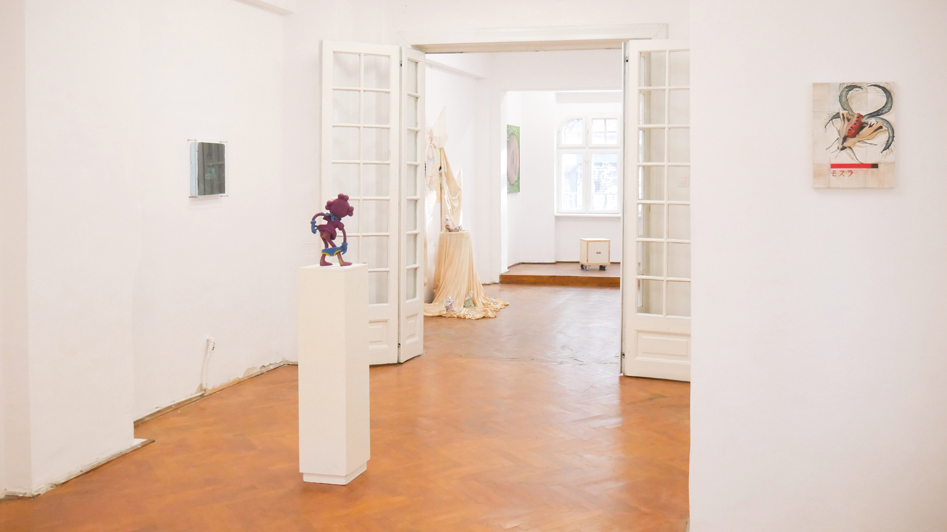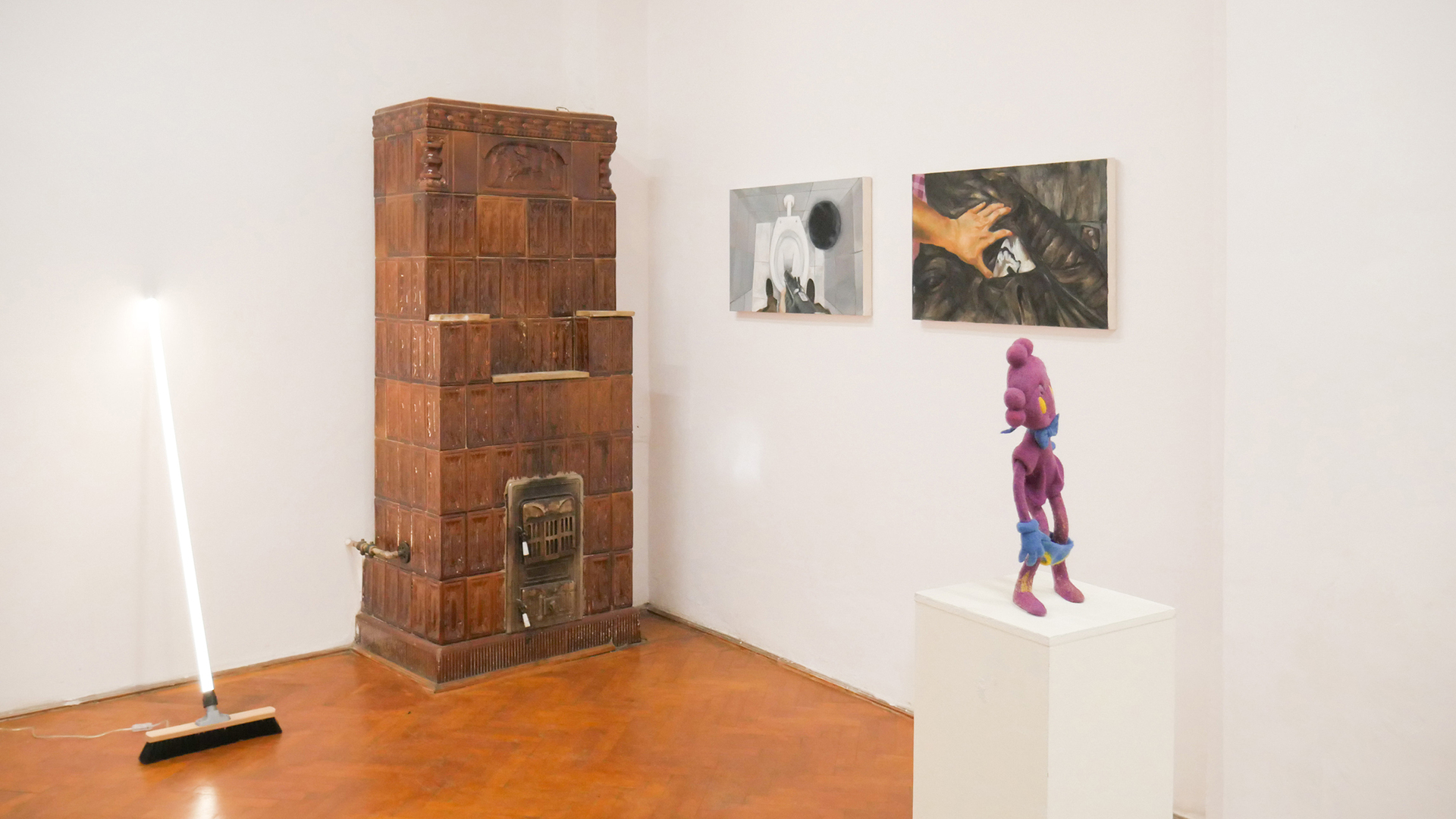 Mara Verhoogt’s installation Lowkey Lovely is creamy, with soft, candy-like colors devouring the ceramics or textiles. The present has tucked up most of the clumsy figures, so the artist is building a joyful sanctuary for them, with a much-magic penciled portrait in the center. Ioana Mincu’s sculptures announce themselves like a bedtime story ritual, following an intimate engagement with the seen and unseen faces, with different versions of everyday encounters and beliefs. Sometimes, stepping out of reality becomes a necessity for facing the everyday life, and Xenia Roth’s artistic practice highlights an intriguing method of juxtaposing the rough daily events with comic-like narratives, melting a childish reverie into mature state of things.