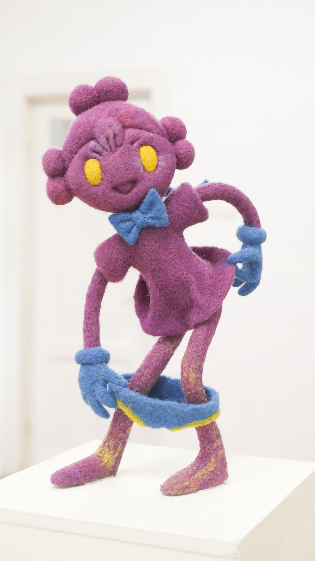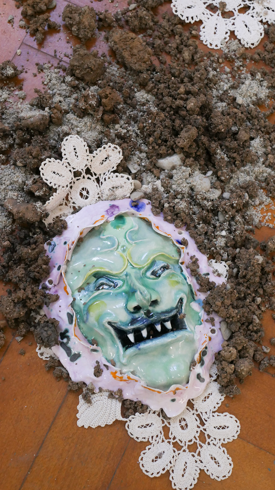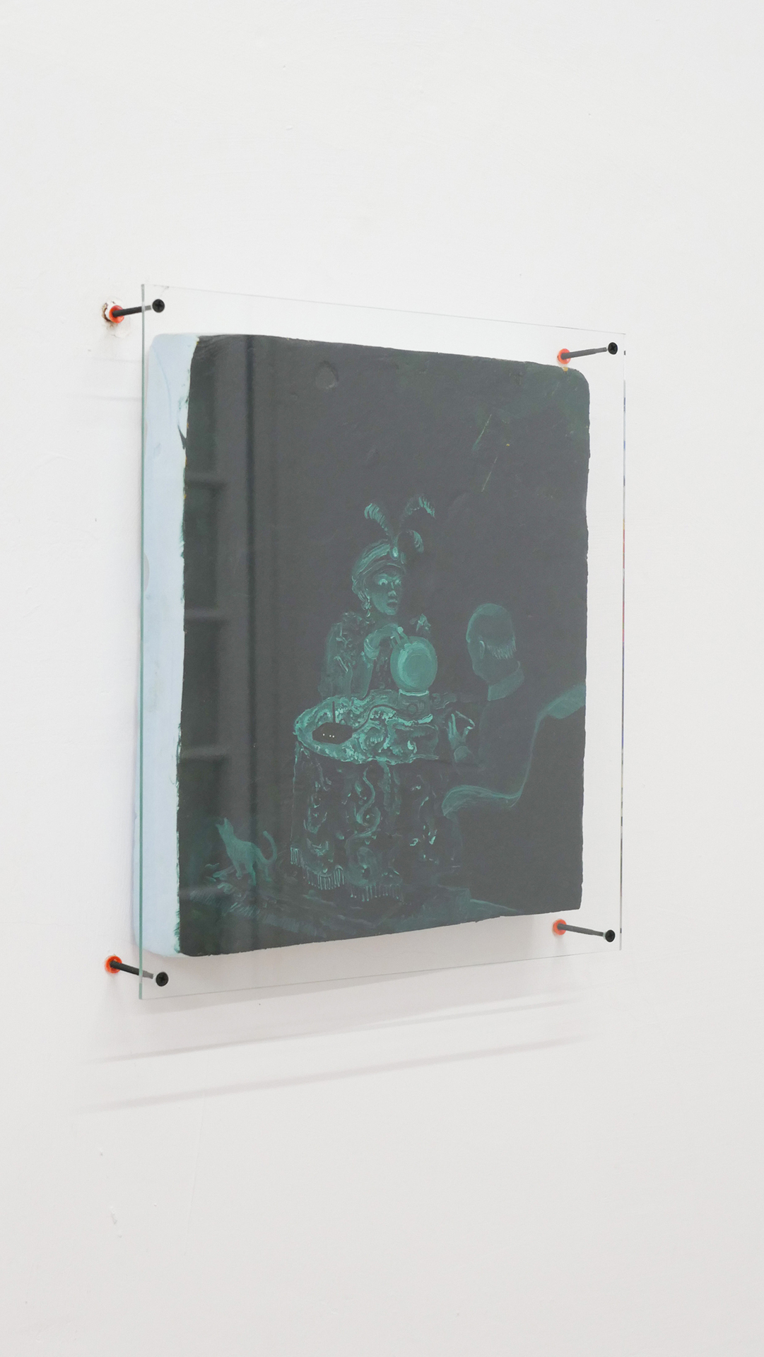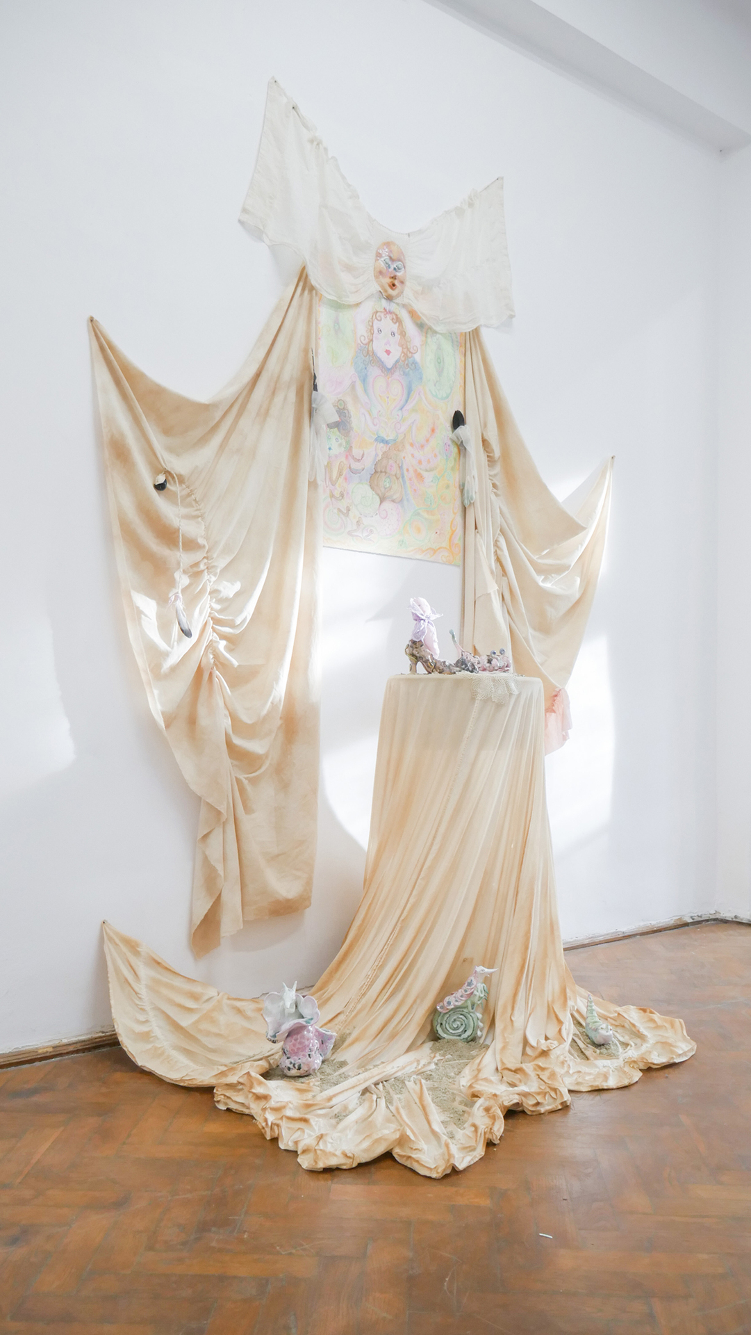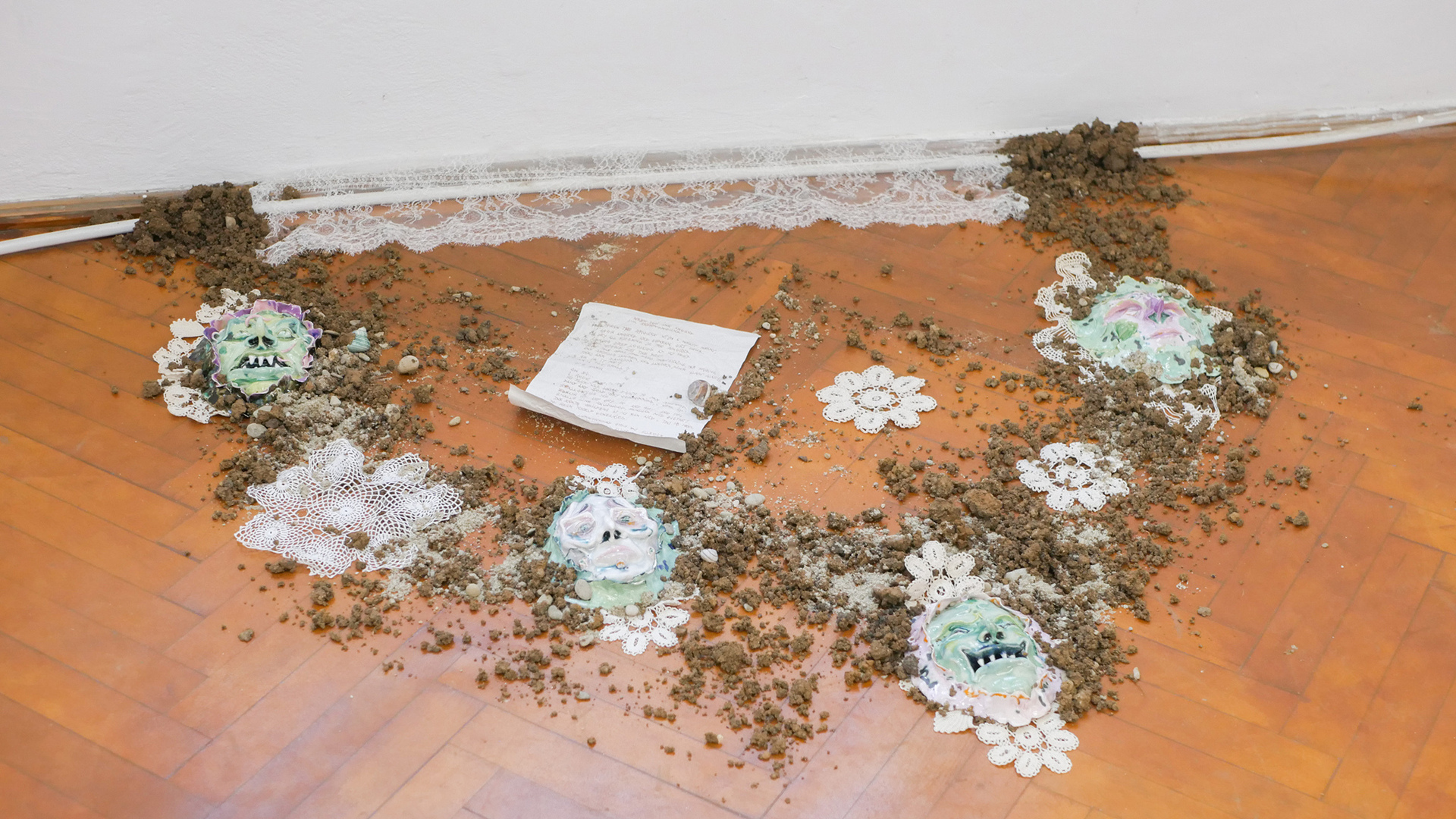 Mara Verhoogt’s installation Lowkey Lovely is creamy, with soft, candy-like colors devouring the ceramics or textiles. The present has tucked up most of the clumsy figures, so the artist is building a joyful sanctuary for them, with a much-magic penciled portrait in the center. Ioana Mincu’s sculptures announce themselves like a bedtime story ritual, following an intimate engagement with the seen and unseen faces, with different versions of everyday encounters and beliefs. Sometimes, stepping out of reality becomes a necessity for facing the everyday life, and Xenia Roth’s artistic practice highlights an intriguing method of juxtaposing the rough daily events with comic-like narratives, melting a childish reverie into mature state of things.