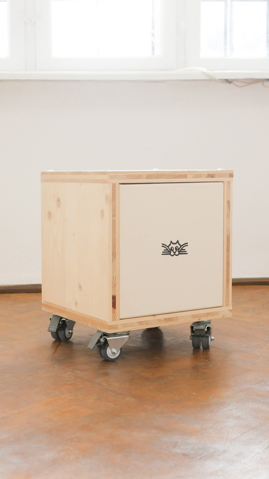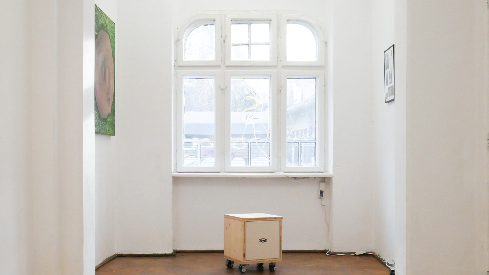 three cat boxes. In view of Christian Schulz’s sculptures, we witness a re-signification of storage boxes on wheels that he encounters on a daily basis working at Migros supermarket, indicating a symbolic twinning between labor and art.