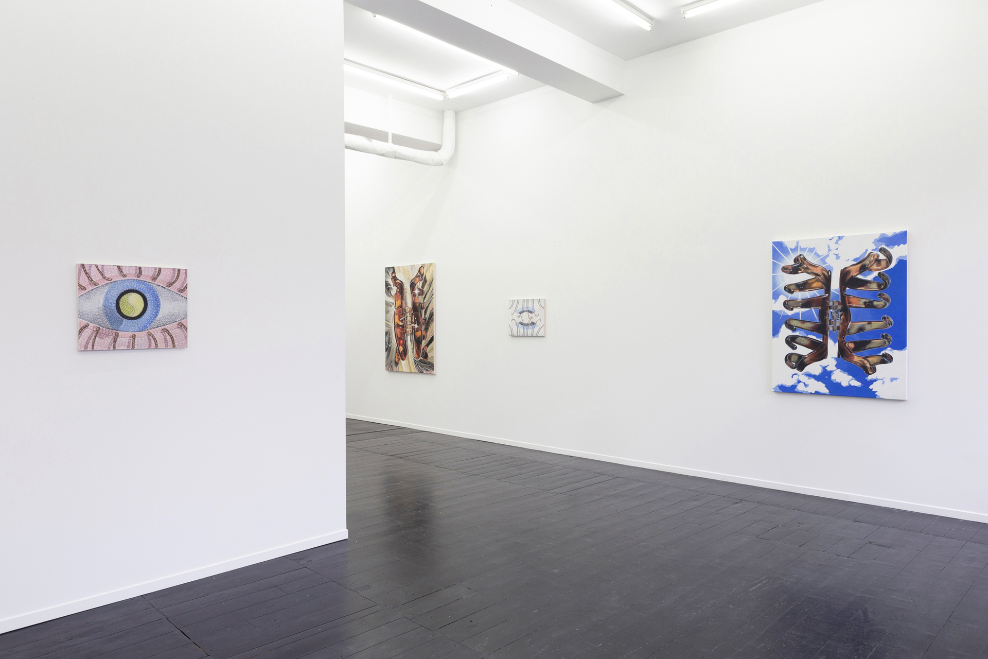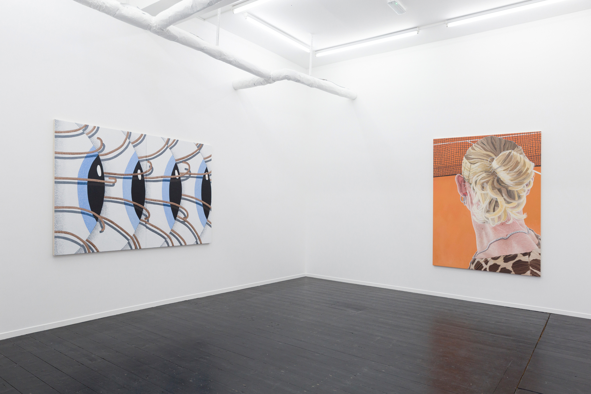 Eyes multiply around the gallery, their gazes scanning, clocking points scored. Looking is made an example of, blue eyes layer on top of each other or face off against the tennis balls. We track these eyes as they move across the paintings that surround them, over the courts and the backs of heads. It is this surveillance that we are invited into, while also realising it is that very action in which we are participating.
