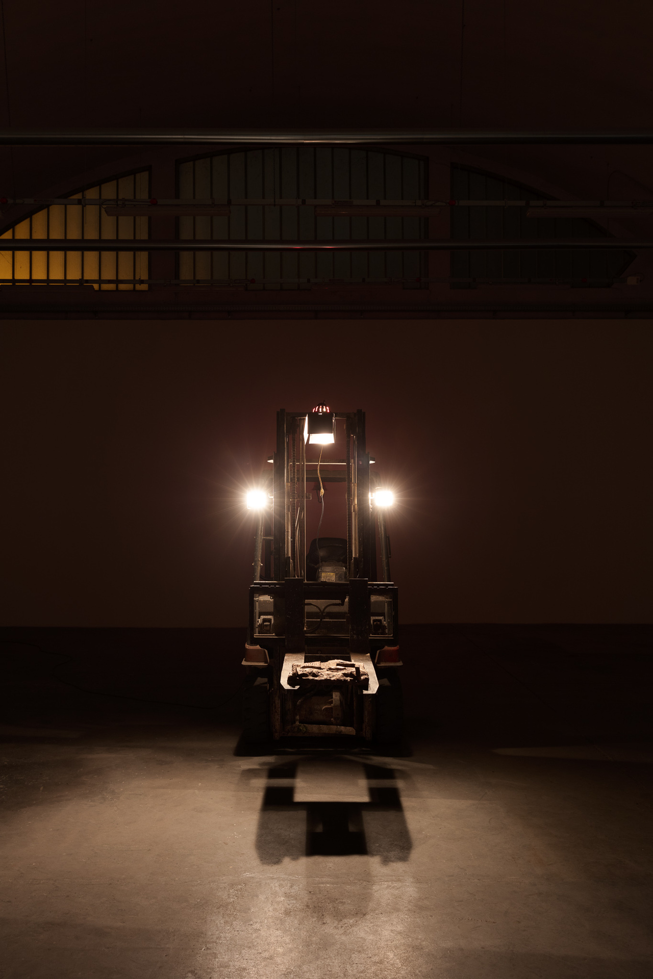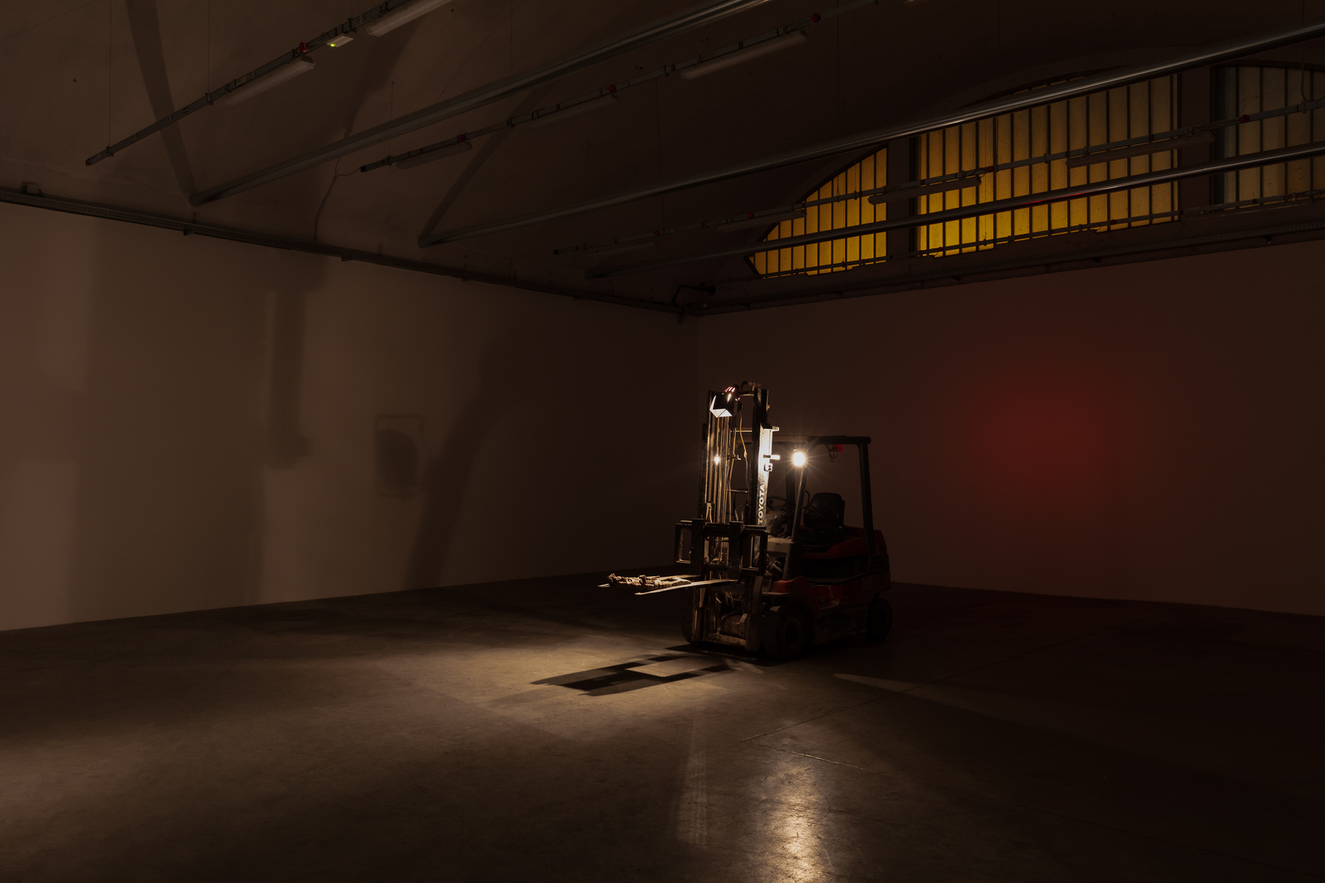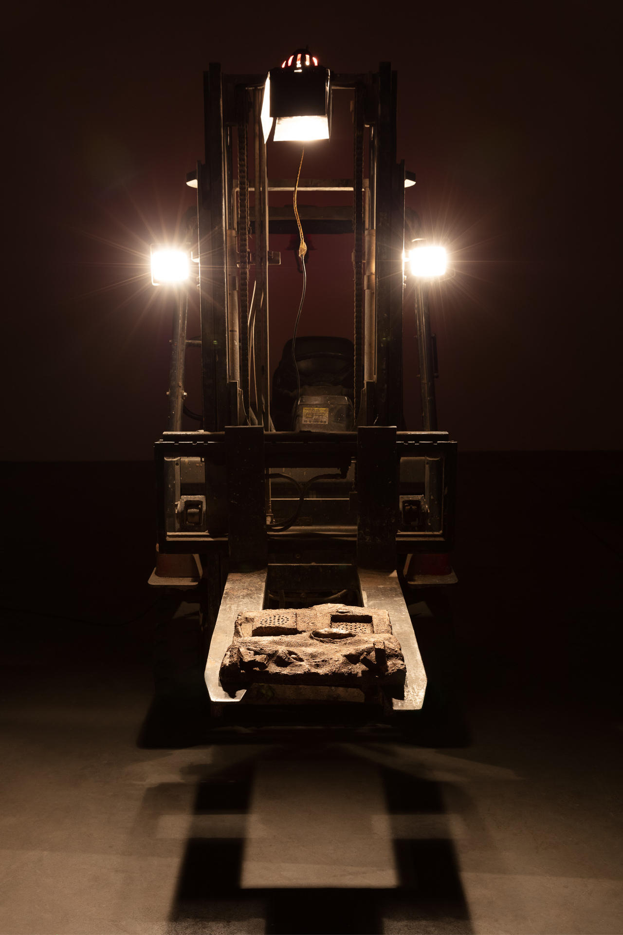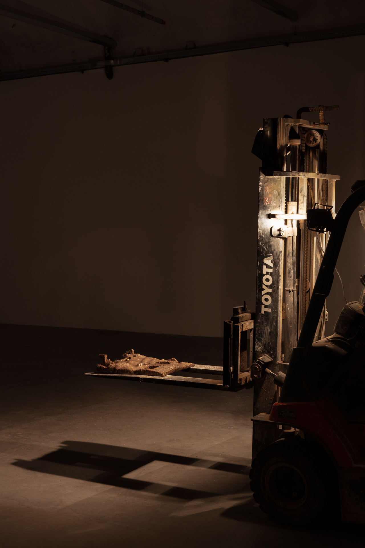 A bulky opalescent object laying still in front of disoriented eyes. It recalls a shield, a piece of a sandstone or a rare type of bronze gong. One may feel an unbearable nerve of awaiting the action of somebody who would know how and when to use it. The permanent temporariness of our times does not appreciate such forgotten powers.