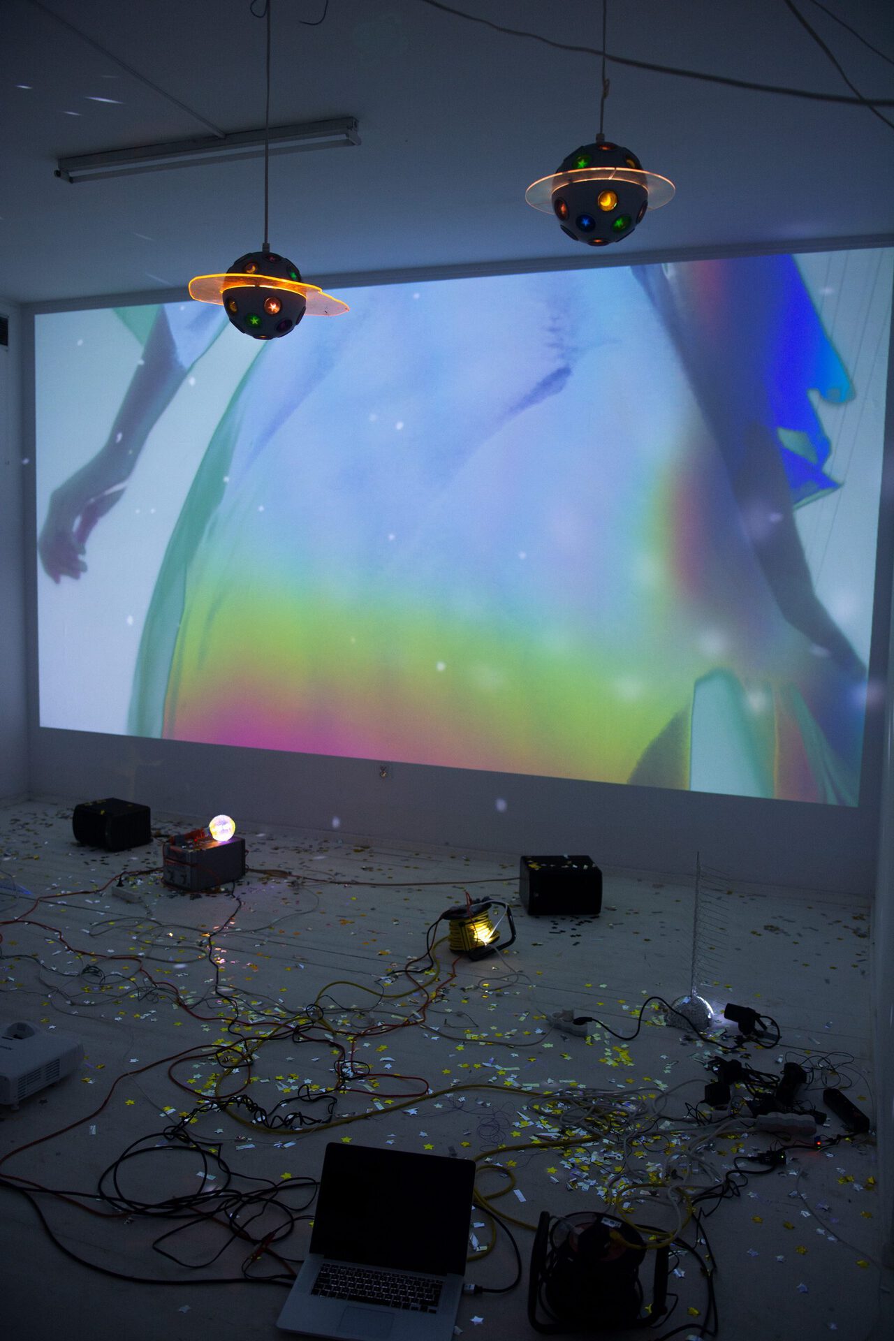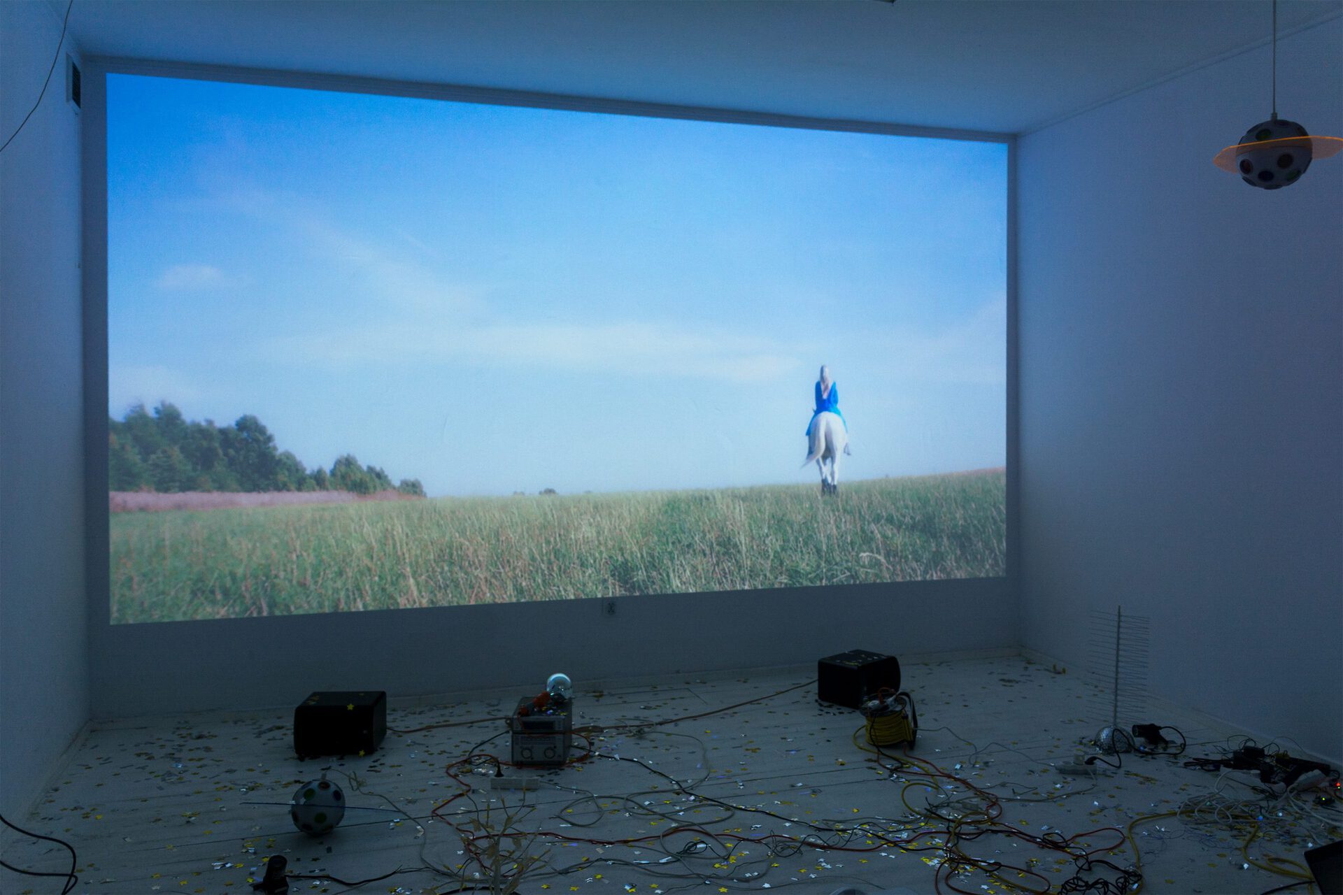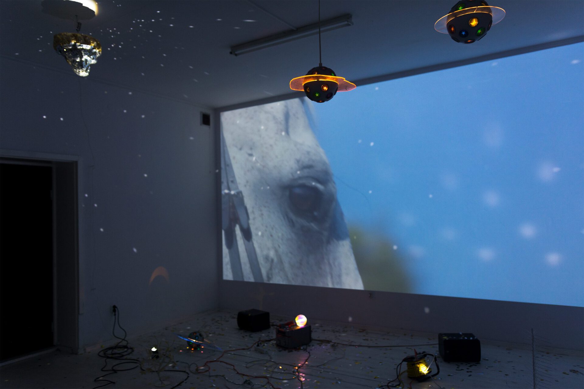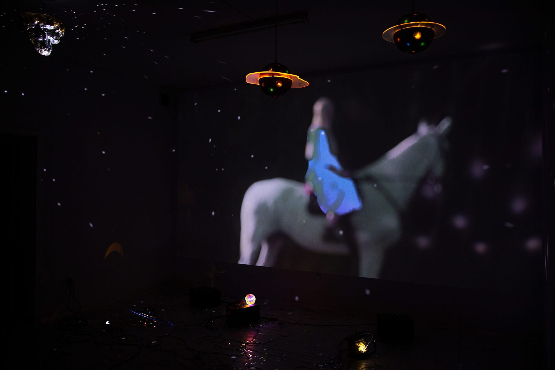 The gallery space is a two-room apartment from the early 20th century. In one of the rooms I project a video of a semi-absurd dream. The projection takes up the entire wall, looking through the windows from outside it seems to be a passage to another dimension. The video is accompanied by a mix of songs from the 90s processed in post-production. The climax of the video is a progressively louder fragment of the song All by myself combined with a randomly edited image of a girl galloping on a horse. The girl's dress flashes changing colors, the lights in the room blink reacting to the high notes in the song throwing sparkles to illuminate the room and towards the end the lamps begin to move with the spinning dress. After 9 minutes, the song quiets down, the video and lamps turn off, the room lights up.Text