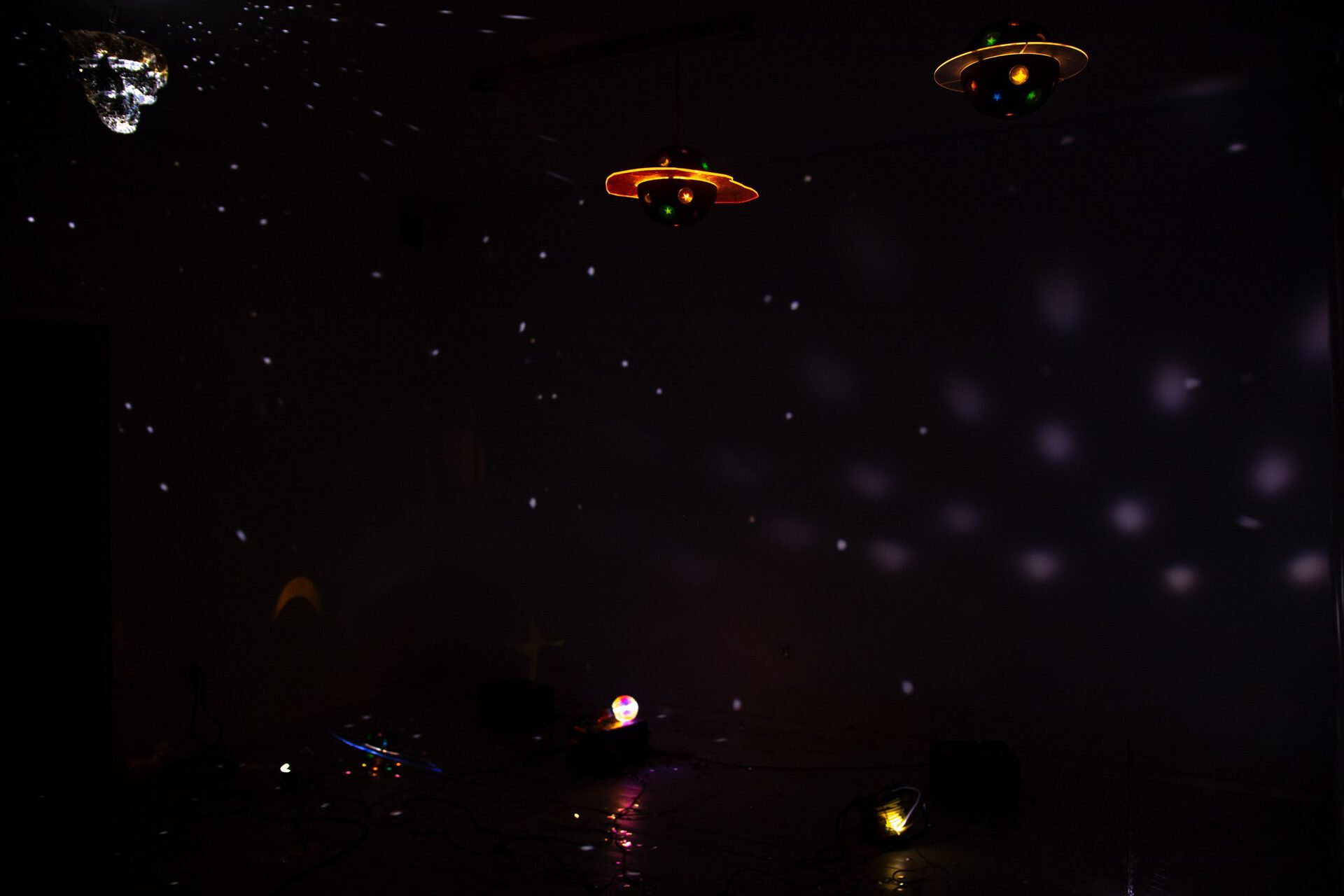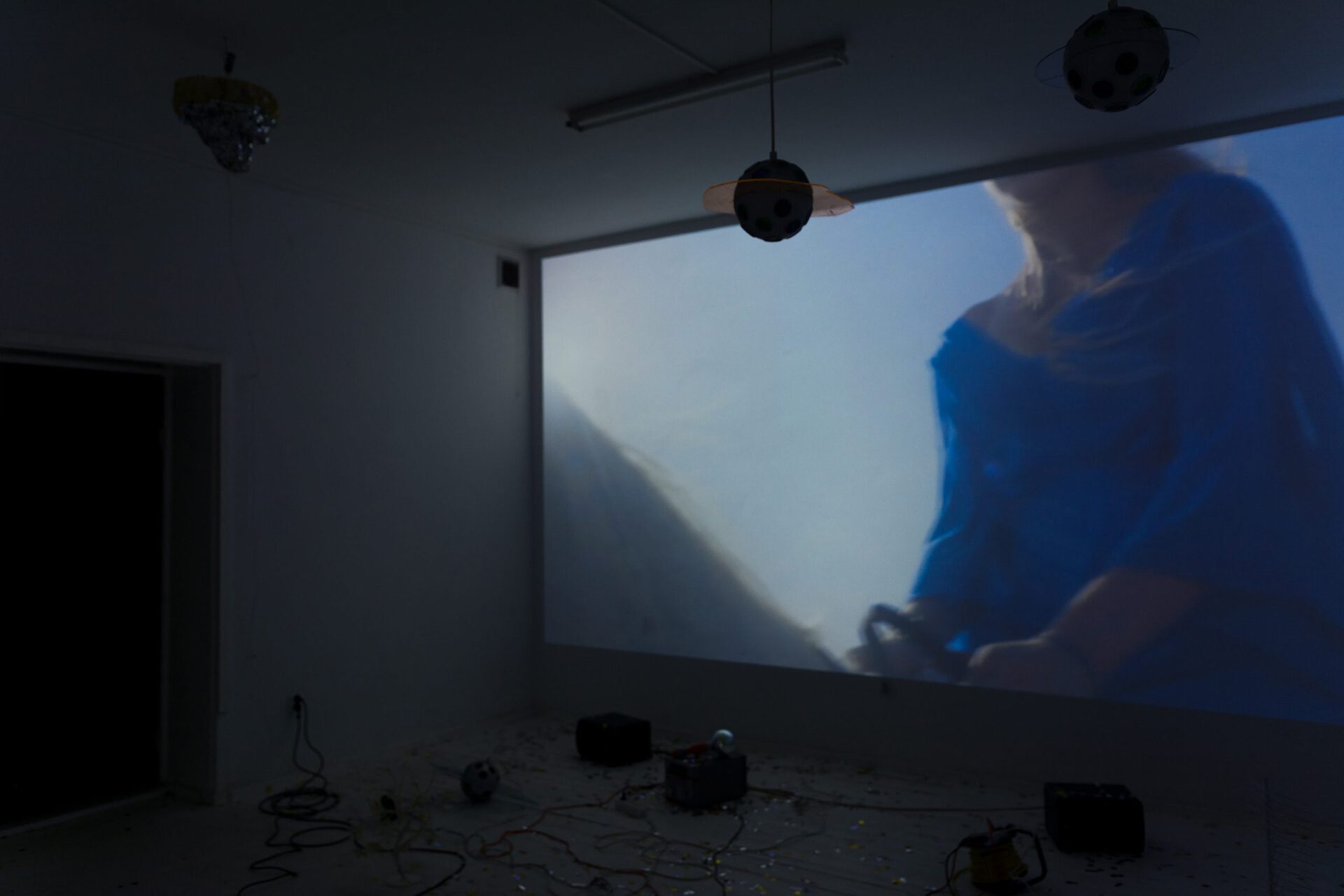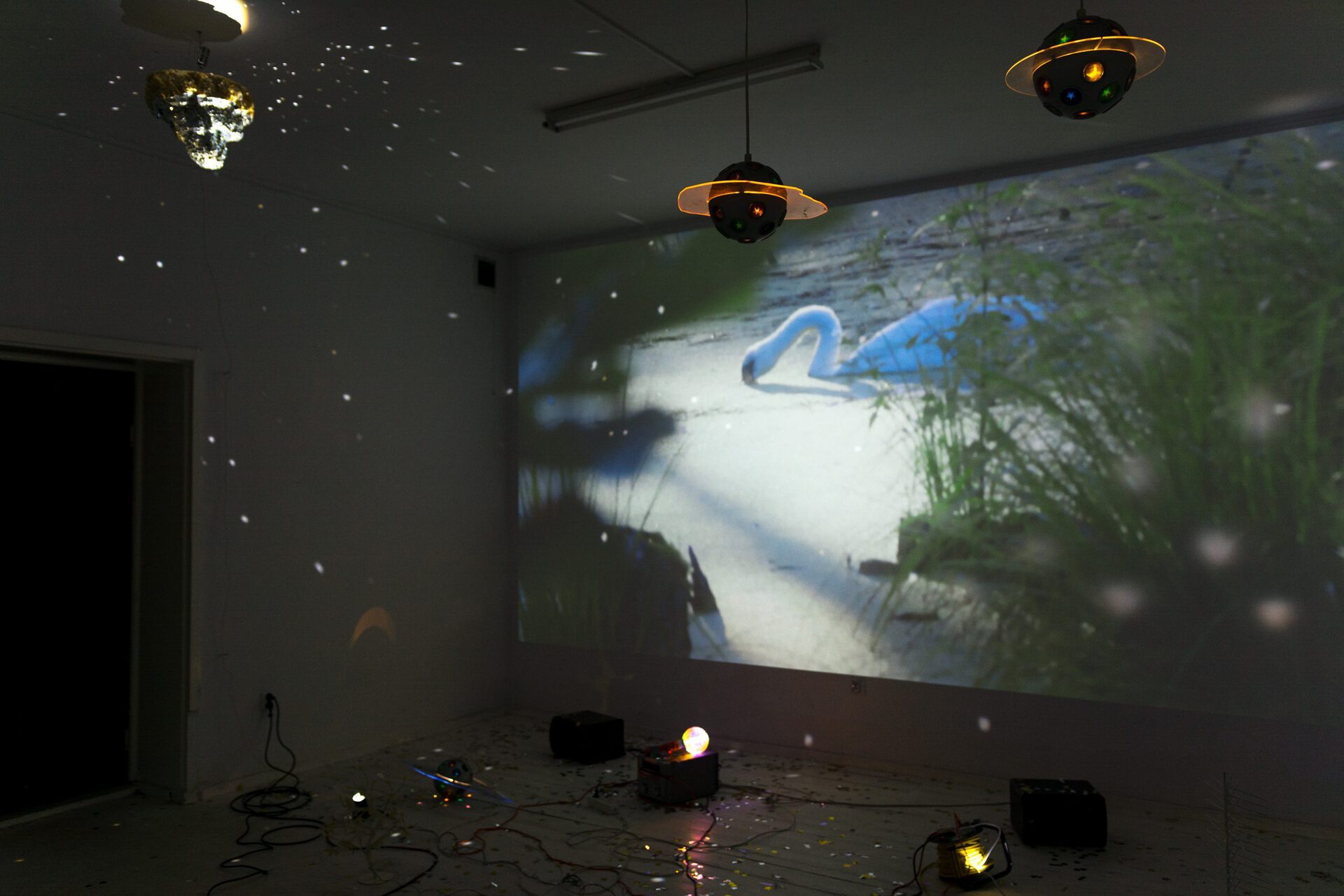 The gallery space is a two-room apartment from the early 20th century. In one of the rooms I project a video of a semi-absurd dream. The projection takes up the entire wall, looking through the windows from outside it seems to be a passage to another dimension. The video is accompanied by a mix of songs from the 90s processed in post-production. The climax of the video is a progressively louder fragment of the song All by myself combined with a randomly edited image of a girl galloping on a horse. The girl's dress flashes changing colors, the lights in the room blink reacting to the high notes in the song throwing sparkles to illuminate the room and towards the end the lamps begin to move with the spinning dress. After 9 minutes, the song quiets down, the video and lamps turn off, the room lights up.Text