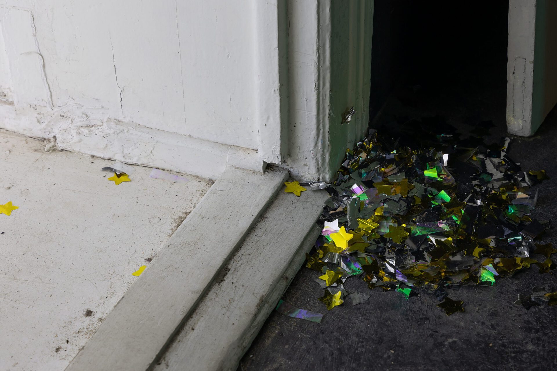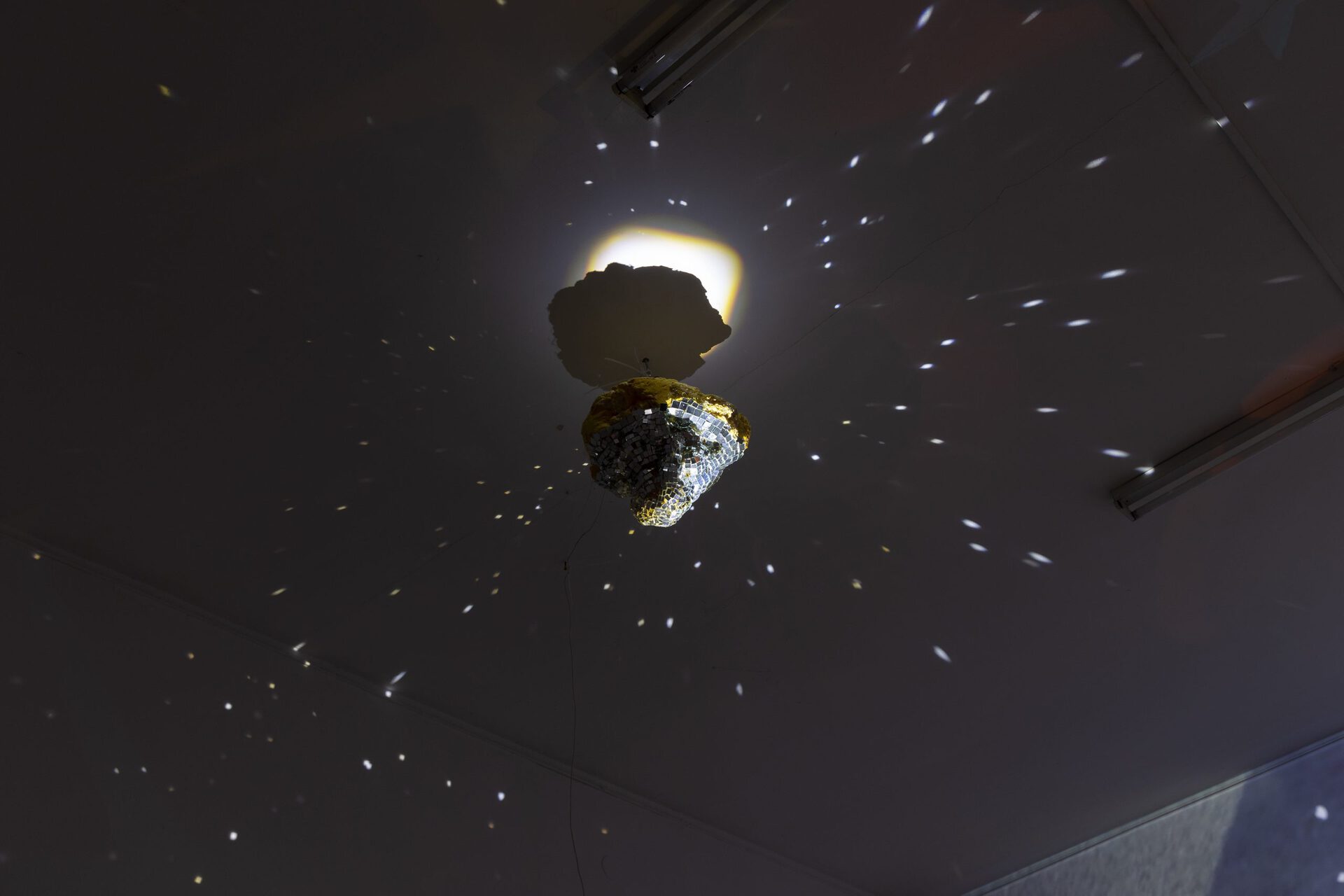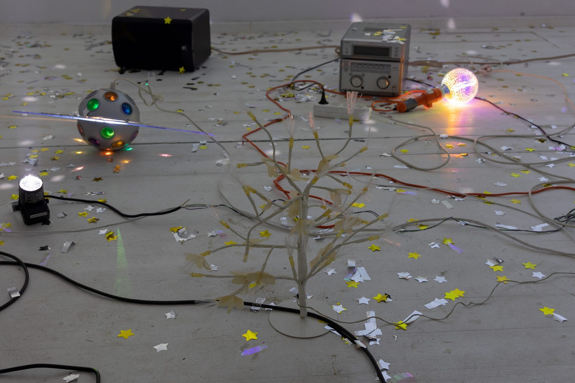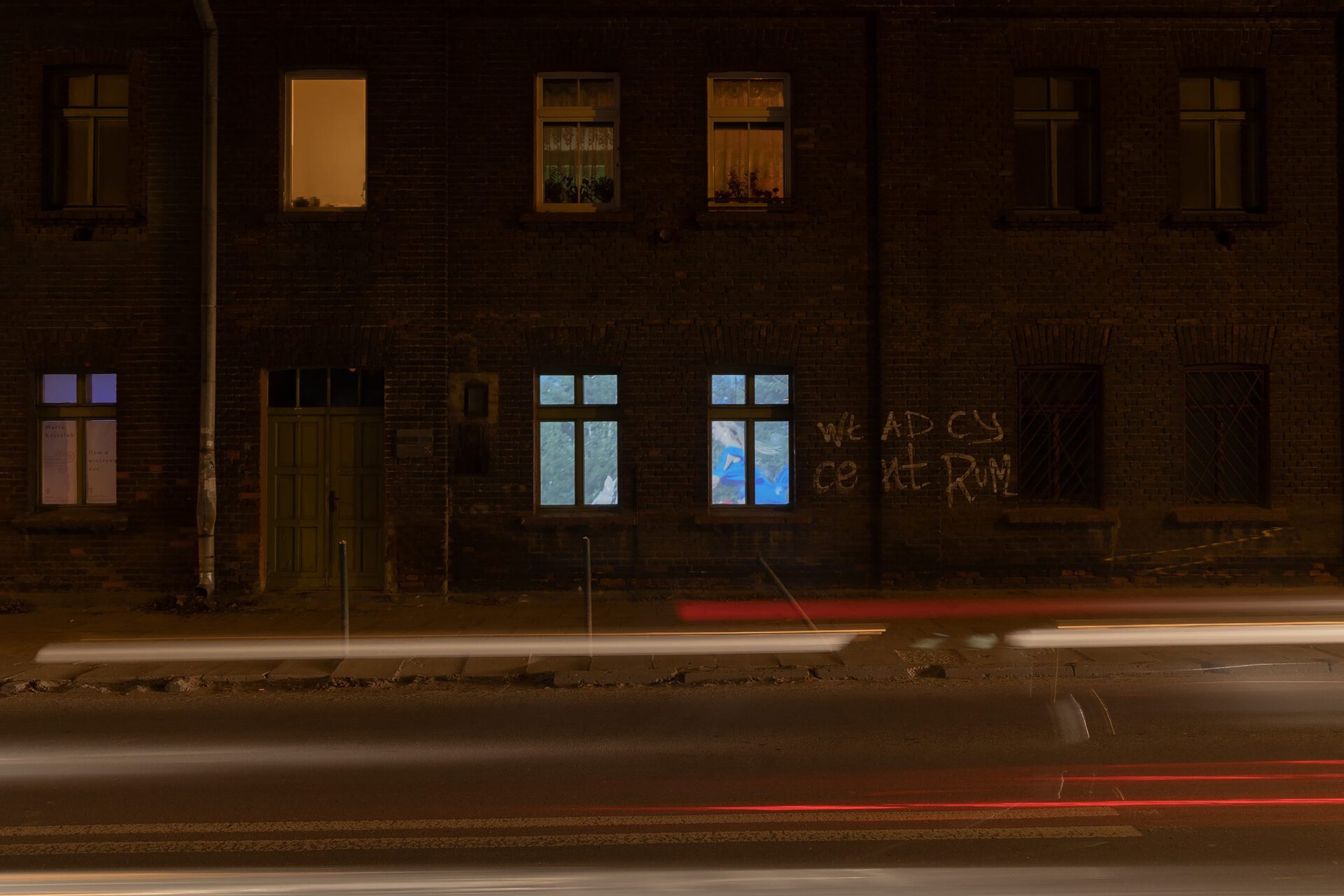 The gallery space is a two-room apartment from the early 20th century. In one of the rooms I project a video of a semi-absurd dream. The projection takes up the entire wall, looking through the windows from outside it seems to be a passage to another dimension. The video is accompanied by a mix of songs from the 90s processed in post-production. The climax of the video is a progressively louder fragment of the song All by myself combined with a randomly edited image of a girl galloping on a horse. The girl's dress flashes changing colors, the lights in the room blink reacting to the high notes in the song throwing sparkles to illuminate the room and towards the end the lamps begin to move with the spinning dress. After 9 minutes, the song quiets down, the video and lamps turn off, the room lights up.Text