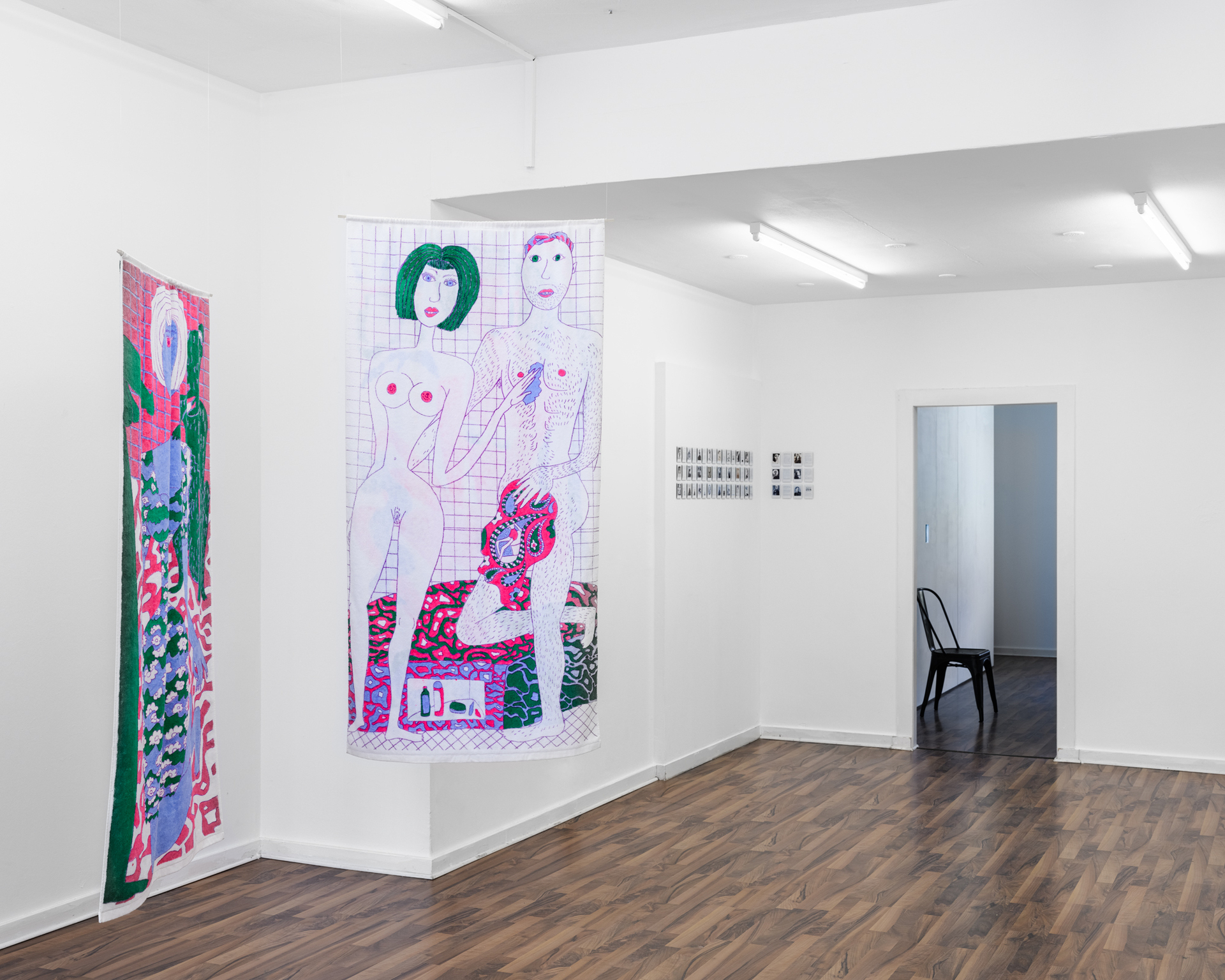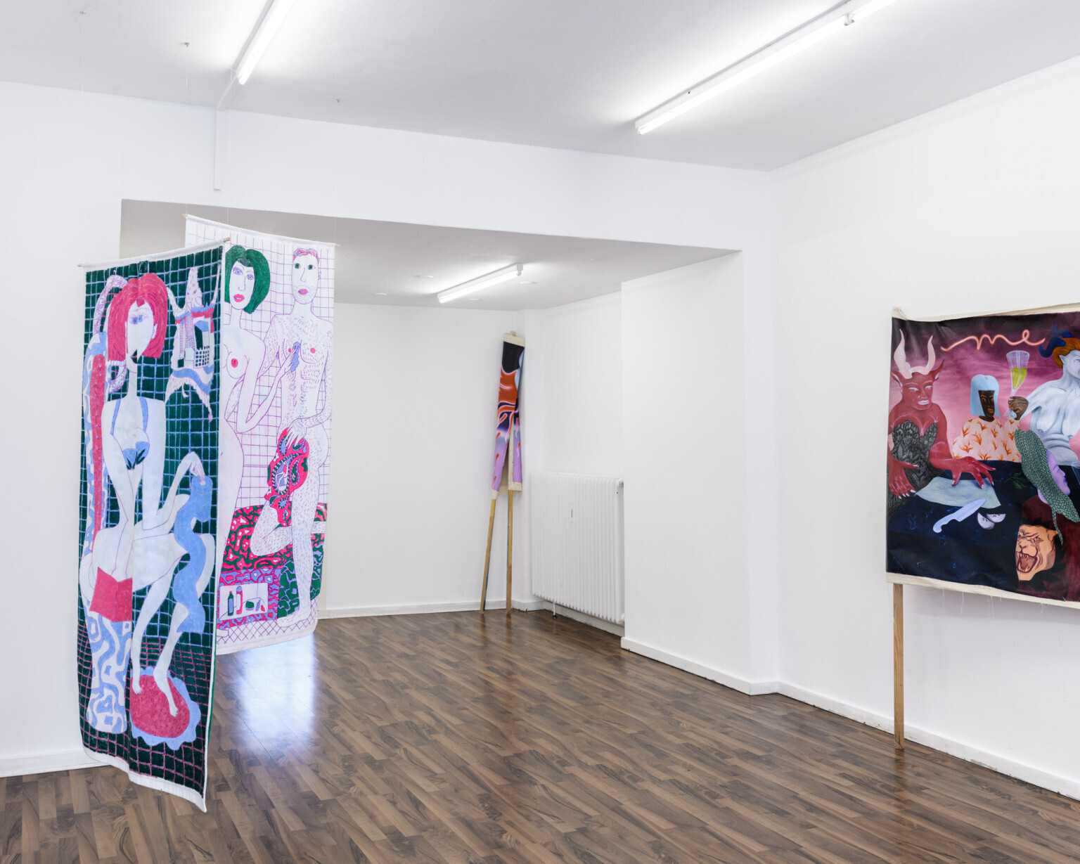 Magdalena Kita, Californication, 2015, Silkscreen print on beach towel, each 180 x 90 cm; Marleen Rothaus, Coven, 2020, Oil on canvas, 130 x 280 cm | Installation view BEUYS & GIRLS | Courtesy Curated Affairs x Nails projectroom | © Kai Werner Schmidt, Düsseldorf 2021[/caption]