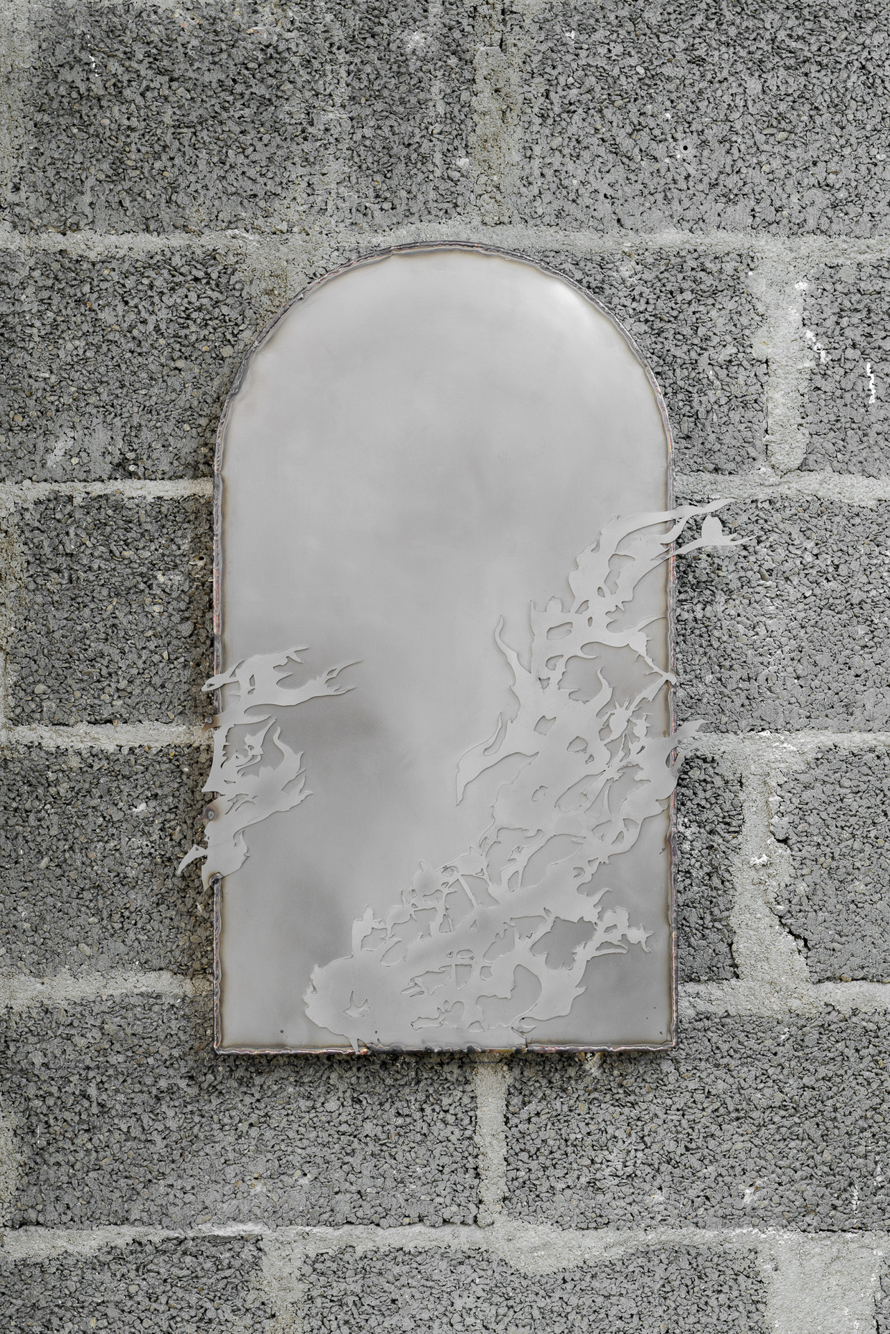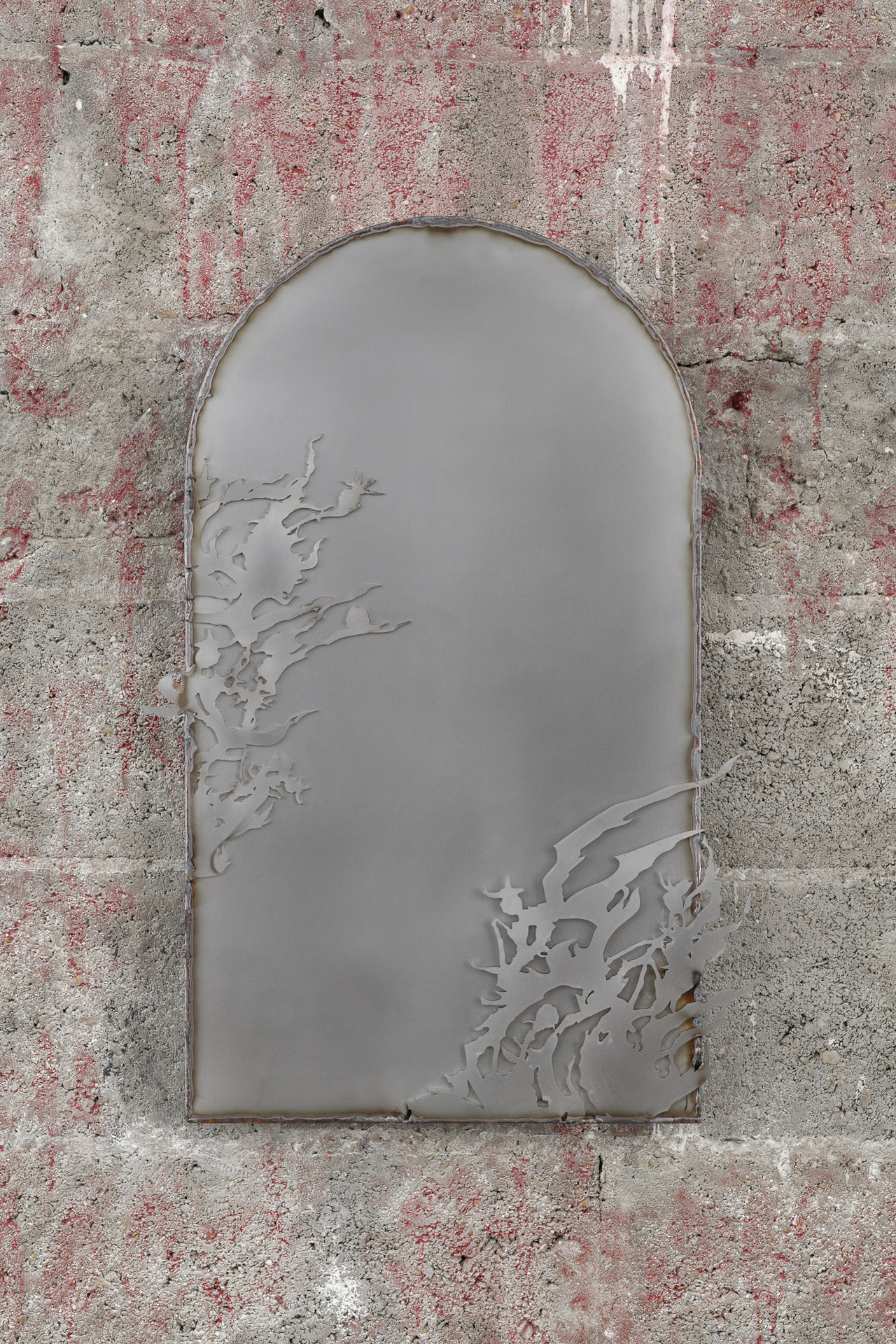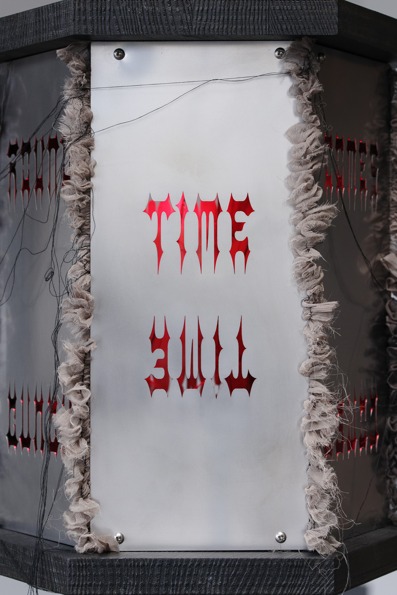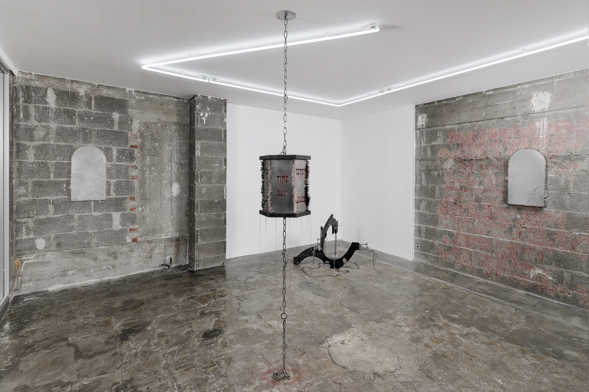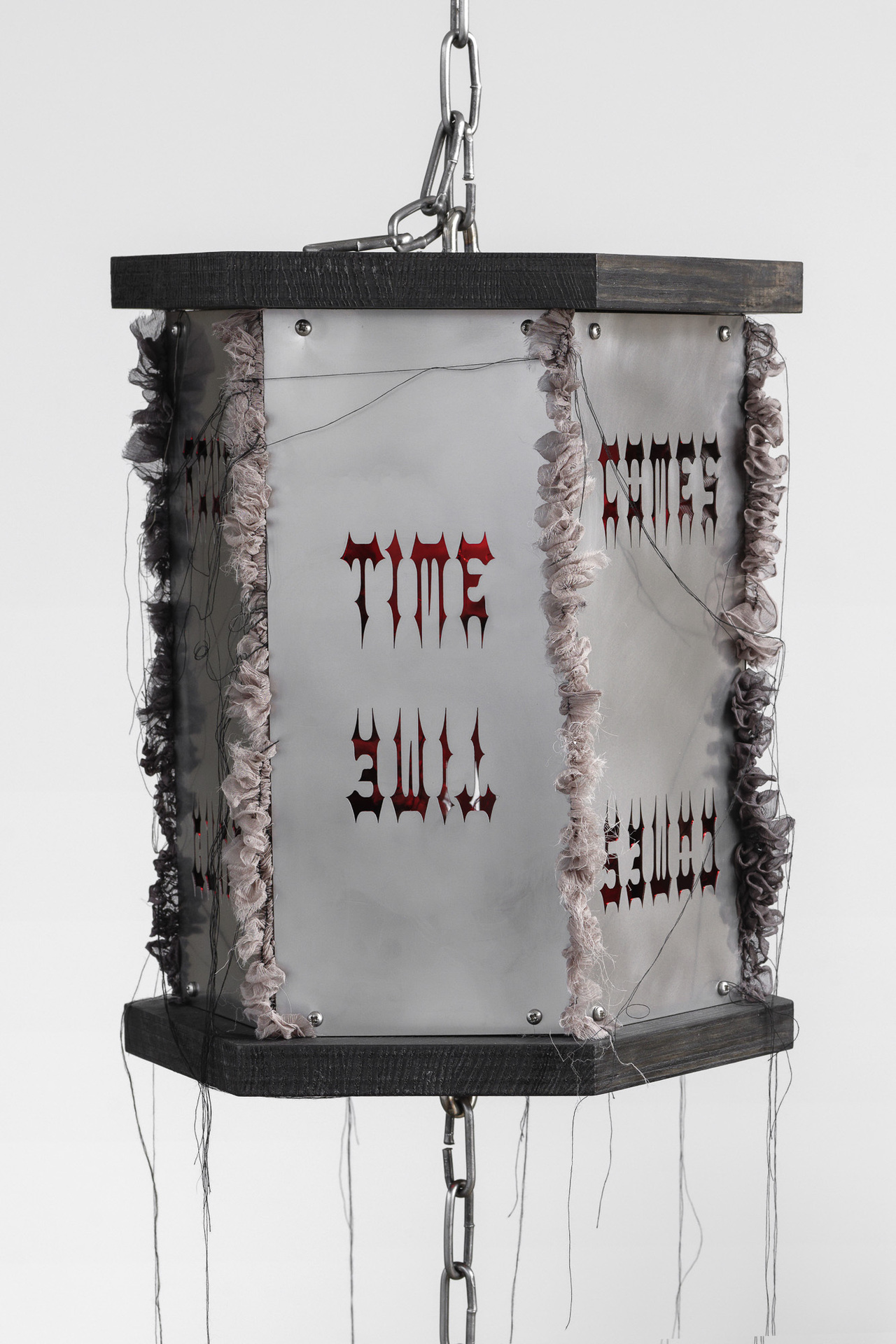 The question of the cycle, of a temporality constantly renewed — and not linear, as we tend to think of it — is addressed through Kerosene, a hexagonal lantern suspended from the ceiling At nightfall, the work illuminates, diffusing onto the walls the inscription "Time comes round". A twilight hue drapes the gallery, transforming it into a playground for zombies. The silhouette of Mirror in Flames evokes that of funerary tombs from which the dead would emerge. A figure of morbid reminiscence, the zombie returns from a previous era to attack the living. It is also the allegory of the consumer — as embodied in Jim Jarmusch's film, The Dead Don't Die (2019) —, of the enslaved worker or the spectator/user under the sway of media/technology, as Marshall McLuhan analyzed in 1969: "It is not an easy period in which to live, especially for the television-conditioned young who, unlike their literate elders, cannot take refuge in the zombie trance of Narcissus narcosis that numbs the state of psychic shock induced by the impact of the new media."