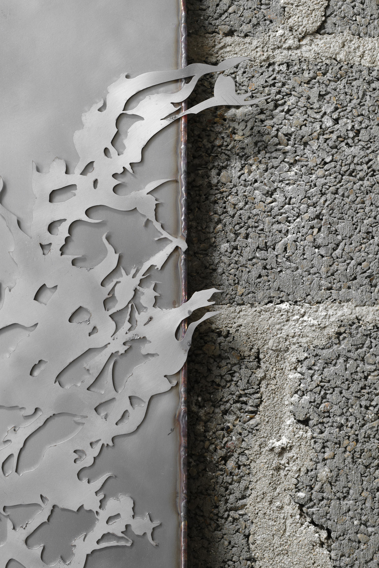 Anna Tsing dedicated an essay (The mushroom of the end of the world. On the Possibilities of Living in the Ruins of Capitalism, 2015) to the global supply chains of matsutake, a wild mushroom that thrives in zones of ecological destruction. In it, she tells stories of renewal that overlap with those of decline. In the work of Inside Job, we observe a motif of thorny stems specific to the thistle. A plant known for its tenacity, it too takes root in these destroyed landscapes, where almost nothing remains. The metallic, hostile, sharp ornaments are marked by a gothic style. Renaissance of the Medieval, the Gothic crystallizes the way in which the rationality of the Enlightenment can capsize in human servitude. The vegetal adornments thus contaminate the rooms, not unlike in Hubert Robert’s paintings of ruins where vegetation proliferates, serving as a symbol of resurrection, of the cycle of life that never runs out.