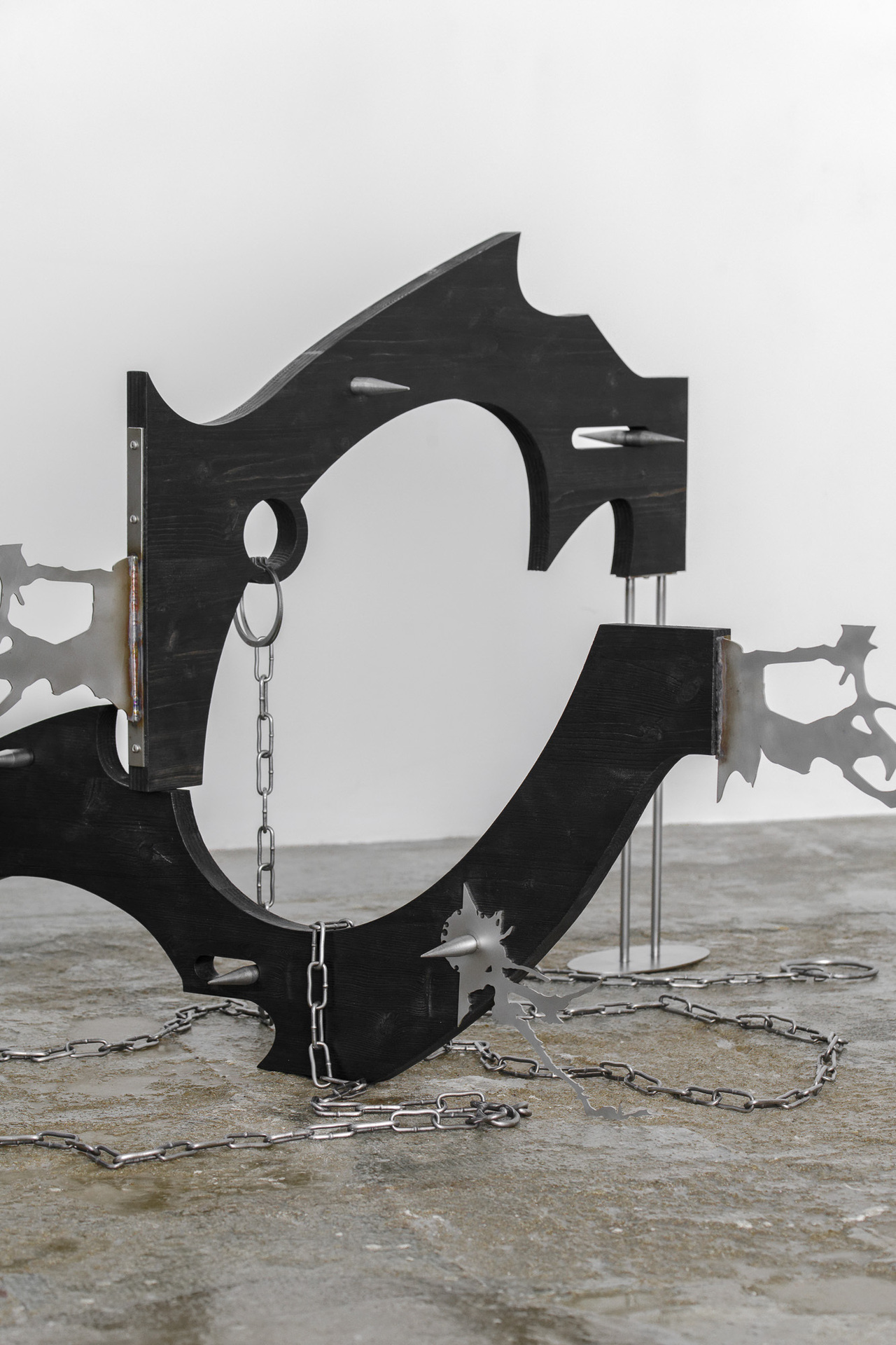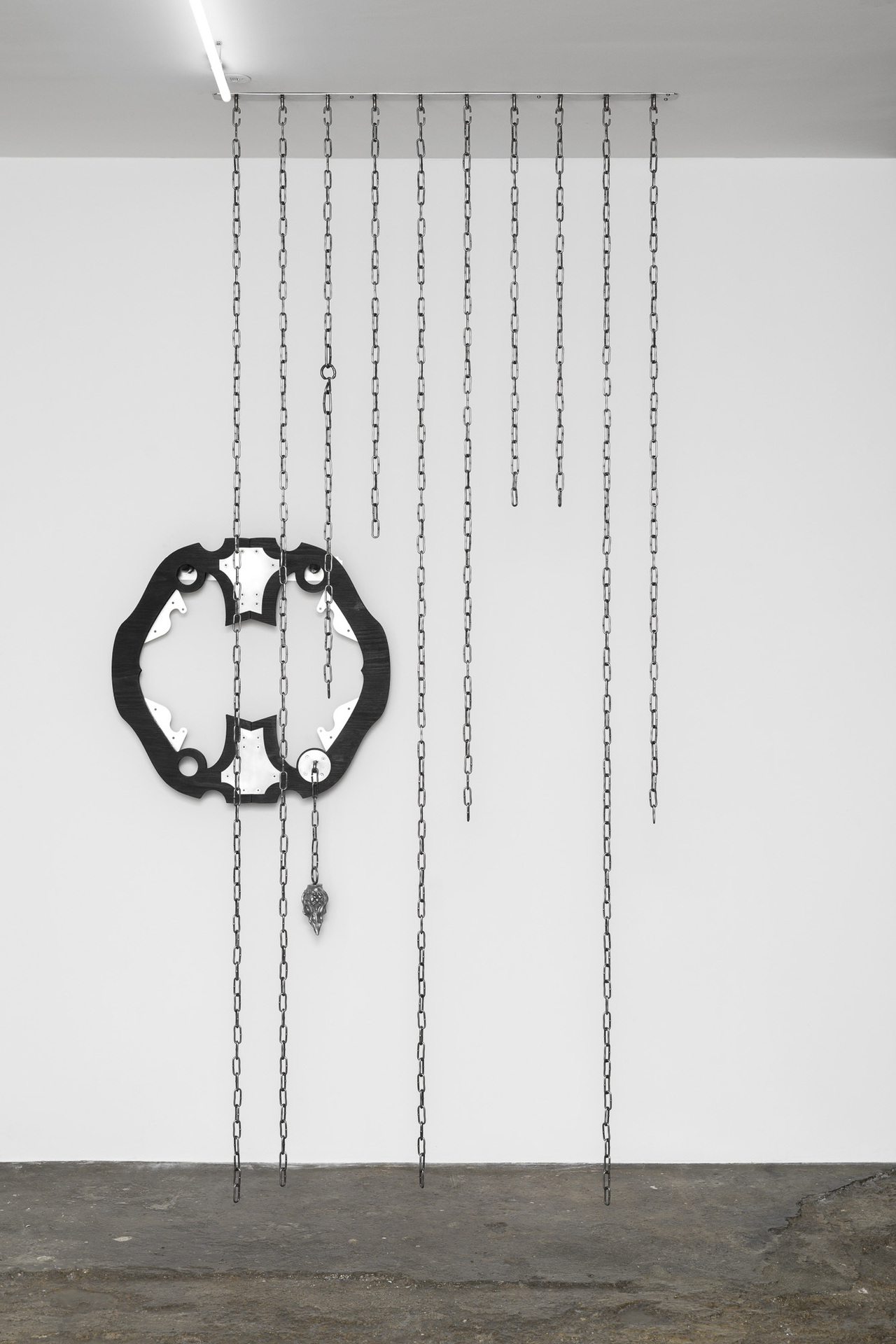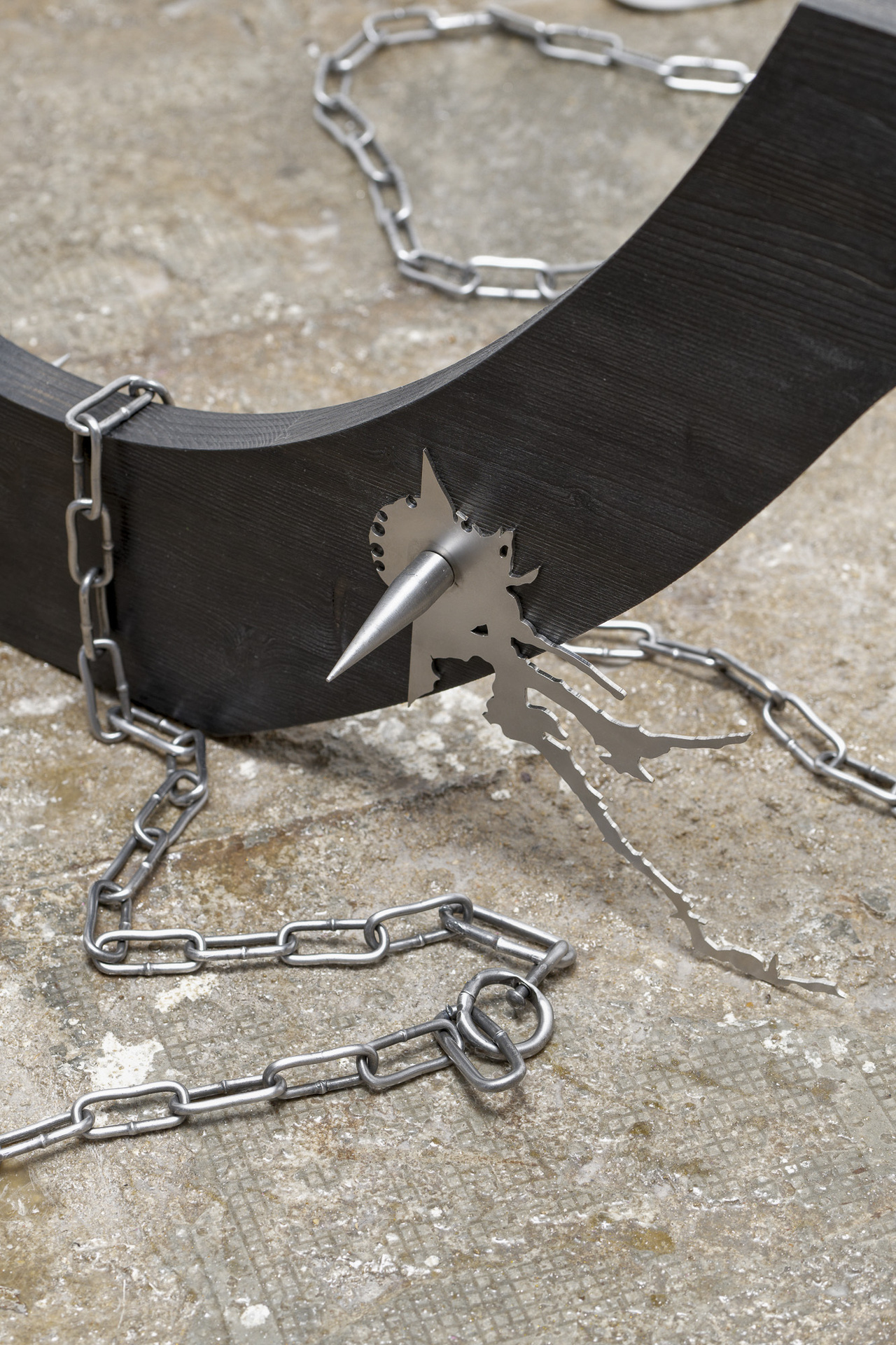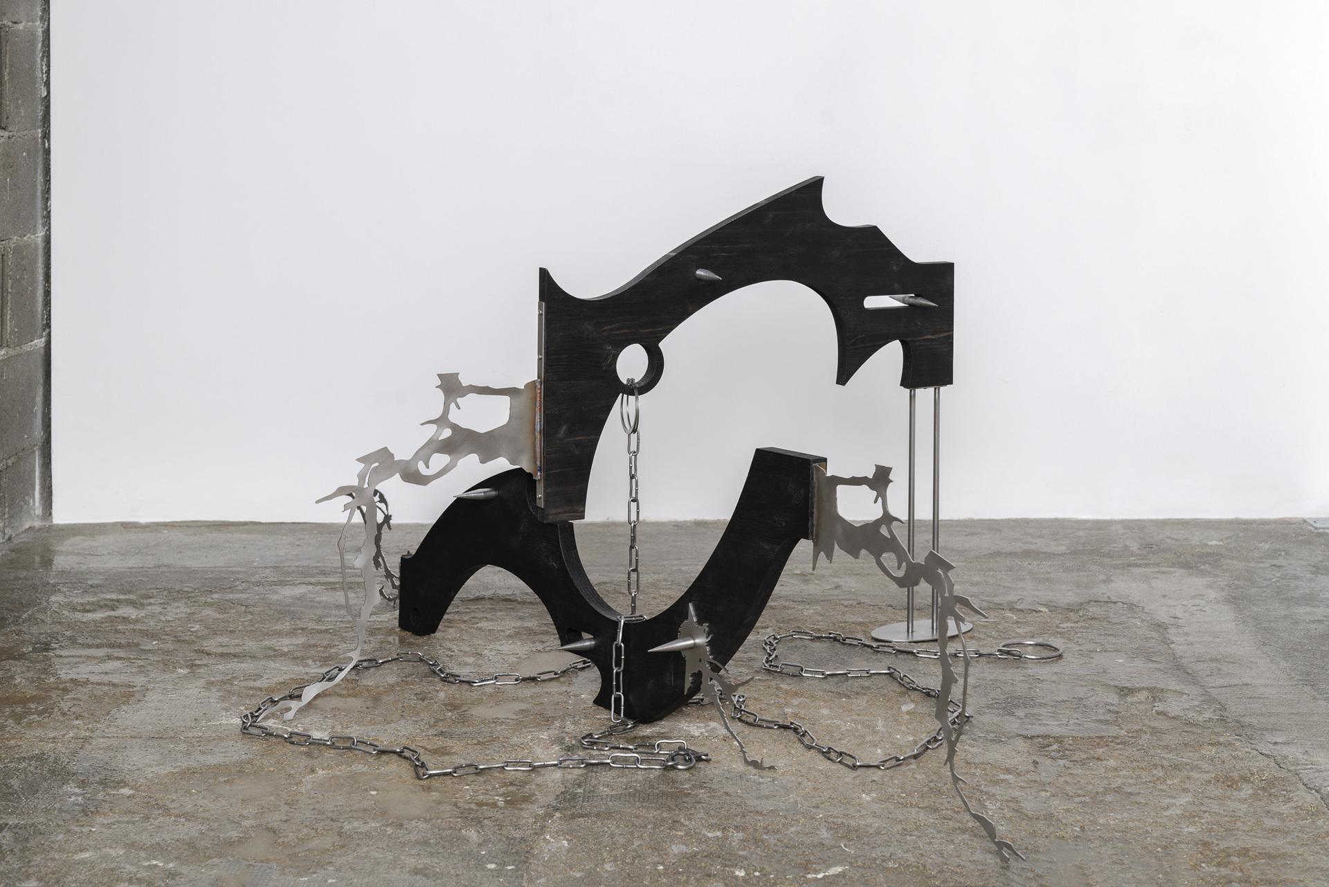 Thus, everything that populates the space seems to come from an era that is or will soon be over: first that of Fordism, followed by a post-Fordism, globalized. The works resemble spare parts or mechanical instruments straight out of factories. Cables, curtains of chains and industrial materials refer to the pictorial field of the machine — an alienating machine, increasing the rate, the demands, the cycles of production and consumption. On the ground lies The Serpent, an charcoal-colored sculpture with menacing forms — sharpened, merciless, spikes protruding —, it could very well be mistaken for a trap, a vice ready to close in on a captive member. But the body, if it is summoned, shines by its absence. Mirror in Flames, for example, does not reflect the visitor. One can simply detect a few delicate nuances and flickers of light, its metal polished down to a matte and satin finish. The artifacts testify above all to a lost humanity, engulfed in the ruins of capitalism.