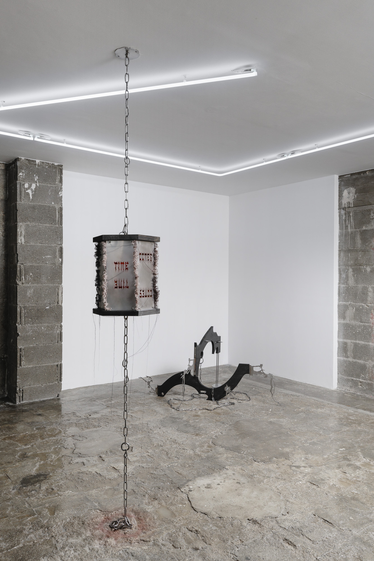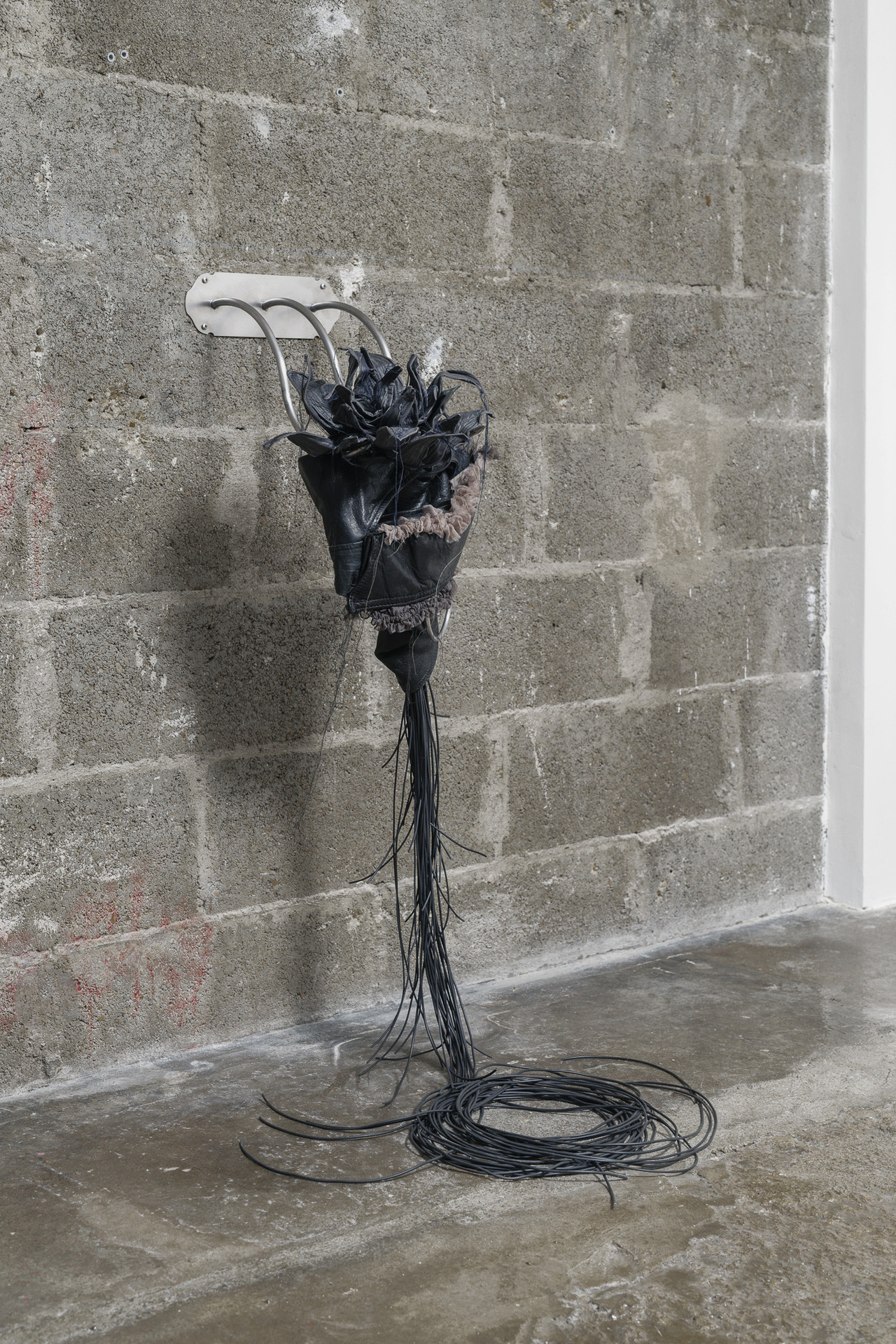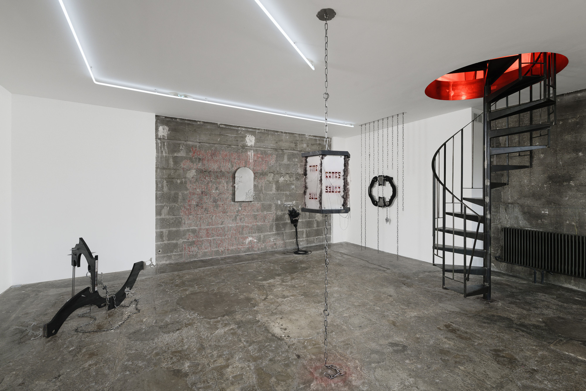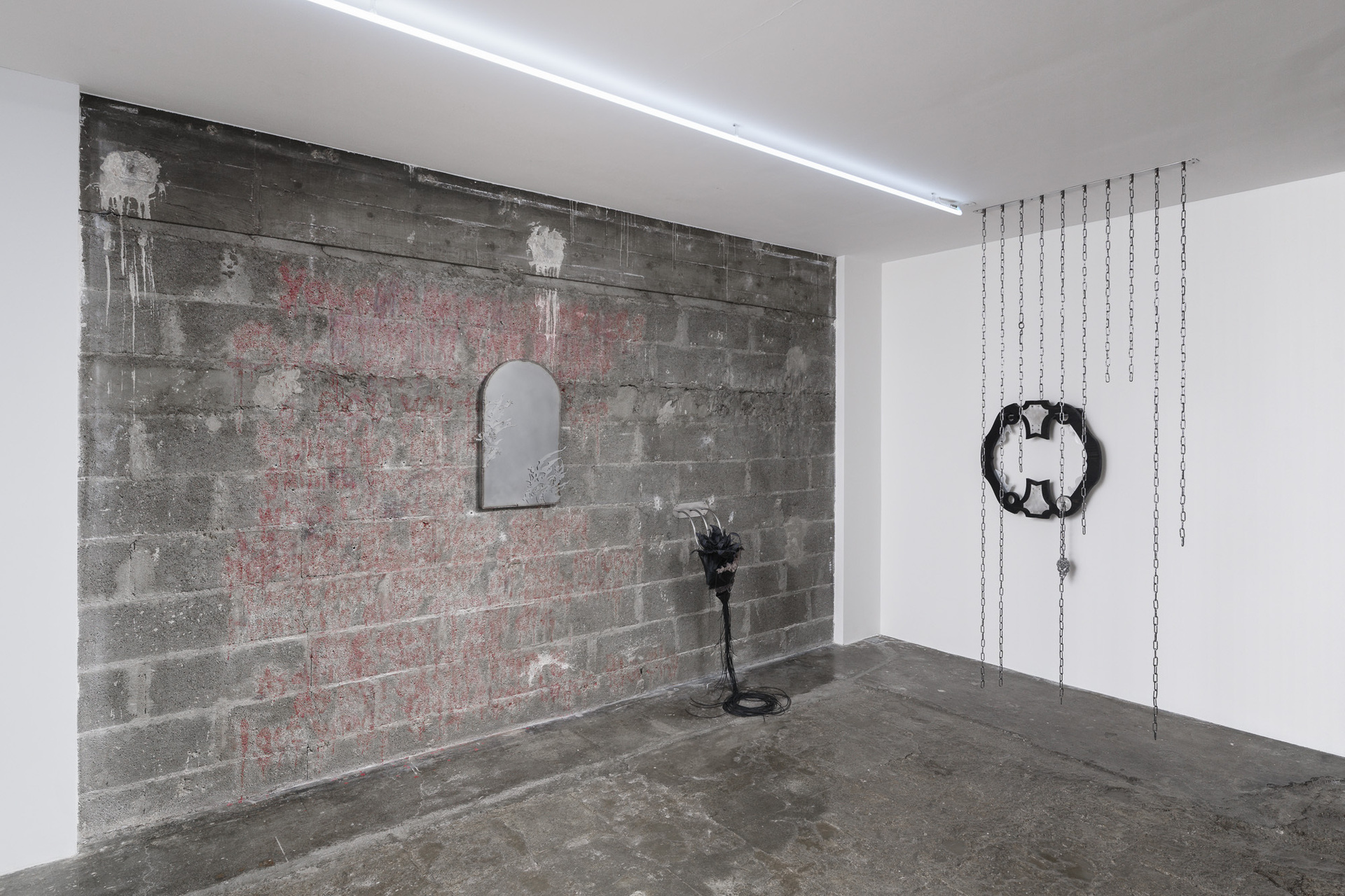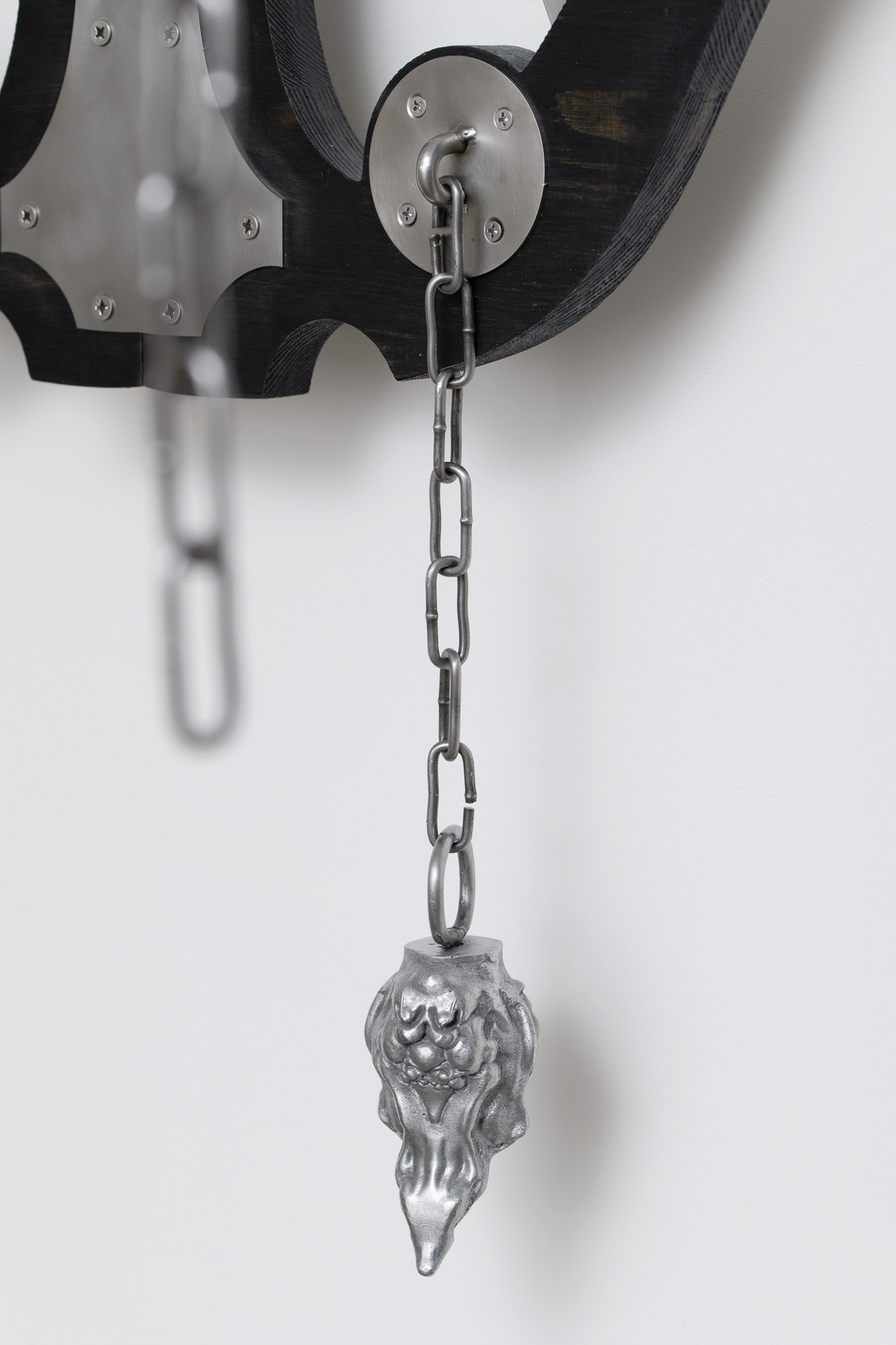 Thus, everything that populates the space seems to come from an era that is or will soon be over: first that of Fordism, followed by a post-Fordism, globalized. The works resemble spare parts or mechanical instruments straight out of factories. Cables, curtains of chains and industrial materials refer to the pictorial field of the machine — an alienating machine, increasing the rate, the demands, the cycles of production and consumption. On the ground lies The Serpent, an charcoal-colored sculpture with menacing forms — sharpened, merciless, spikes protruding —, it could very well be mistaken for a trap, a vice ready to close in on a captive member. But the body, if it is summoned, shines by its absence. Mirror in Flames, for example, does not reflect the visitor. One can simply detect a few delicate nuances and flickers of light, its metal polished down to a matte and satin finish. The artifacts testify above all to a lost humanity, engulfed in the ruins of capitalism.