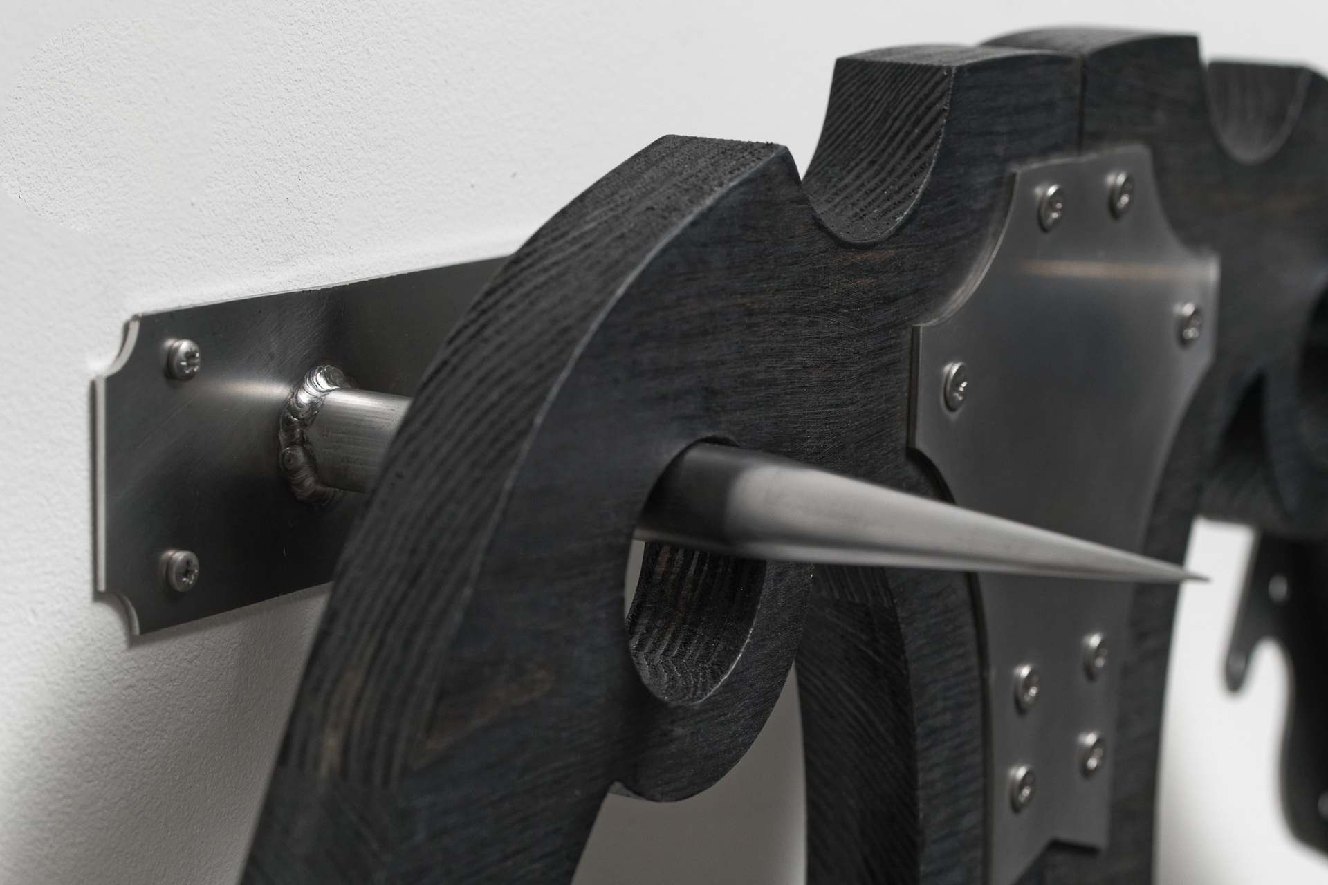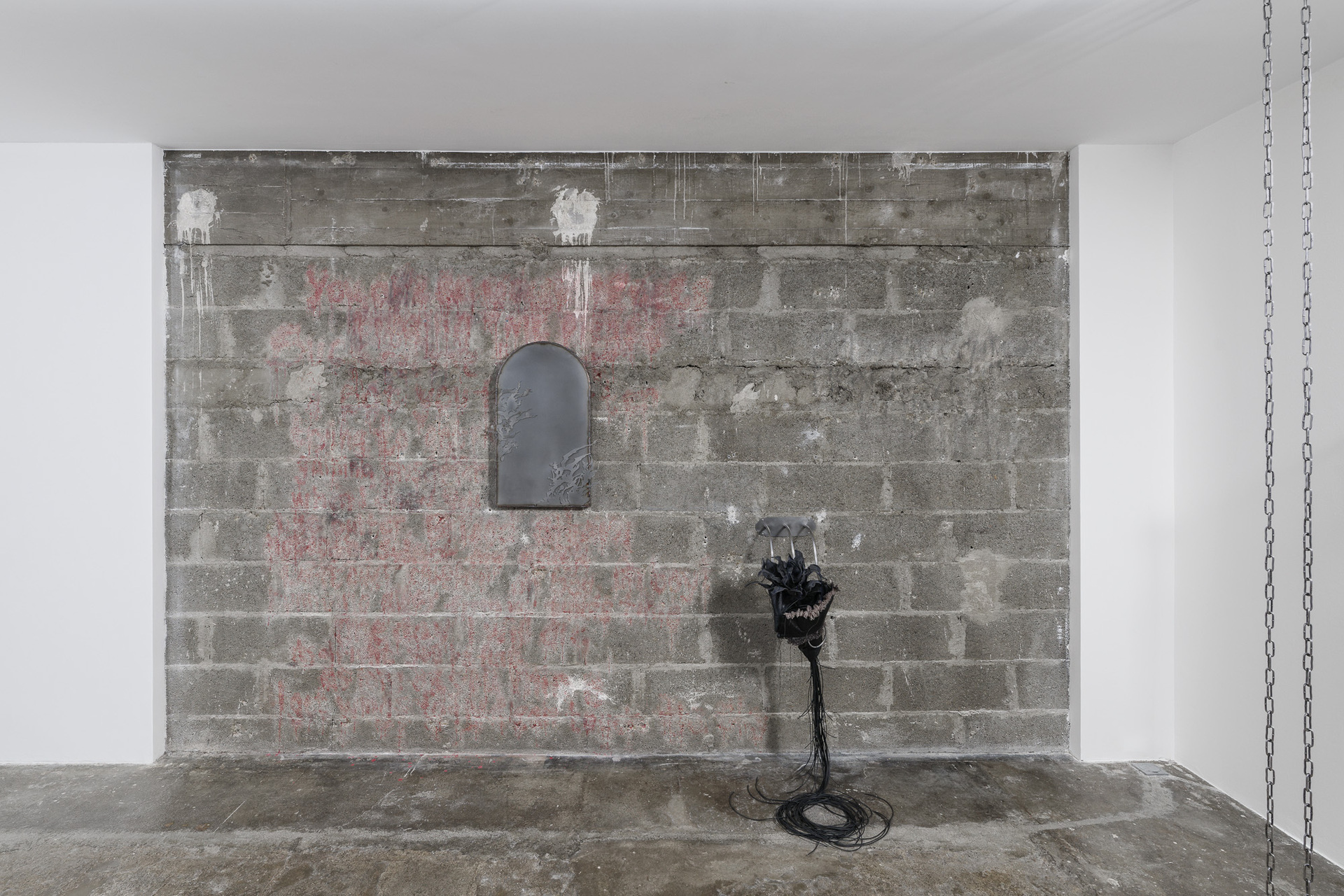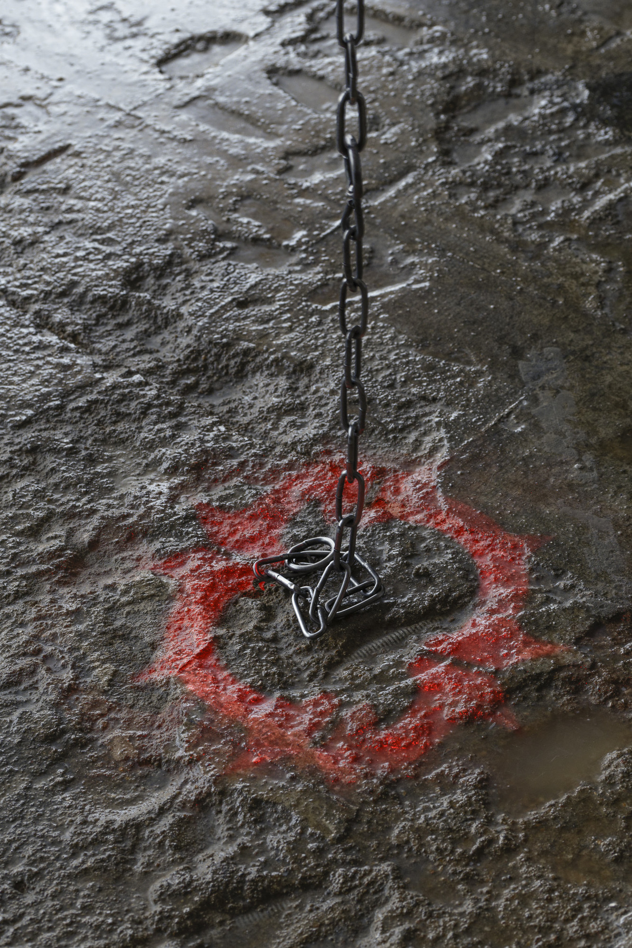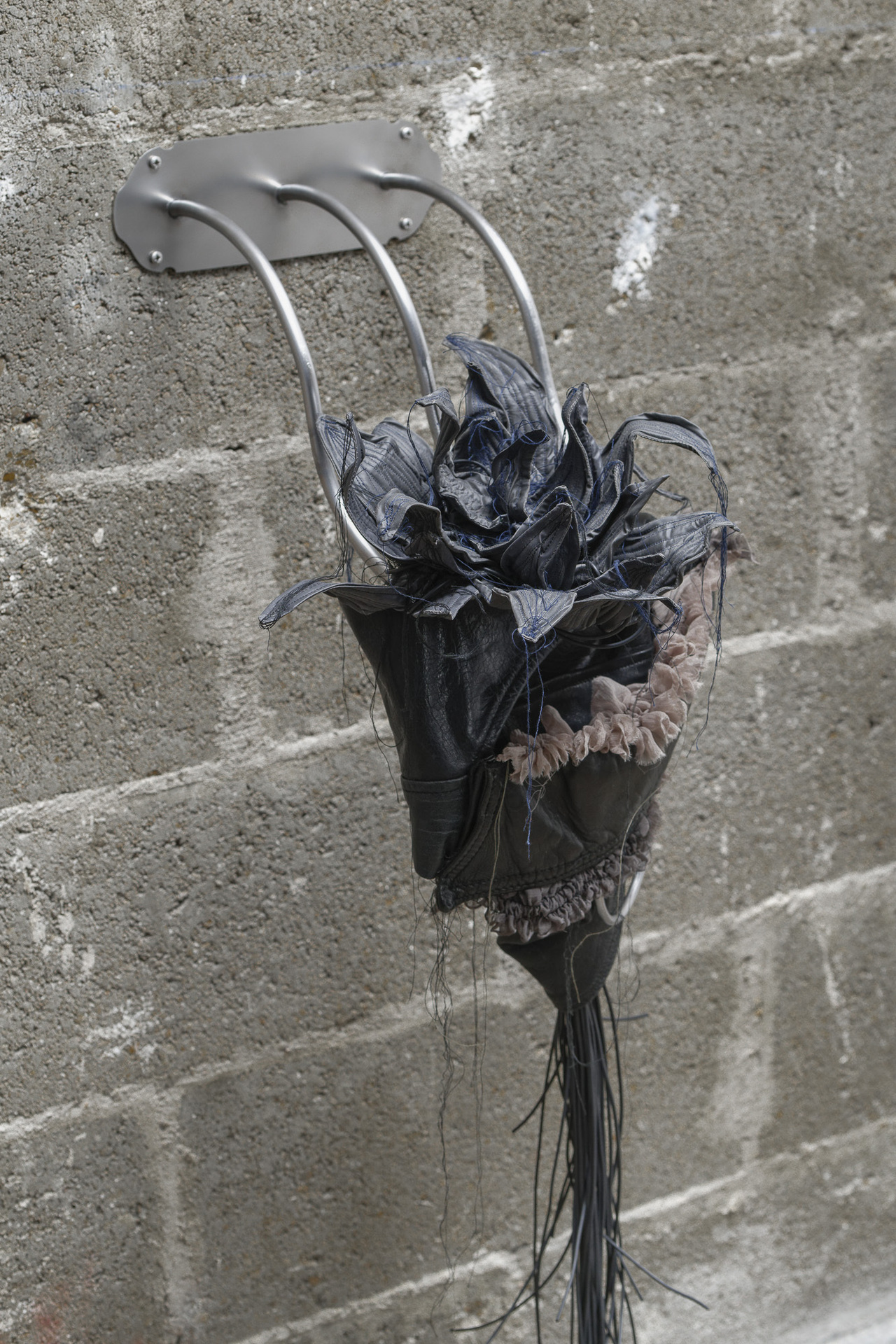 Thus, everything that populates the space seems to come from an era that is or will soon be over: first that of Fordism, followed by a post-Fordism, globalized. The works resemble spare parts or mechanical instruments straight out of factories. Cables, curtains of chains and industrial materials refer to the pictorial field of the machine — an alienating machine, increasing the rate, the demands, the cycles of production and consumption. On the ground lies The Serpent, an charcoal-colored sculpture with menacing forms — sharpened, merciless, spikes protruding —, it could very well be mistaken for a trap, a vice ready to close in on a captive member. But the body, if it is summoned, shines by its absence. Mirror in Flames, for example, does not reflect the visitor. One can simply detect a few delicate nuances and flickers of light, its metal polished down to a matte and satin finish. The artifacts testify above all to a lost humanity, engulfed in the ruins of capitalism.