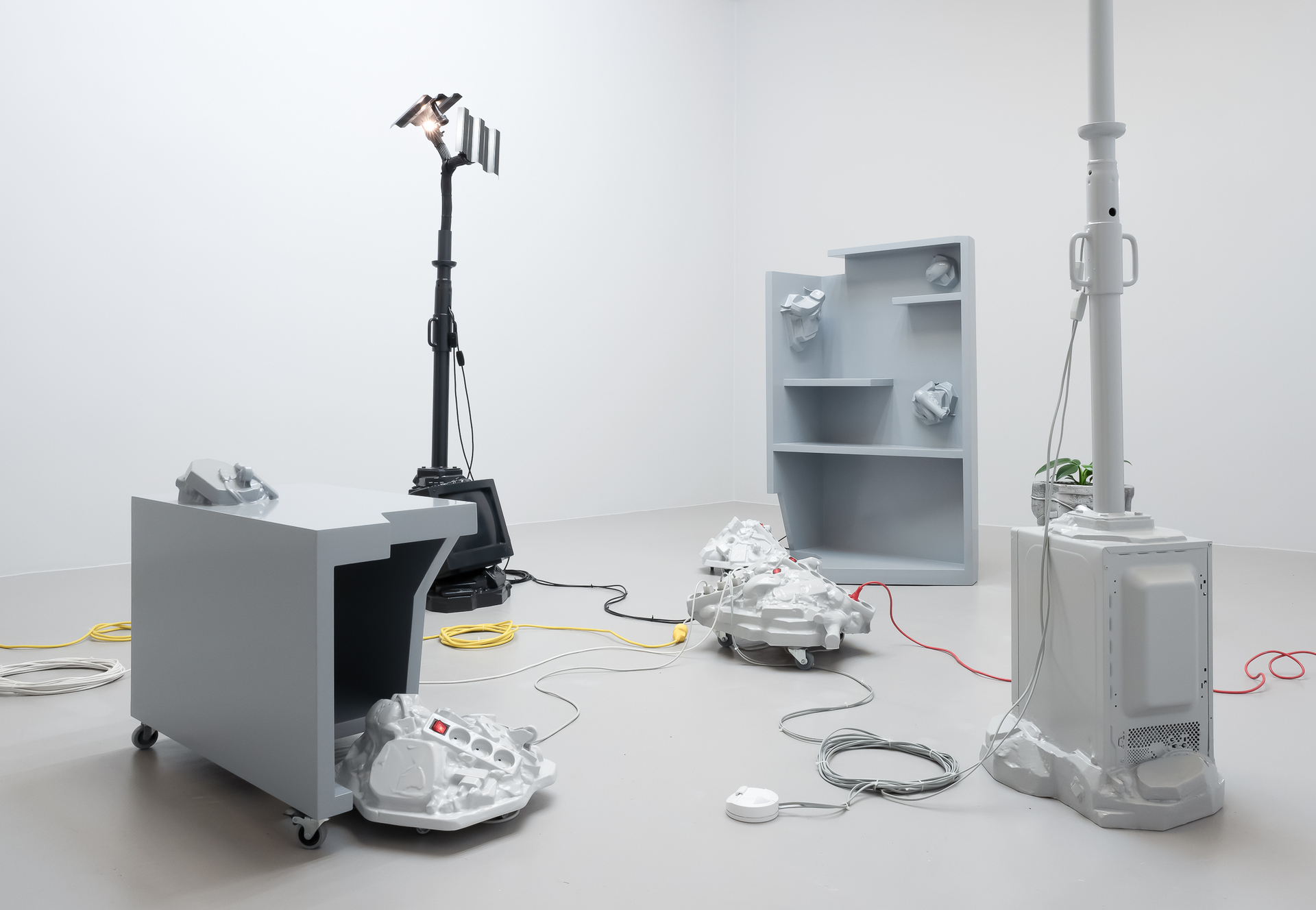This installation includes a series of sculptural objects providing lighting, storage and seating and together acting as part of an everyday domestic interior. Conceptually, the workstation is powered by the energy stored in the electronic waste - virtual memory data, stored images, and recorded phone calls. All the pieces are connected in a network of cables – ultimately becoming an ecosystem, a blending of the natural and the man-made. Digital Grounding is a reflection upon material life and how earth’s raw materials venture into our homes in the form of something as complex as a phone. The work presented simulates the cycle of how we continuously remove, add and pile to the surface of the earth we inhabit.