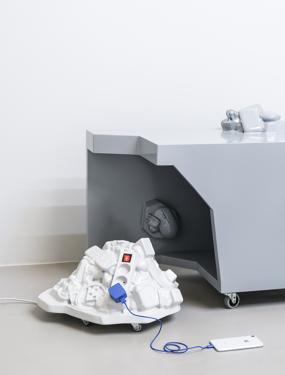 For the exhibition, Jacob Egeberg has created a number of highly original lamps, power outlets, shelves, a console, a flowerpot and wall objects which all contain clusters of digital waste; Computer mouses, remote controls, switches, cables, telephones, displays and kitchen appliances. All wrapped in a smooth, monochrome surface.