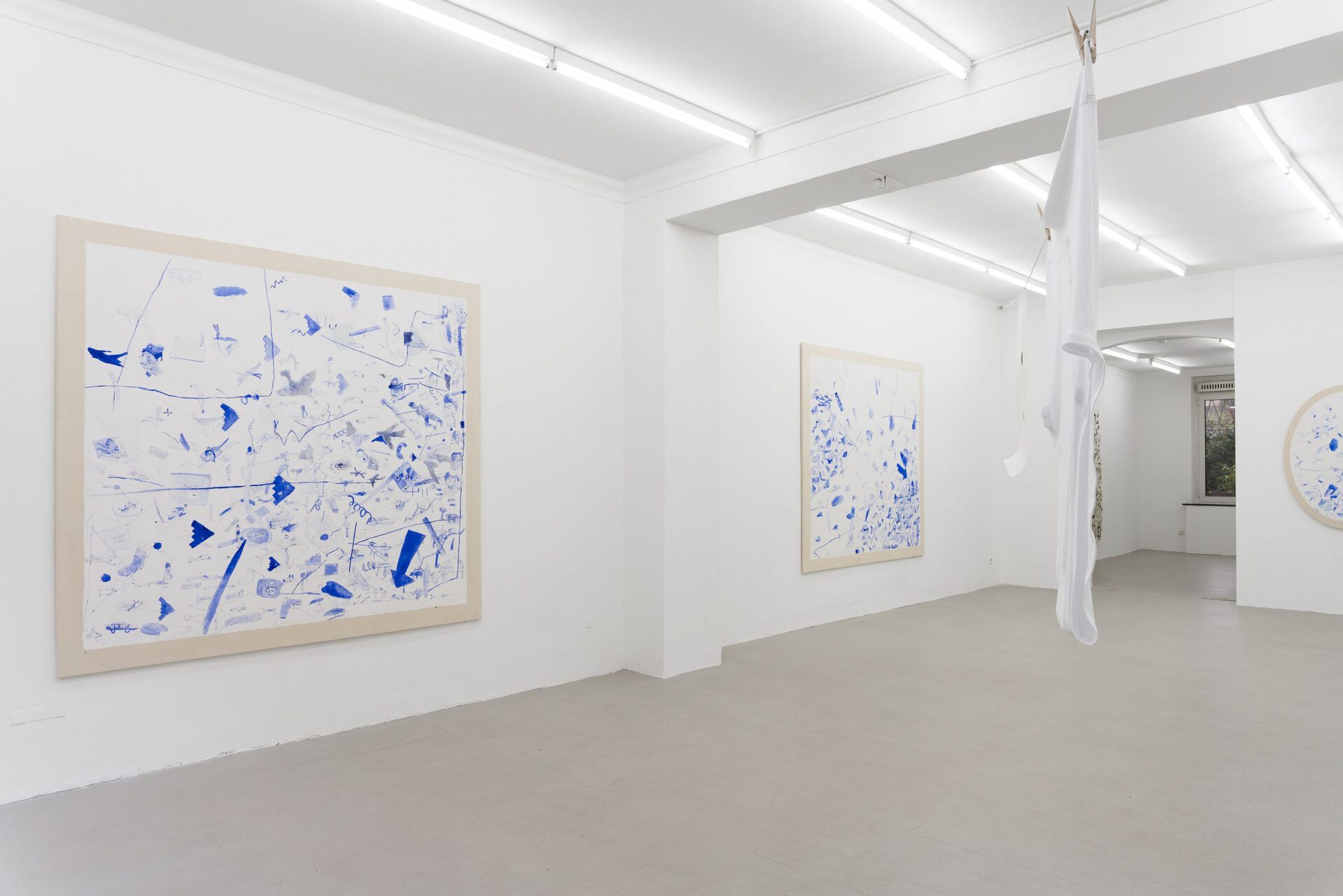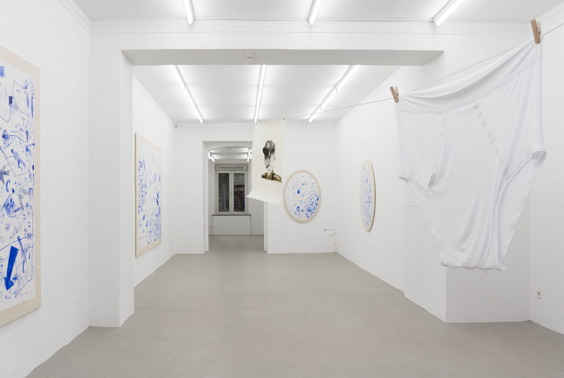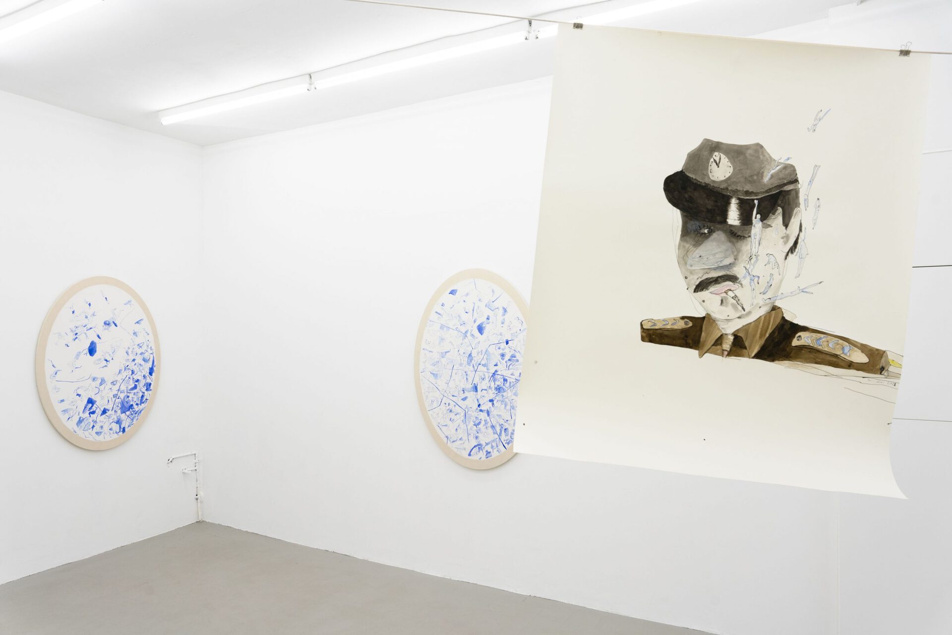 Hanging on a washing line is a huge pair of men’s underpants, seemingly evolved out of the dream-like tales and loosely interconnected pictures. Also hanging from the line in the centre of the room is the drawing on paper of an officer smoking. He appears surrounded by deep-blue drawings of nebulous figures on a starkly white background. On closer inspection the canvases show complexly interweaving tales of figures and objects, prompting one to reflect on about lewdness, one’s personal experiences and attendant feelings of lust and shame.