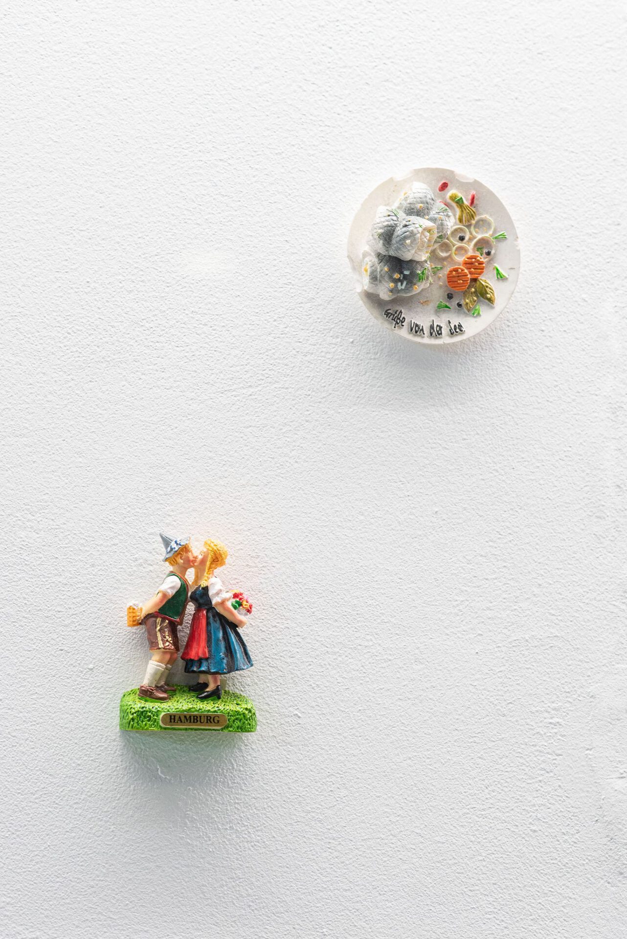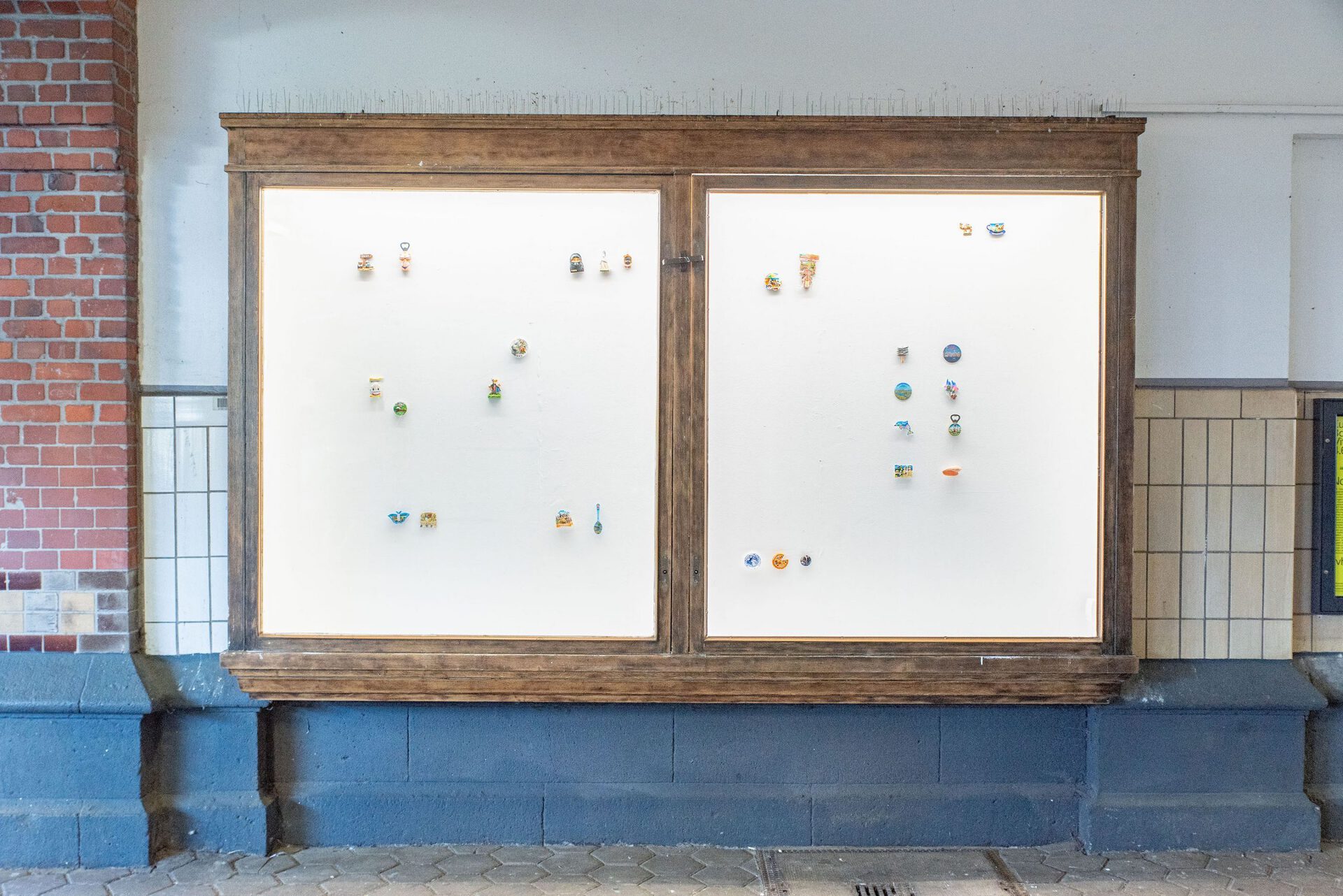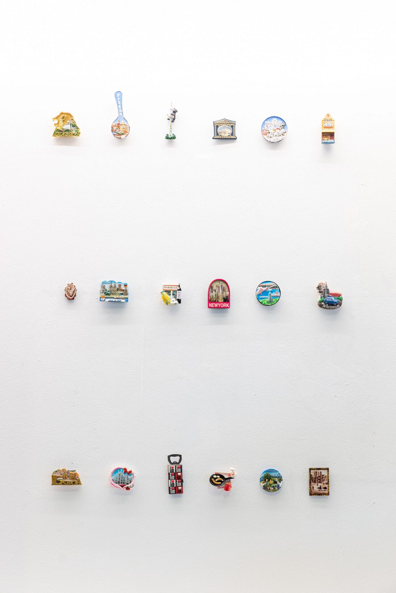 The collection shown is a selection of refrigerator magnets that pouch upon touristic places and sights, often reproducing stereotypical representations. Motifs include beaches and buildings, culinary specialties, animals or celebrities. Amongst junk and rarities, the magnets include hand-painted one-offs and industrially manufactured mass products. The non-hierarchical arrangement draws attention to the special features of the individual objects and opens up new readings in the moment of their interplay. Personal experiences linked to the purchase of the souvenirs - whether actually experienced or invented - remain hidden from the viewer. Moreover the exhibition addresses the experience of purchasing souvenirs. The density of souvenir stores can be perceived as an indicator of how worth while a place is considered to be. With reduced means, Jil Lahr simulates a retail store that aesthetically takes up the abundance of touristic consumer items. The showcase is a popular form of presenting collections in museums as well as in private spaces. In Jil Lahr's exhibition, this context resonates and simultaneously maintains the functional nature of the objects as magnetic objects. The exhibition addresses the journey of things from their purchase to the question of their whereabouts.