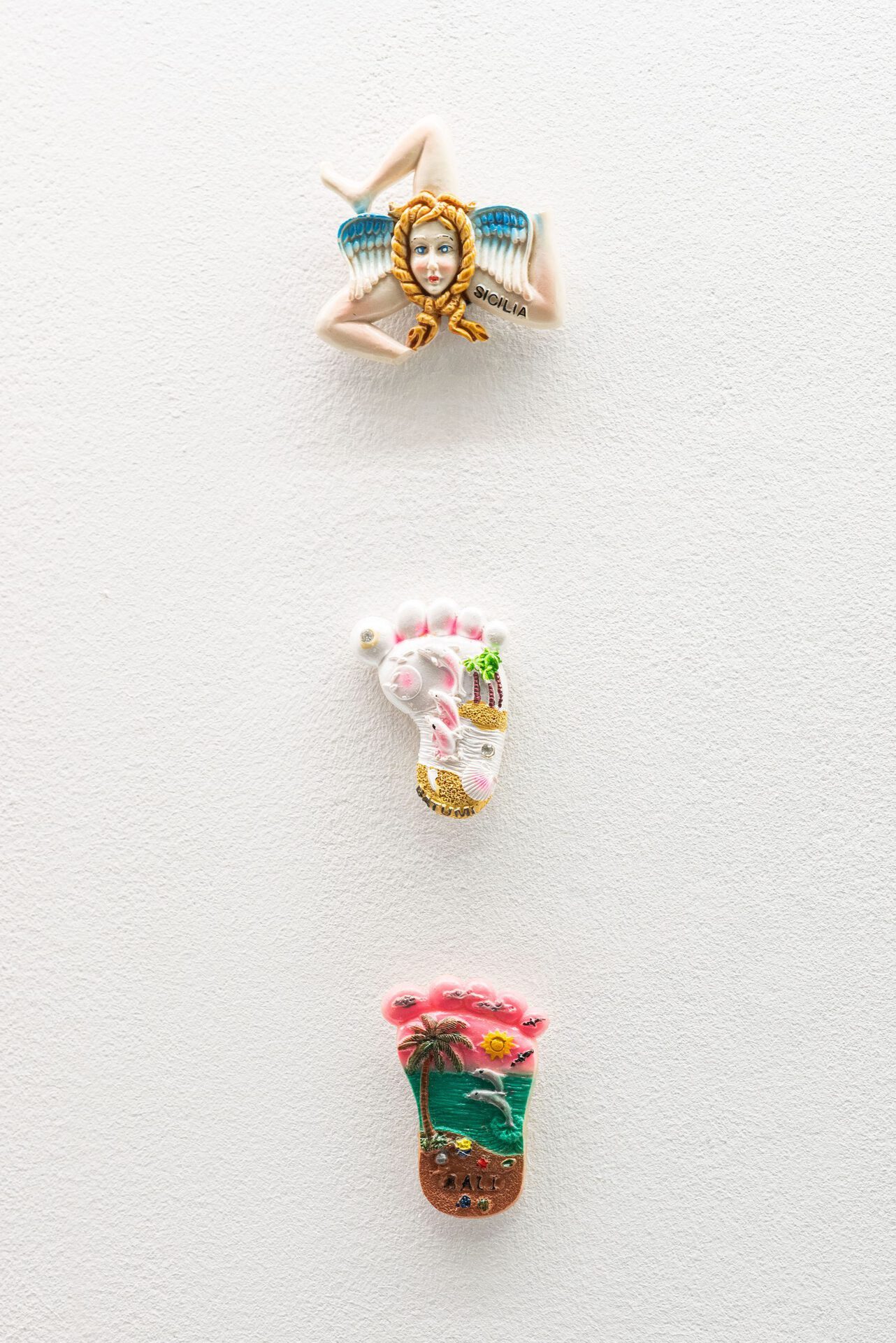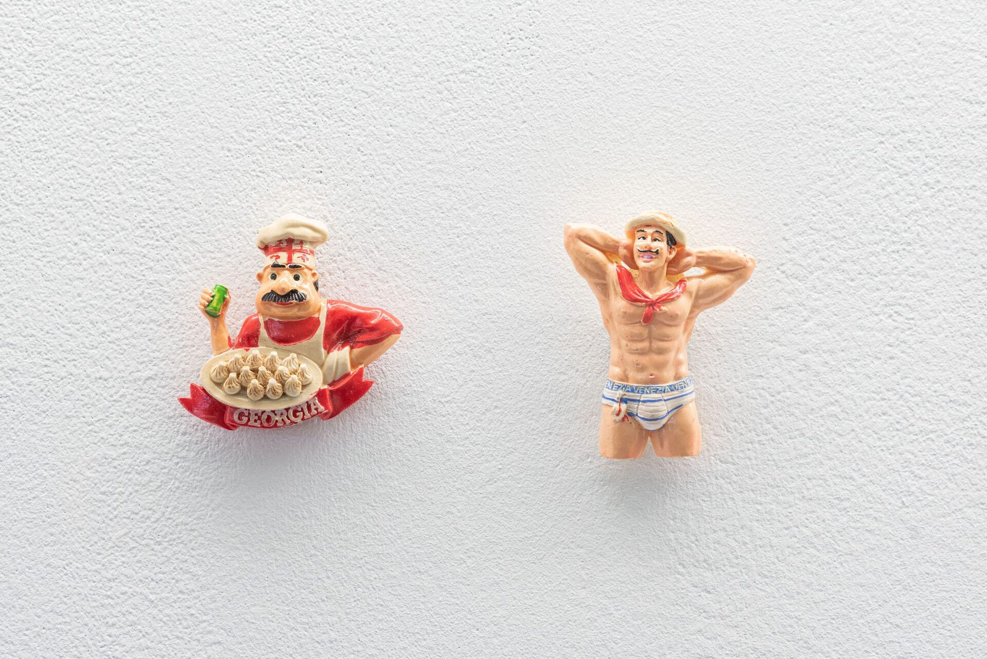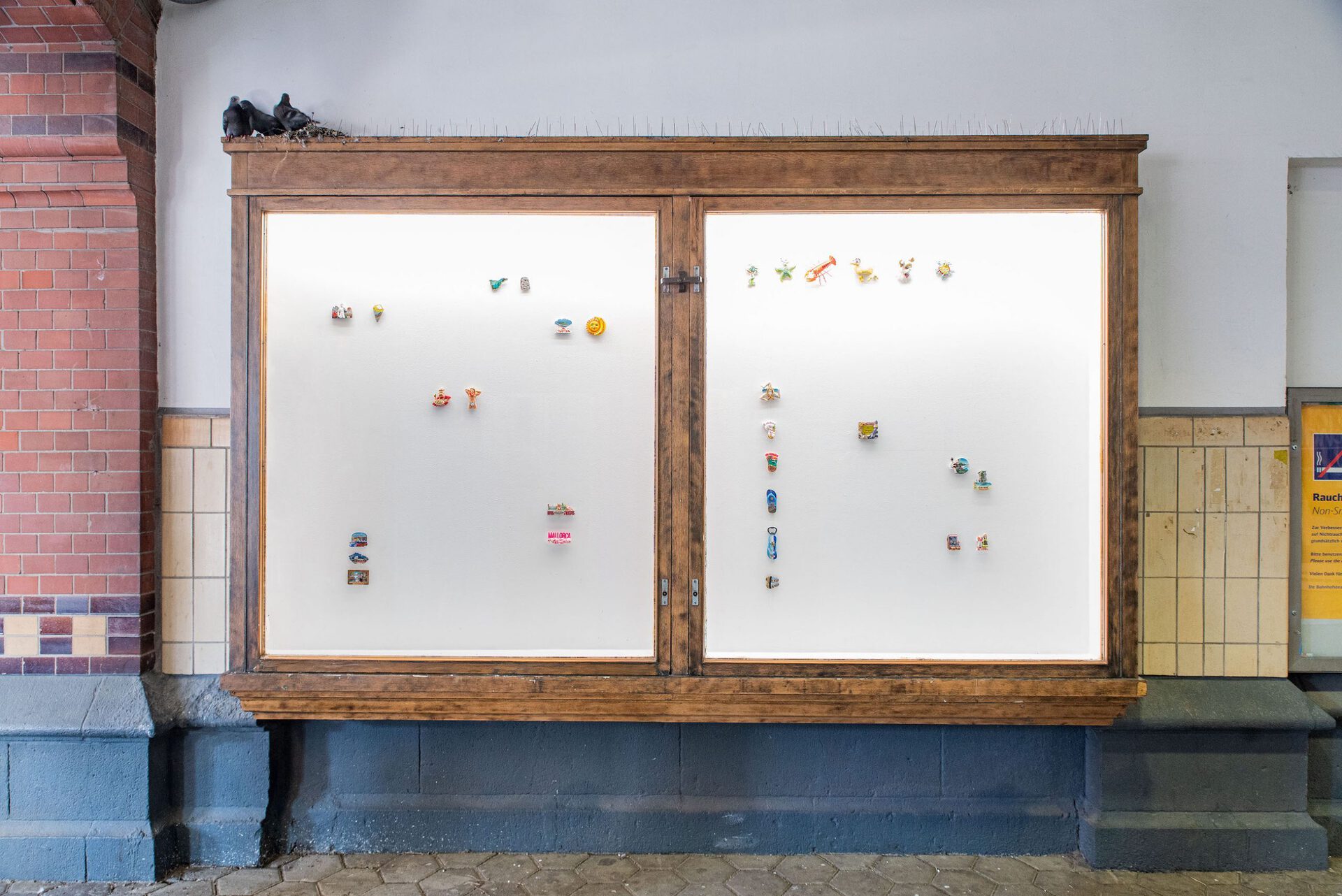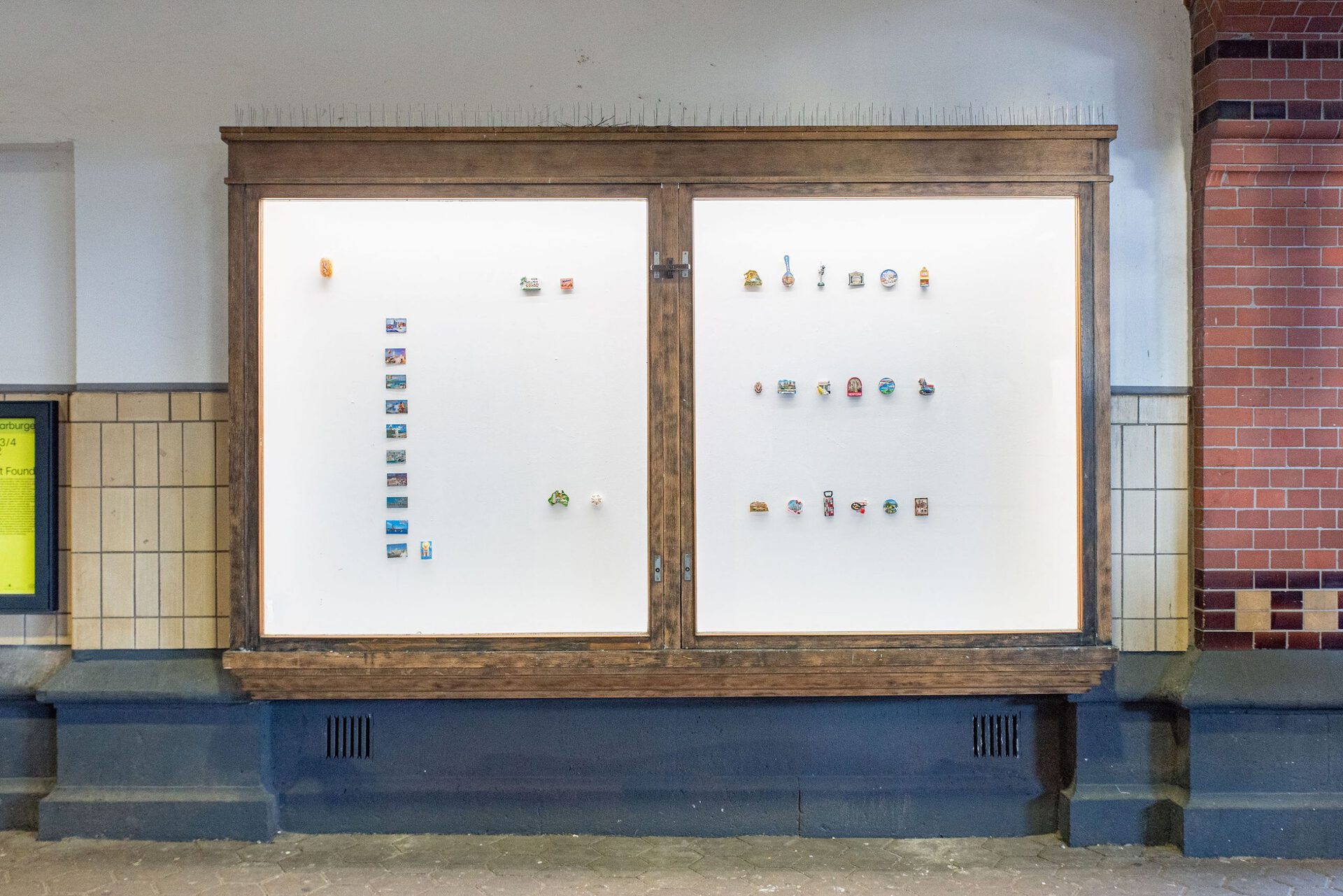 The collection shown is a selection of refrigerator magnets that pouch upon touristic places and sights, often reproducing stereotypical representations. Motifs include beaches and buildings, culinary specialties, animals or celebrities. Amongst junk and rarities, the magnets include hand-painted one-offs and industrially manufactured mass products. The non-hierarchical arrangement draws attention to the special features of the individual objects and opens up new readings in the moment of their interplay. Personal experiences linked to the purchase of the souvenirs - whether actually experienced or invented - remain hidden from the viewer. Moreover the exhibition addresses the experience of purchasing souvenirs. The density of souvenir stores can be perceived as an indicator of how worth while a place is considered to be. With reduced means, Jil Lahr simulates a retail store that aesthetically takes up the abundance of touristic consumer items. The showcase is a popular form of presenting collections in museums as well as in private spaces. In Jil Lahr's exhibition, this context resonates and simultaneously maintains the functional nature of the objects as magnetic objects. The exhibition addresses the journey of things from their purchase to the question of their whereabouts.