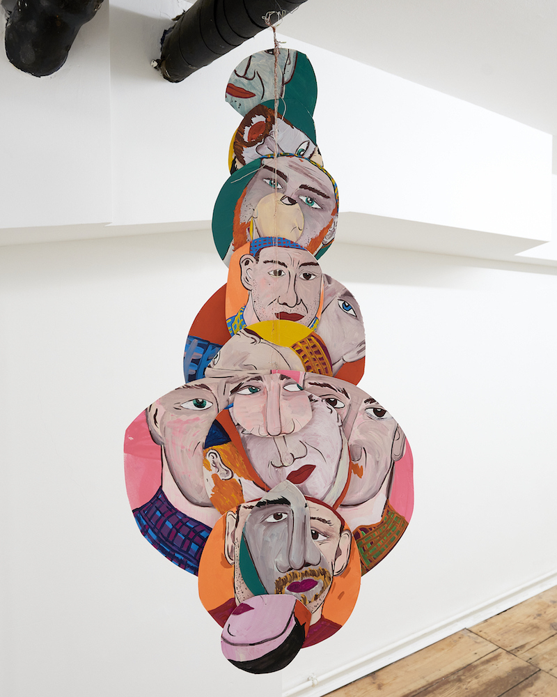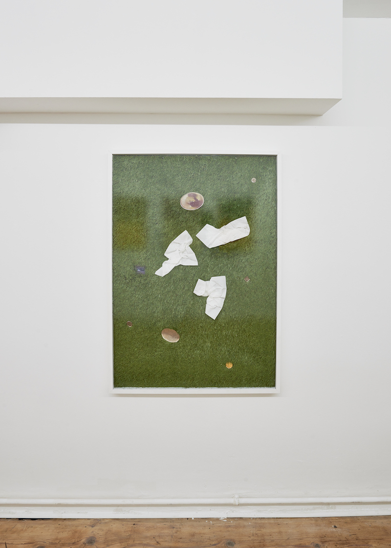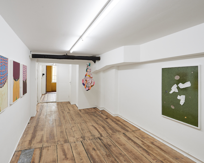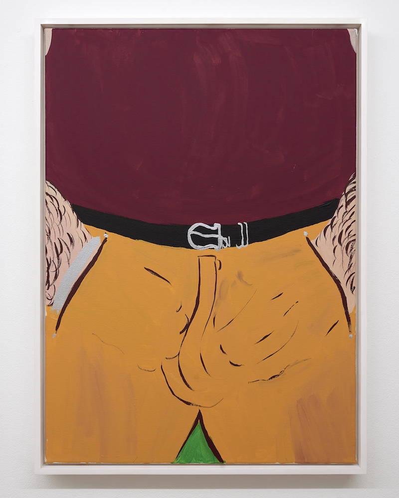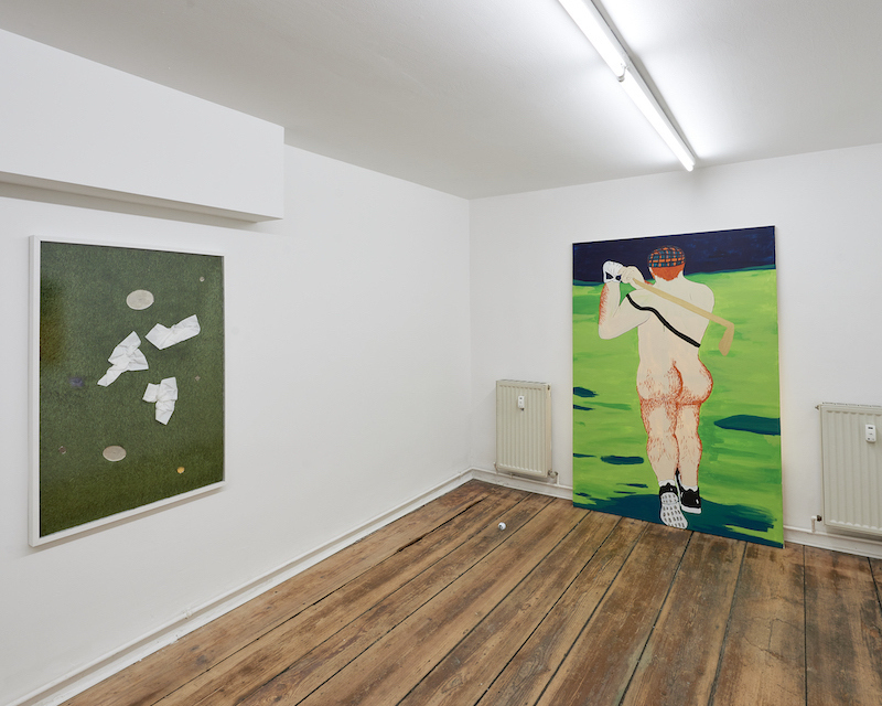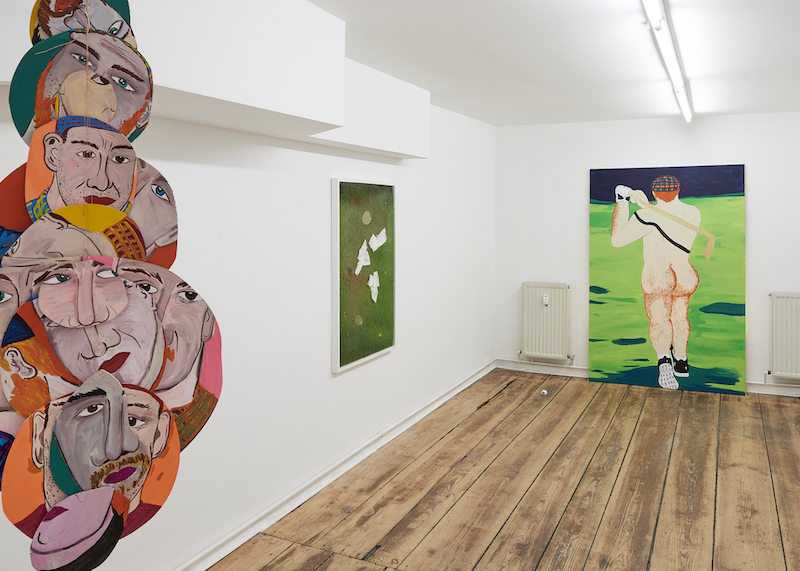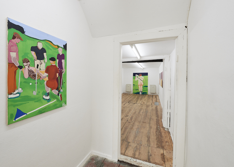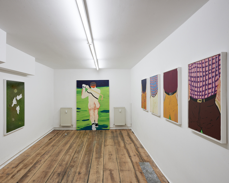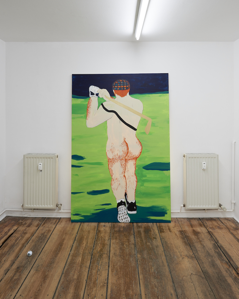 A naked man sprawled across a putting green is surrounded by a group of male onlookers. His hand covers his mouth, perhaps to conceal a smile that makes light of the ludicrous situation. A thick layer of body hair covers his chest and belly and a pink protuberance extends from between his legs. The voyeurs are dressed in the campy costumes that golfers wear, their hands stuffed in their pockets, playing with erections that are clearly visible through the material of their trousers. This painting, the first work in Josip Novosel’s show at stadium, establishes the artist’s concern with a sport that is often played by a white male ruling elite – a class a lot of gay men strive to be a part of. This is achieved with a tongue-in-cheek queering of modernism, a stylistic approach that has been explored in the artist’s previous work.