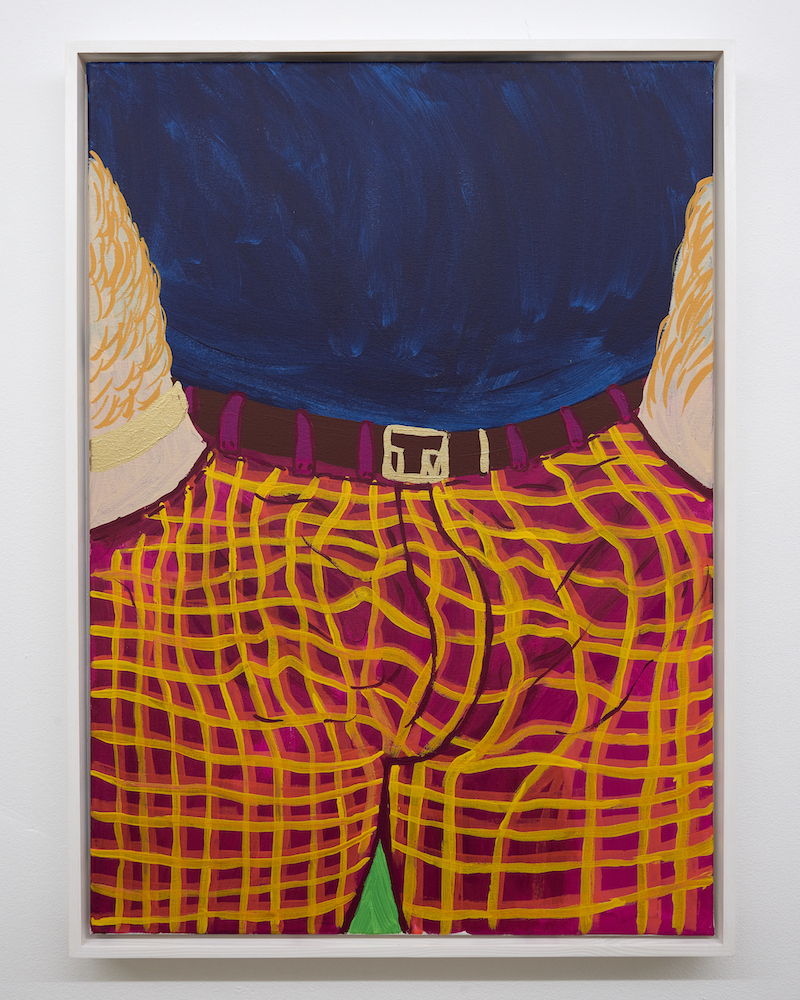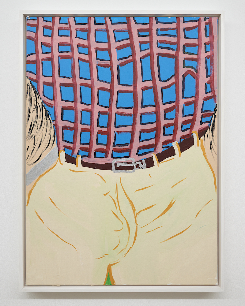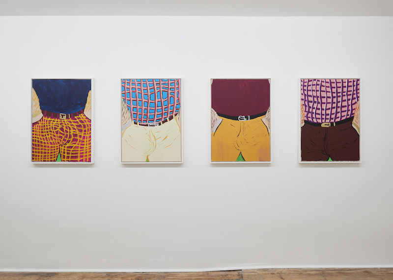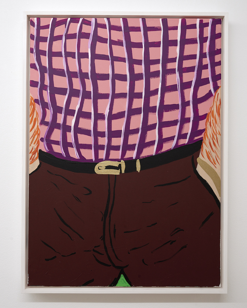 The contrast between naked and clothed figures, for example, recalls Édouard Manet’s Déjeuner sur l’herbe (1863), and as in Manet’s painting, the figures in Novosel’s canvas appear disconnected and aloof, as imprisoned by their individuated sense of self as they are by the toxic green that frames them. The artificiality of the Parisian park in Déjeuner is replaced with the manicured lawns of the golf club – the locus of middle class aspiration. While white heteronormativity tends to be the norm in such settings, the aggressive masculinity of the venture capitalist-cum-golfer is tempered by clashing pinks and reds that riff on a kitschy fauvism typical of the artist’s signature style. Centre stage is the muscular ass of a man, and appearing again prominently in a larger painting, is the ample posterior of a man teeing off. Despite this amusing content, a palpable tension suggests a farcical fantasy can turn violent: the vulnerability of the exposed man lying prostrate on the ground is in contrast to the men who stand so close and erect, armed with weapons.