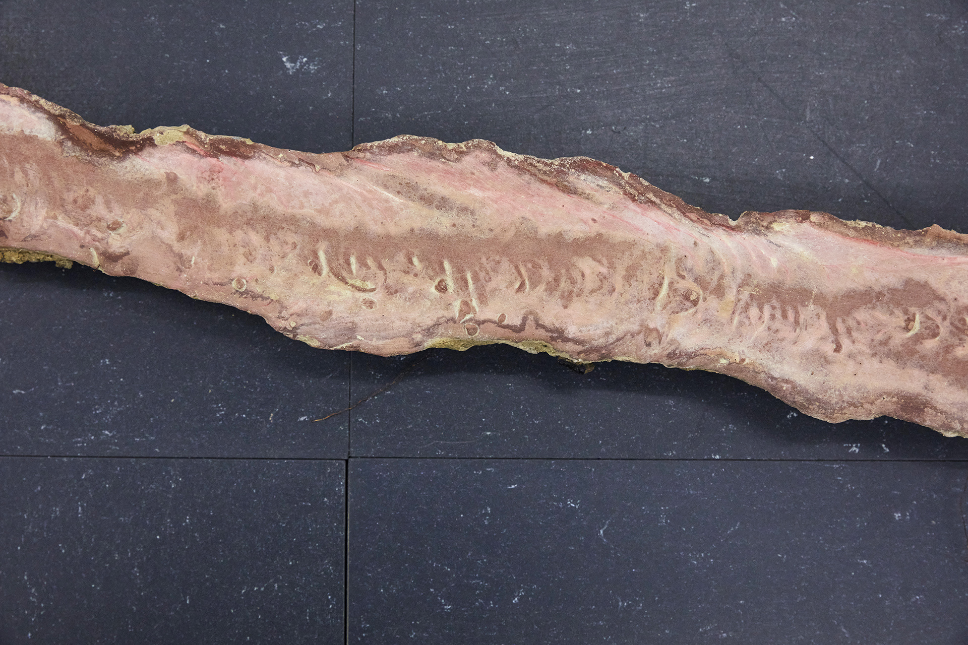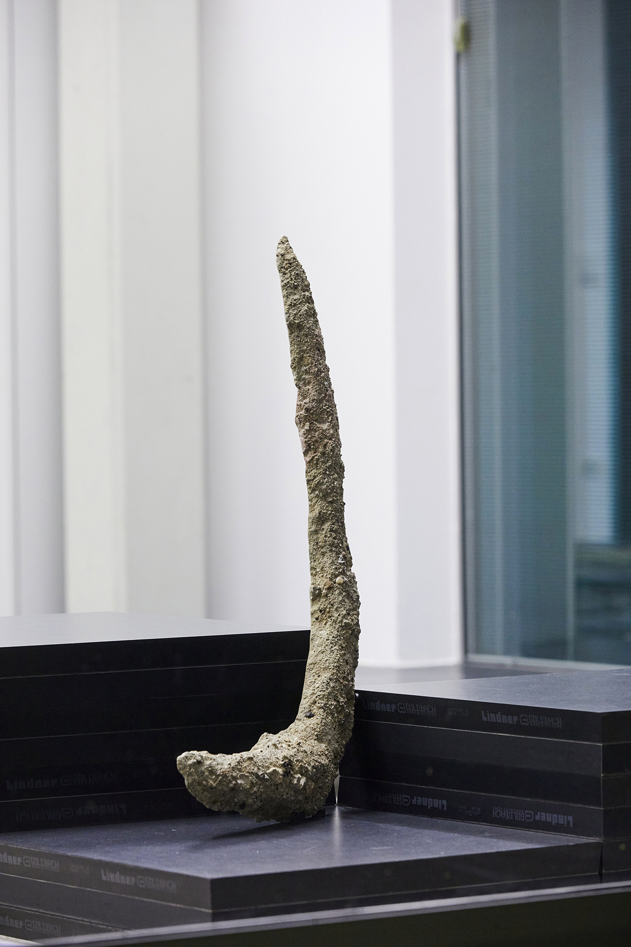 The sounds of words like “bones | concrete surface | interstratified limestone | gel | light gray | remnants of roots | colorful | turf | edged | rust brown | leftover brick | brittle | glass shards | round) | 100 mm | pieces of wood | light-brown green | earthy | solid | stiff | nan | metal | domestic waste | 50 mm | 5.00 % | clayey” permeate the exhibition space and can be read parallel in a video installation. They are all the words used thus far in the city’s drill core register to document human modifications to the soil of Vienna since 1831. The 87,963 material entries were ordered—including errors, description variants, abbreviations, and combinations with punctuation characters—according to their frequency and read in by performer Sabina Holzer in an eight-hour session. The long list of terms and the gradual tiring of the voice make the extent of the human interventions tangible. Moreover, the different spellings of certain terms remind us that the drill core register is owed to the efforts of a great number of people over a long period of time, and thus to collective authorship. The most frequently used word is “brick”, a crucial anorganic building material for the city since the Roman times. Second place goes to “concrete”, even though it has only been common in Vienna since the 19th century—another hint about how the transformation of the Earth’s surface has accelerated as of late.