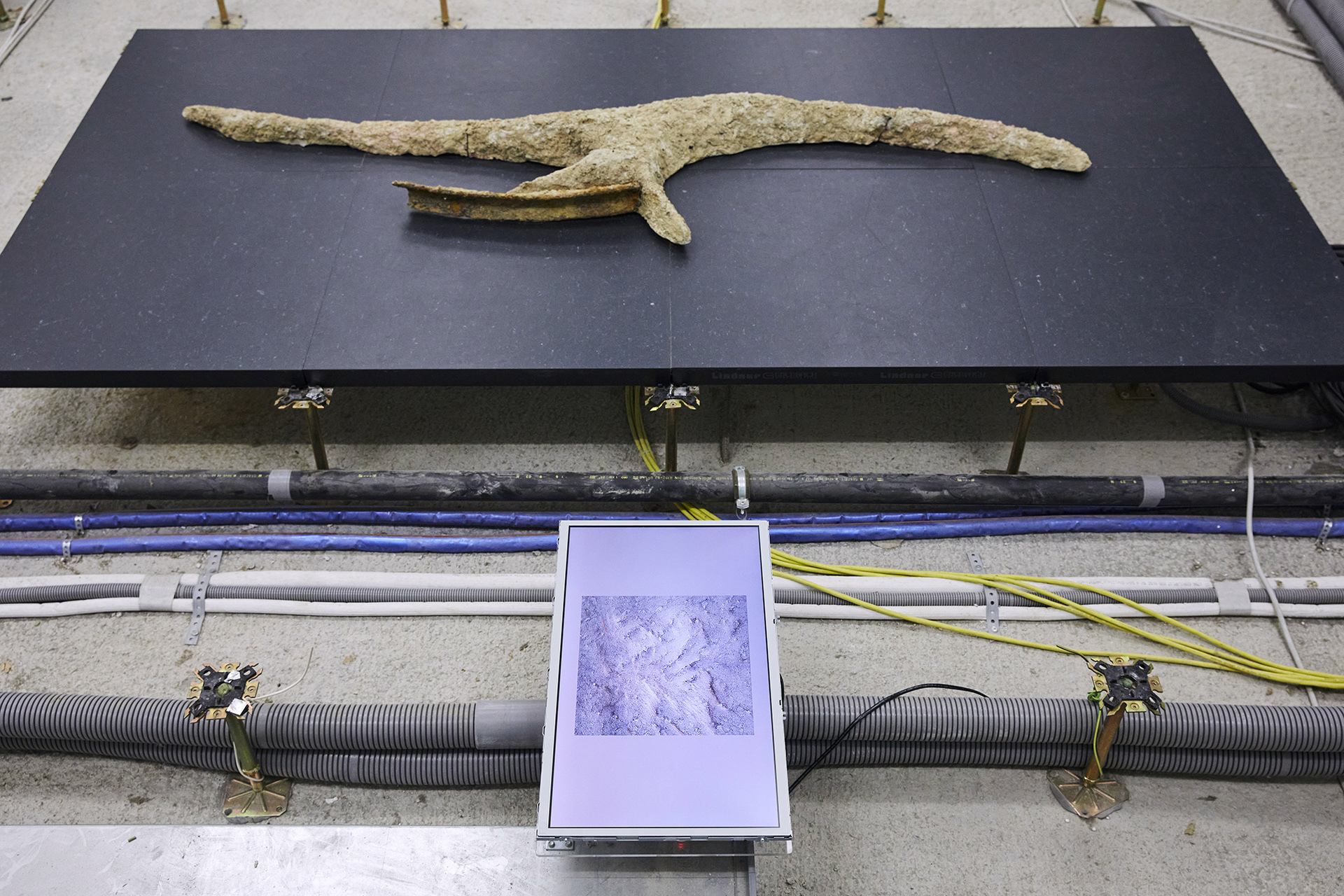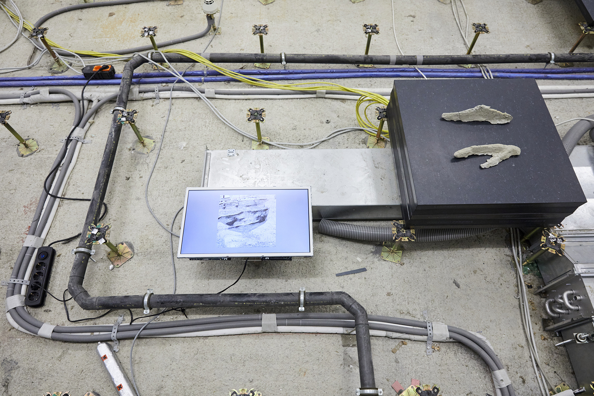 Katrin Hornek transfers this potential back into the analog space: Digital objects derived from the synthetic image production process assume analog shapes as sculptures. Latent Soils at Kunstraum Lakeside enables visitors to grasp the formation of the soil, as the artist puts it, “on molecular and planetary scales, through a multitude of agents and forces in an interplay of human and non-human influences”. In this context, grasping has less to do with a rational conception, rather a sense for dimensions and timeframes.