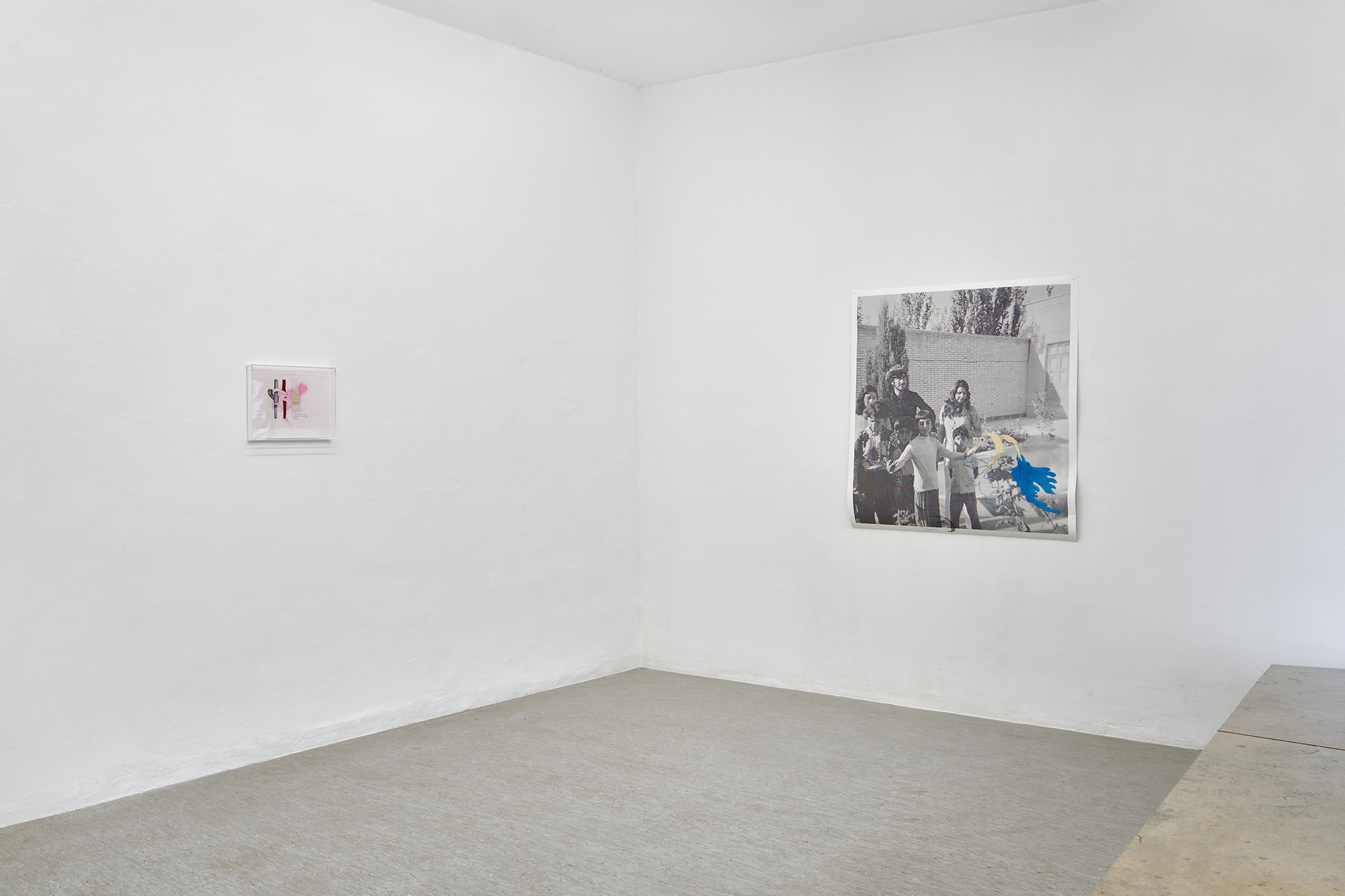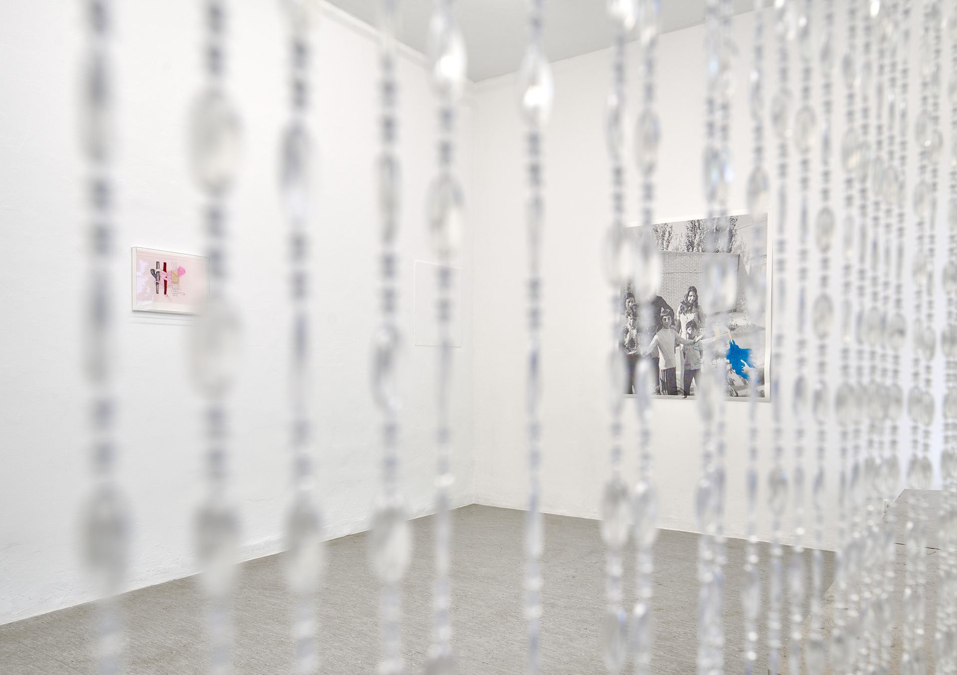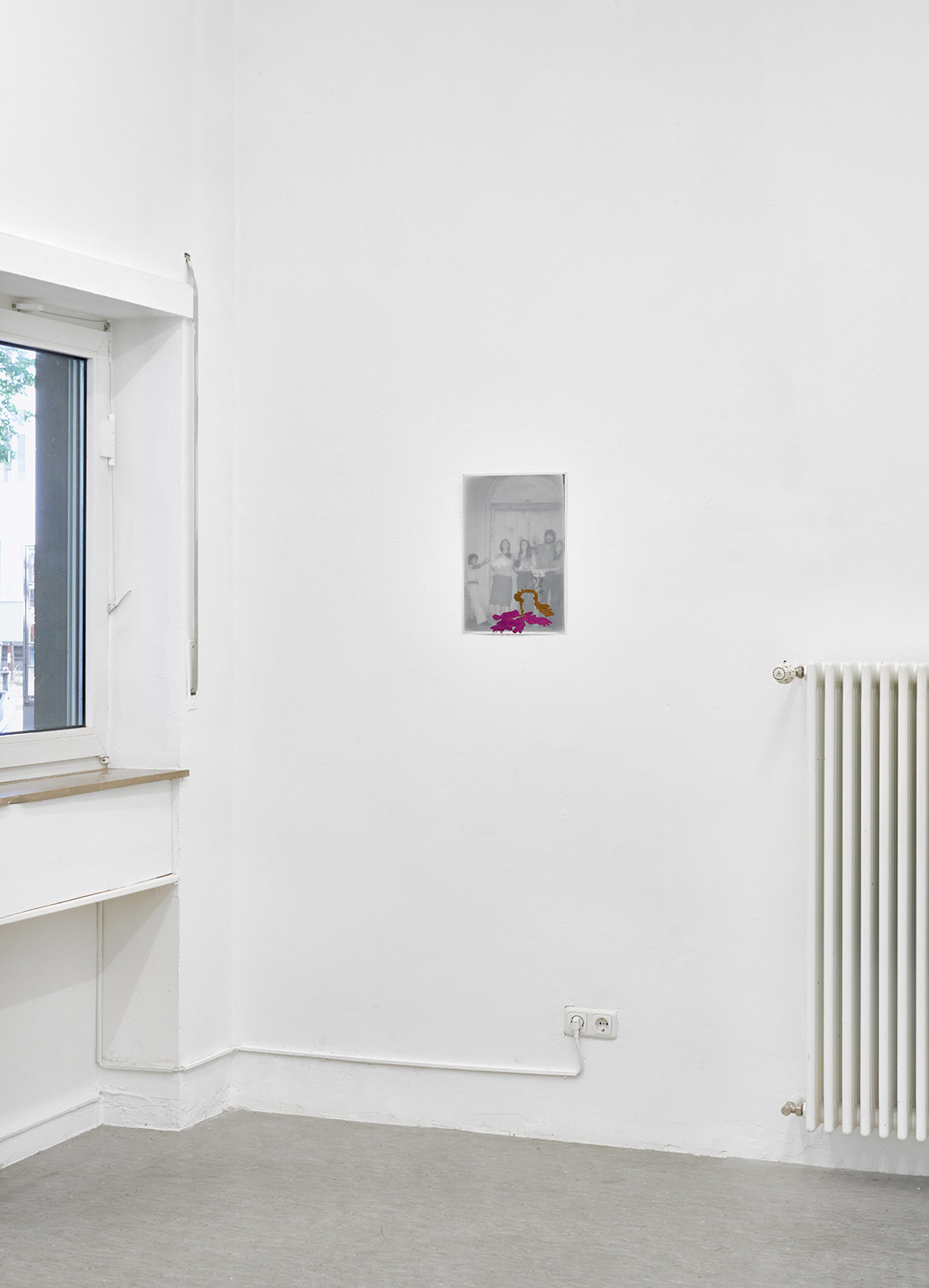 Sharp, the brightly-coloured yarn permeates delicate parchment paper, the stitches’ repetition forming ornamental structures and thus linking it to the underlying, slightly blurred but clearly translucent print of a black and white photograph. Though the embroideries seem to merely serve as a connecting link, they simultaneously bear a destructive effect on the fragile paper. Each stitch, thought its intention may have been cohesive, nevertheless destabilises the sensitive paper structure, which eventually threatens to tear.