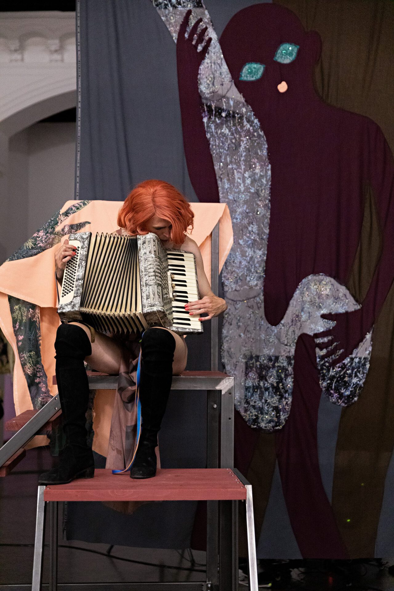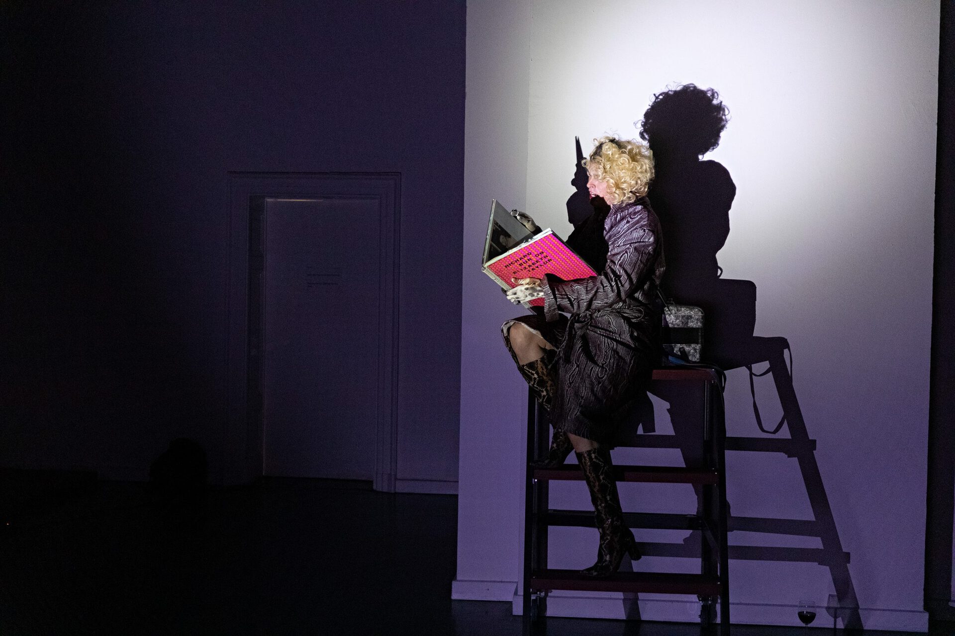 The exhibition Küss mich, bevor du gehst presents a selection of video works. Death by Mystery Part I & II (2020) were made during the first lockdown in the artist's London flat share, in which a hedonistic scenario unfolds. Christensen appears here continuously alternating between being a private person and being his performance alter ego Madame de Dangé Laïm. We watch as he bakes an ex-lover as a calorie-laden cake, only to captivate the audience the next moment as a singing grand dame with an accordion, reading aloud cheerful, erotic, and whimsical stories. With the same frequency as the roles, the settings change between stage moments and banal domesticity. It is not the film editing that determines the transition, but rather Christensen's movement through the house, with the camera following him. Between staged illusion and decidedly everyday life, between theatricality and reality, the pace of the narrative increases, full of sex, glamour, murder and unexpected twists.