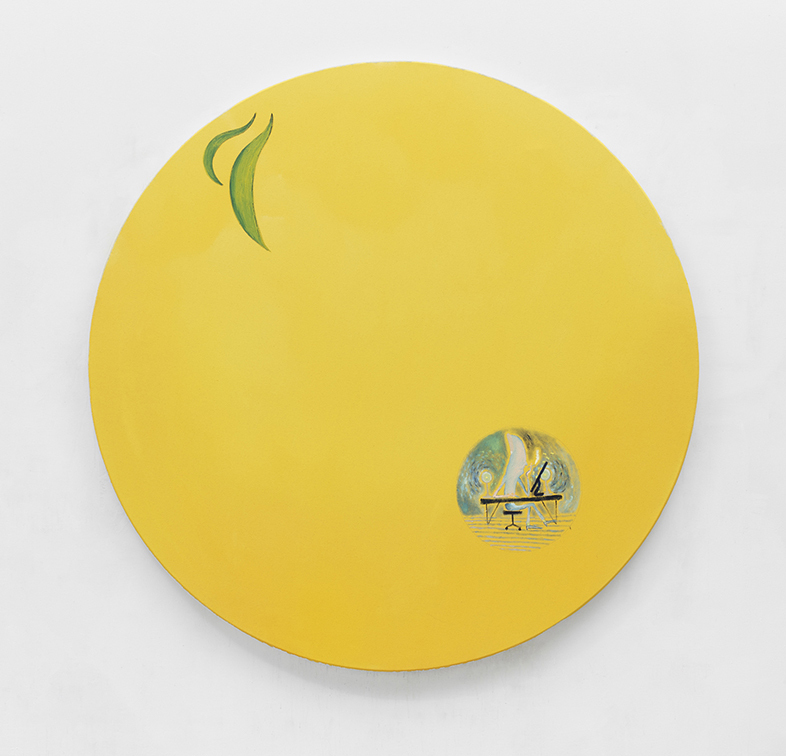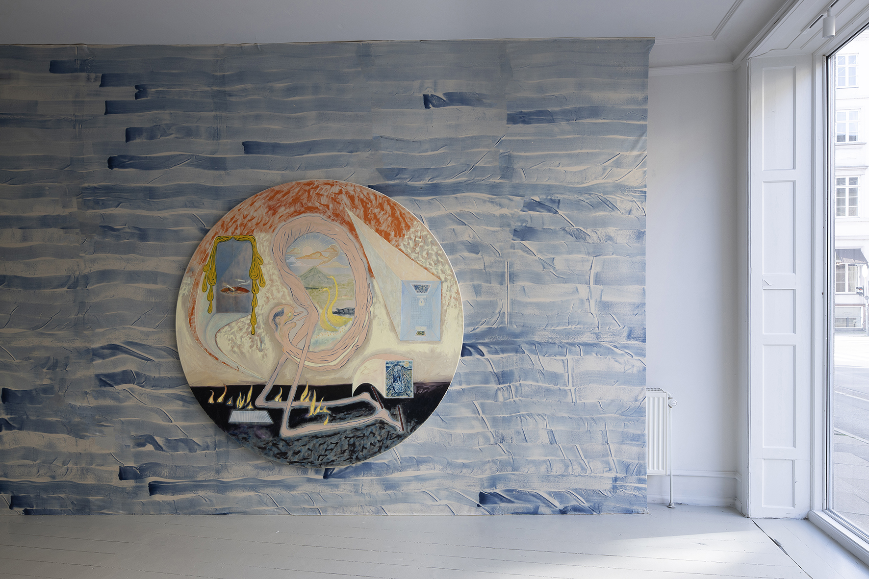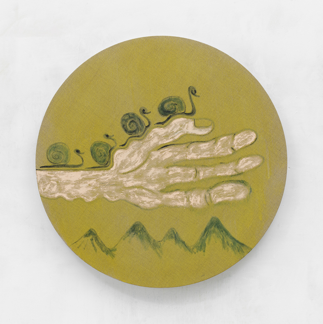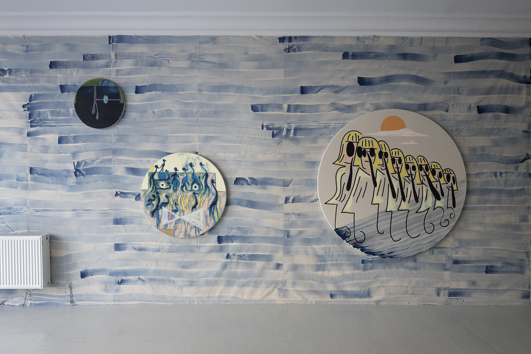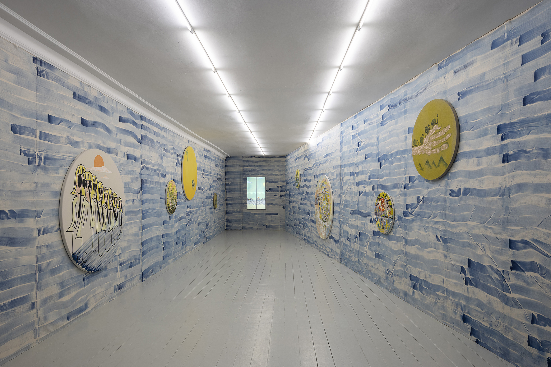 The corridor’s walls are built at an angle, drawing the eye through to their narrowest point — the window, and are punctuated by a series of circular canvases. Meisenberg refers to these as portholes, casting the amorphous blue corridor functions as either ship or ocean, depending on the viewer’s perspective. They cling to the brushed walls, offering up visions of swarming, ambivalent life. Organic motifs such as snails, mountains and human heads abound, all seemingly compromised by a note of existential confusion. A soft breath of panic runs through the undergrowth, sending withered leaves up into the air along with the snails that appear to swarm. They hint at a swollen decadence; a need for decomposition and renewal. In this vision of the future (or is it present?), the greenery is not comforting and the sky is a queasy yellow.