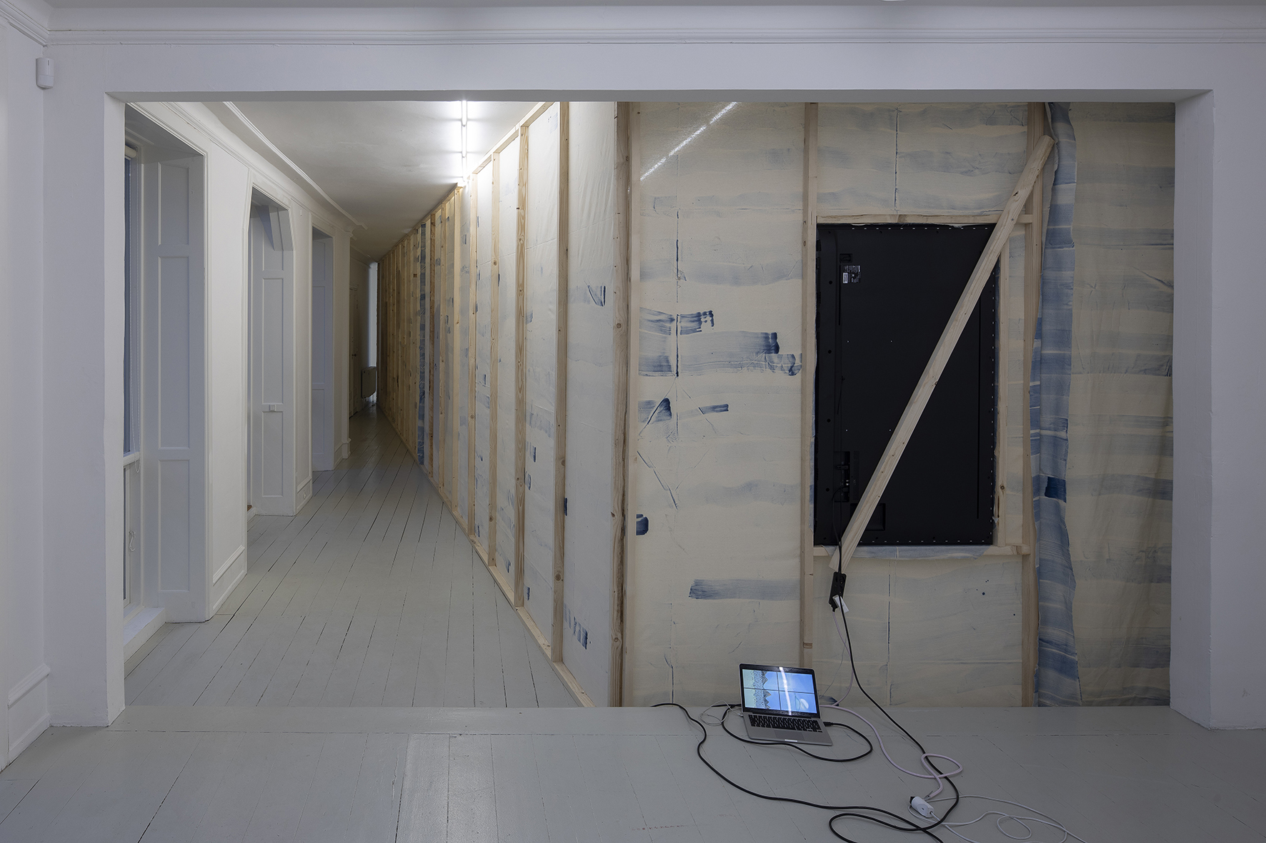 These elements, excerpted from from Meisenberg’s latest series of paintings, possess the same tactile quality as the corridor walls, only the images have been digitally animated, imbued with trembling, traversing life. The staccato sprigs of plant life that cover the terrain blow gently, implying a breeze, as wisps of delicate cloud pass overhead. Every so often, an object materialises in the distant sky and comes flying towards the pane’s flat surface: a plume, a leg, a single wing.