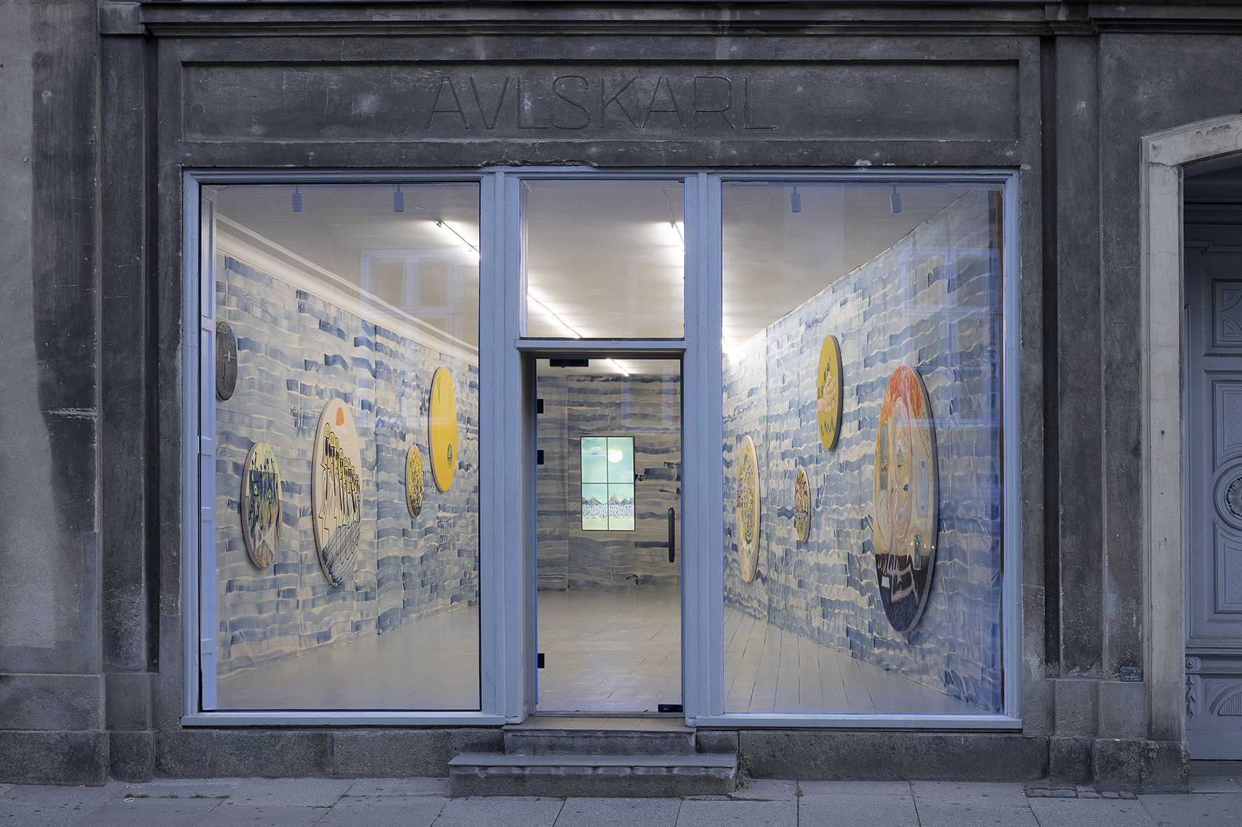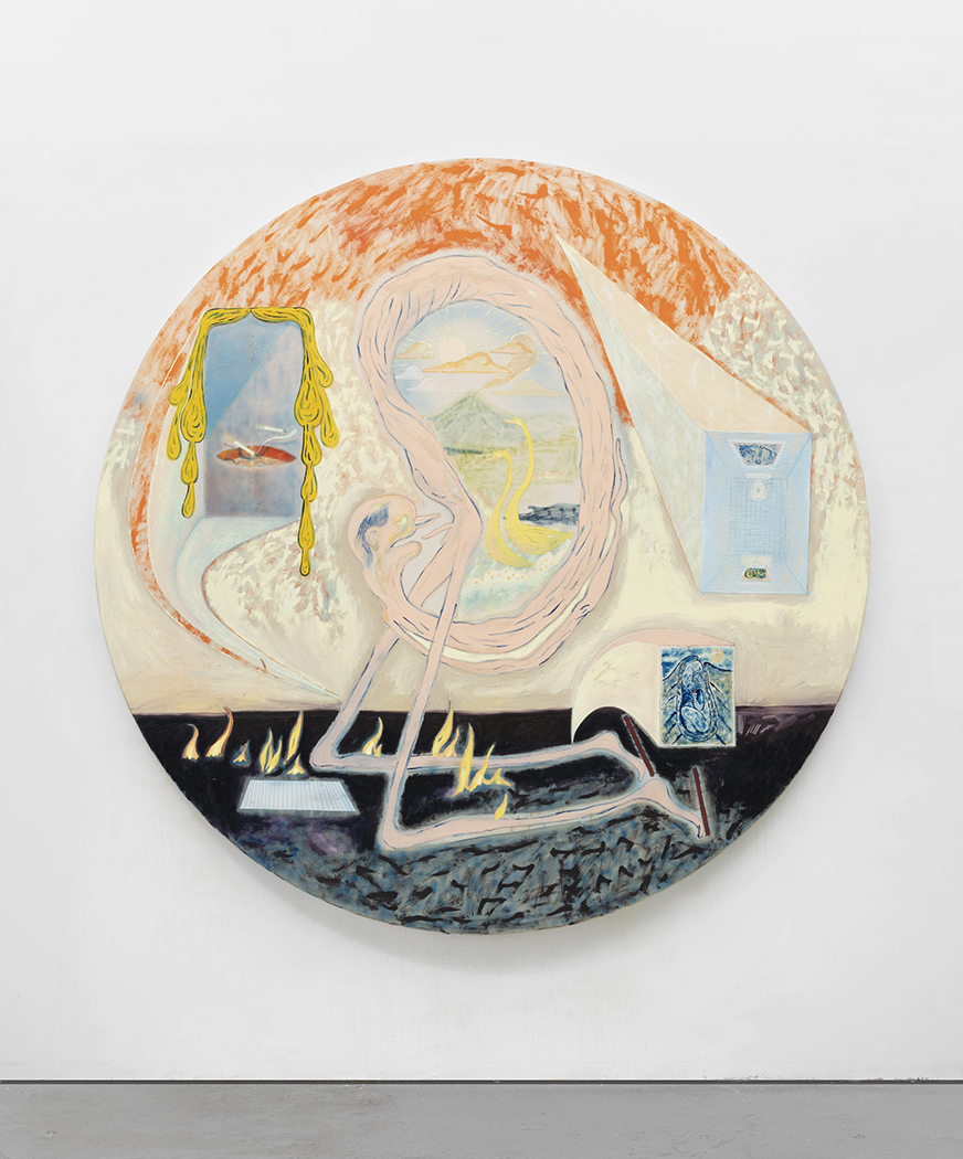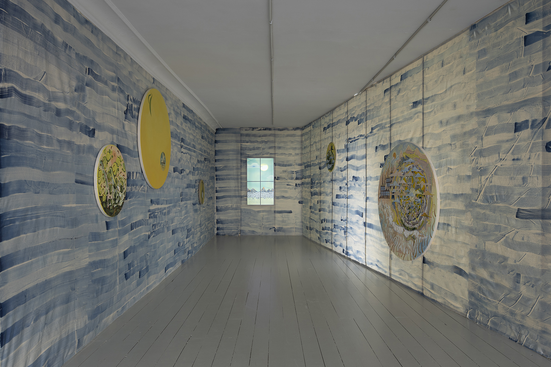 These machinations occupy multiple levels of scale and perspective, all crowded into the same limited spheres. Within each porthole, the planetary and the microscopic collide in an experiential architecture of the absurd, wherein interior and exterior worlds exist in a frenzied simultaneity. Ideas and faces recur in long, algorithmic chains, presenting different versions of themselves – different dreams, of the world and of themselves. Dreams of wombs and windows, and of hopeful landscapes flickering just out of reach, in the world beyond.