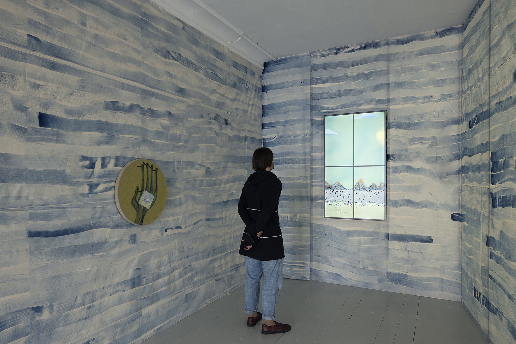 At the end of a corridor of indeterminate length, bathed in lines of brushed Prussian blue, lies a window. Through it, a soft, stratified landscape quivers in a slow breeze. The sky is powder blue, framed by orange-tipped mountains and brushland, with a layer of pale yellow sand below.