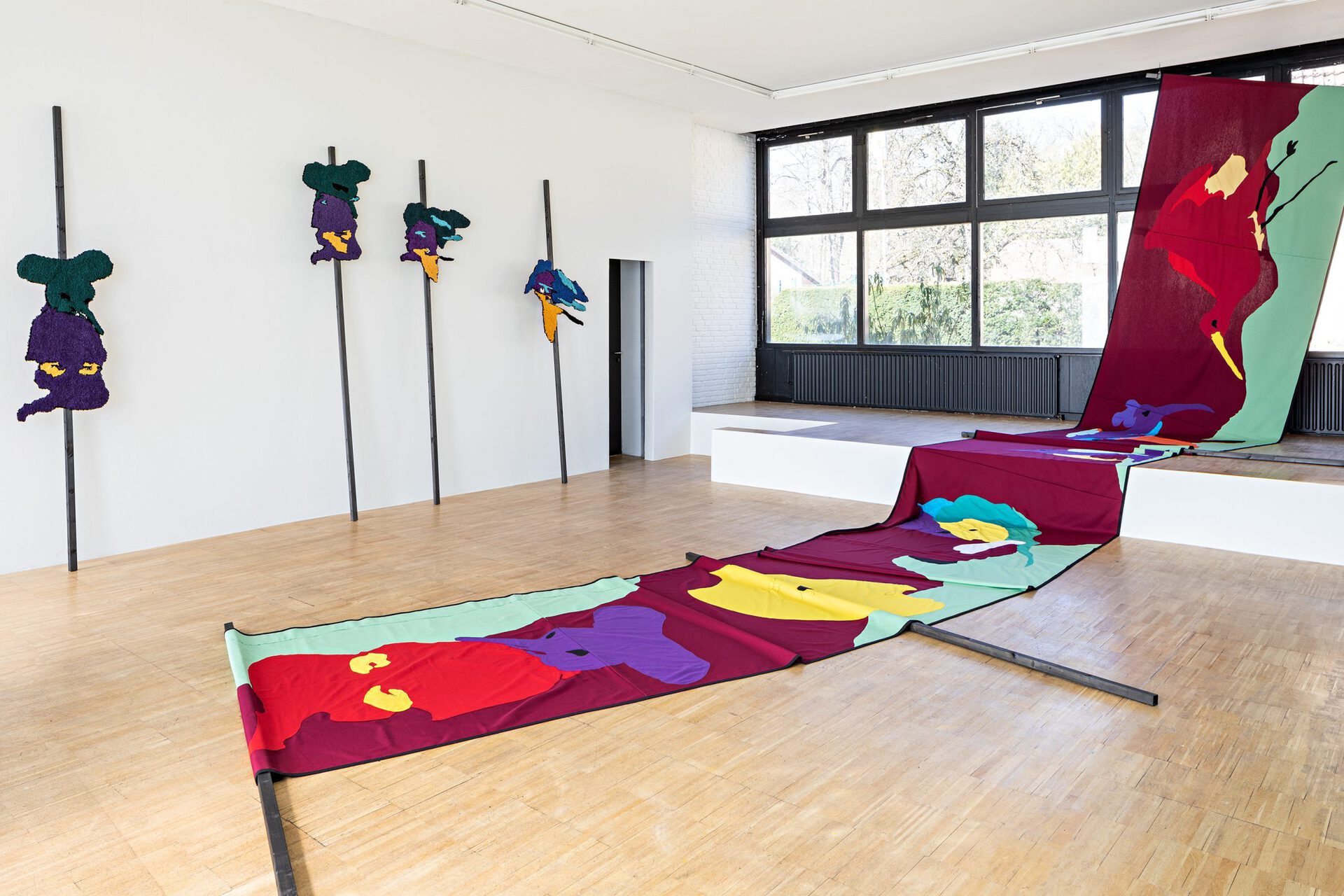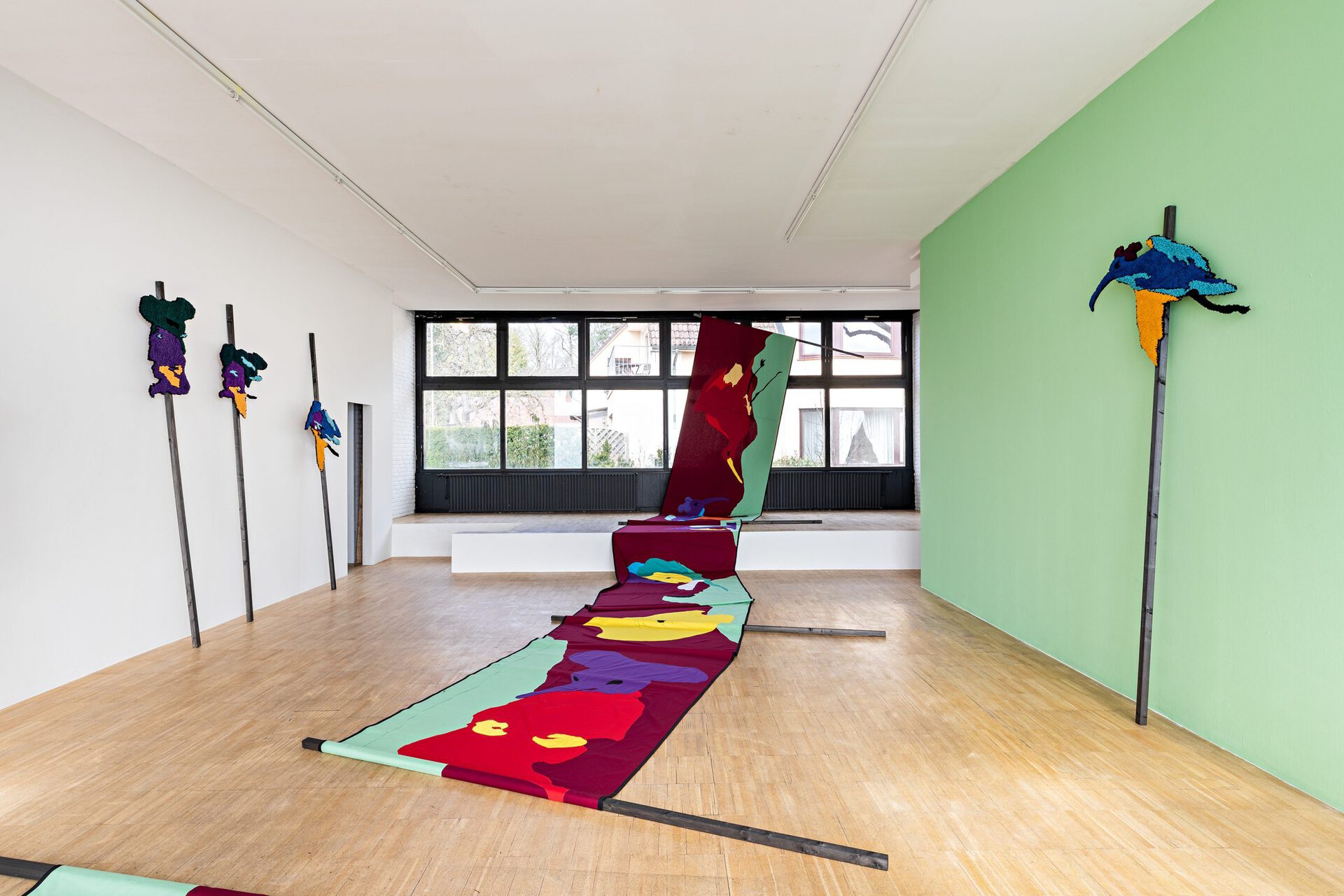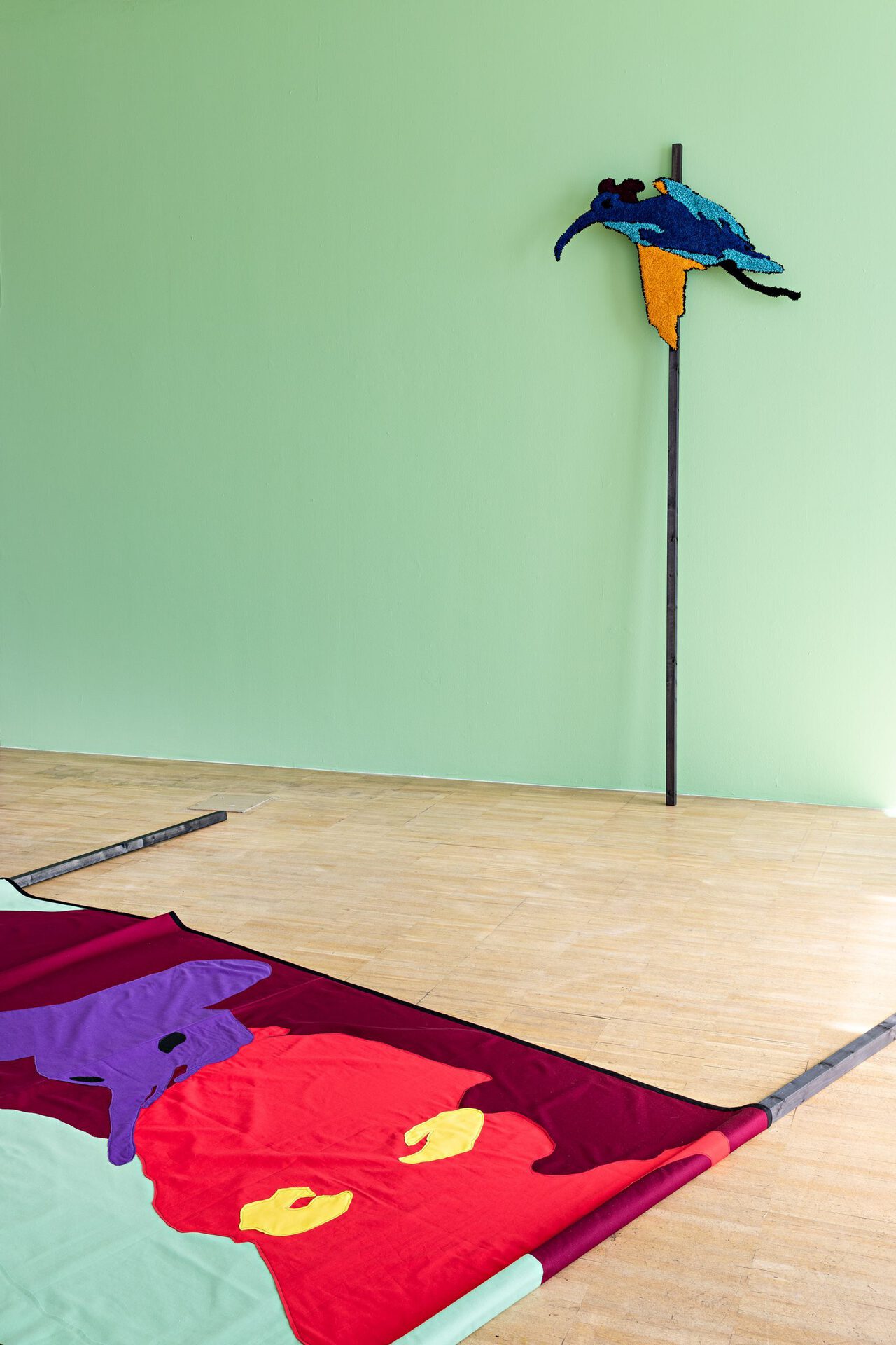 Laura Franzmann's artistic practice is characterized by an interest in the manifold communicative potentials of images. The artist explores the ways in which an image can tell stories, awaken associations, or trigger thought processes. A research-intensive, well-founded content-related examination of cultural-theoretical, philosophical and also political topics creates an intellectual basis as well as the motivation for Franzmann's work. The artist succeeds in combining aesthetic expression with complex theoretical issues. Laura Franzmann's objects and installations are found in scenarios she has created that allow for different options of perception and sometimes seem like snapshots of a process that has not yet revealed the end of its course. spring water tastes funny" illuminates the theme of "transformation" from multiple perspectives. The artist lets her works tell of transformations, initiates subtly orchestrated chains of associations, and lets viewers take on different receptive perspectives. Franzmann makes us think, about the man-made dualism of nature and culture, about the belief in the all-souledness of the environment and the possibility to look emphatically at the living beings that are different from us humans. "What words do we choose, and how do they determine our thoughts and actions? Is it enough to leave deep empathy to all living beings to our children, in fairy tales and picture books? To let animals and plants speak, to grant waters and insects a personality, an independent agenda, consciousness and a sense of pain? Which of our problems might be solved if we merely gave more importance to certain narratives more space in our lives?" Questions like these are explored by Laura Franzmann in her solo exhibition, questions that could hardly be more topical, especially in a present like ours, where the desire for touch, commonality, connection and hope, is very present and palpable.For the KVJ, Laura Franzmann has created a room-sized installation, produced using techniques predominantly used in lining and decorating interiors with textile appliqués, such as tufting, a technique for creating three-dimensional textile surfaces. The artist has changed the architecture of the exhibition space of the Kunstverein Jesteburg e.V., providing more light permeability and viewing possibilities from the outside. Her works emphasize the architecture of the former bank building in a special way. With virtuosity, Laura Franzmann makes it possible to experience a play of colors and surfaces in the space and in this way creates numerous connections, the discovery of which has a lasting effect.