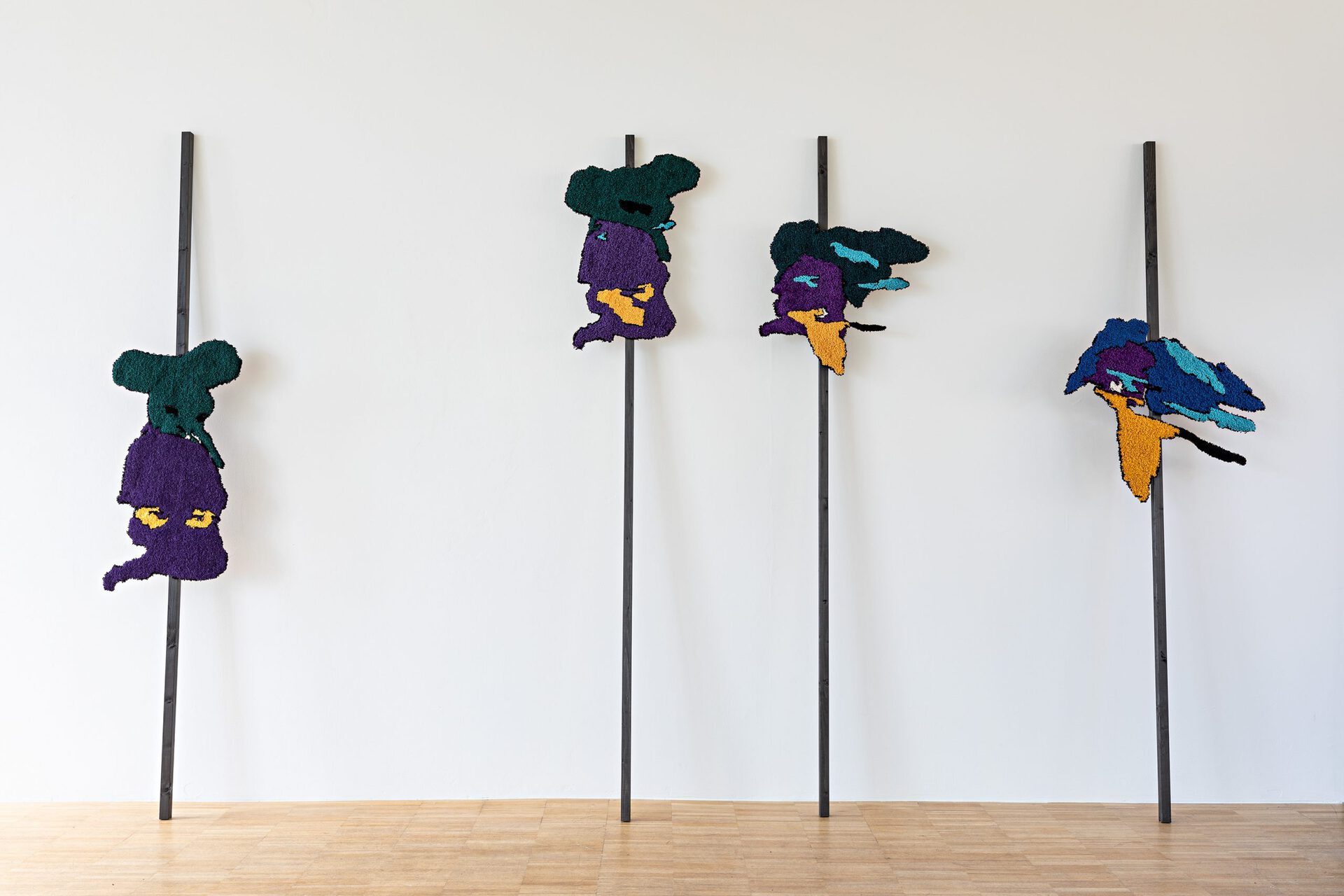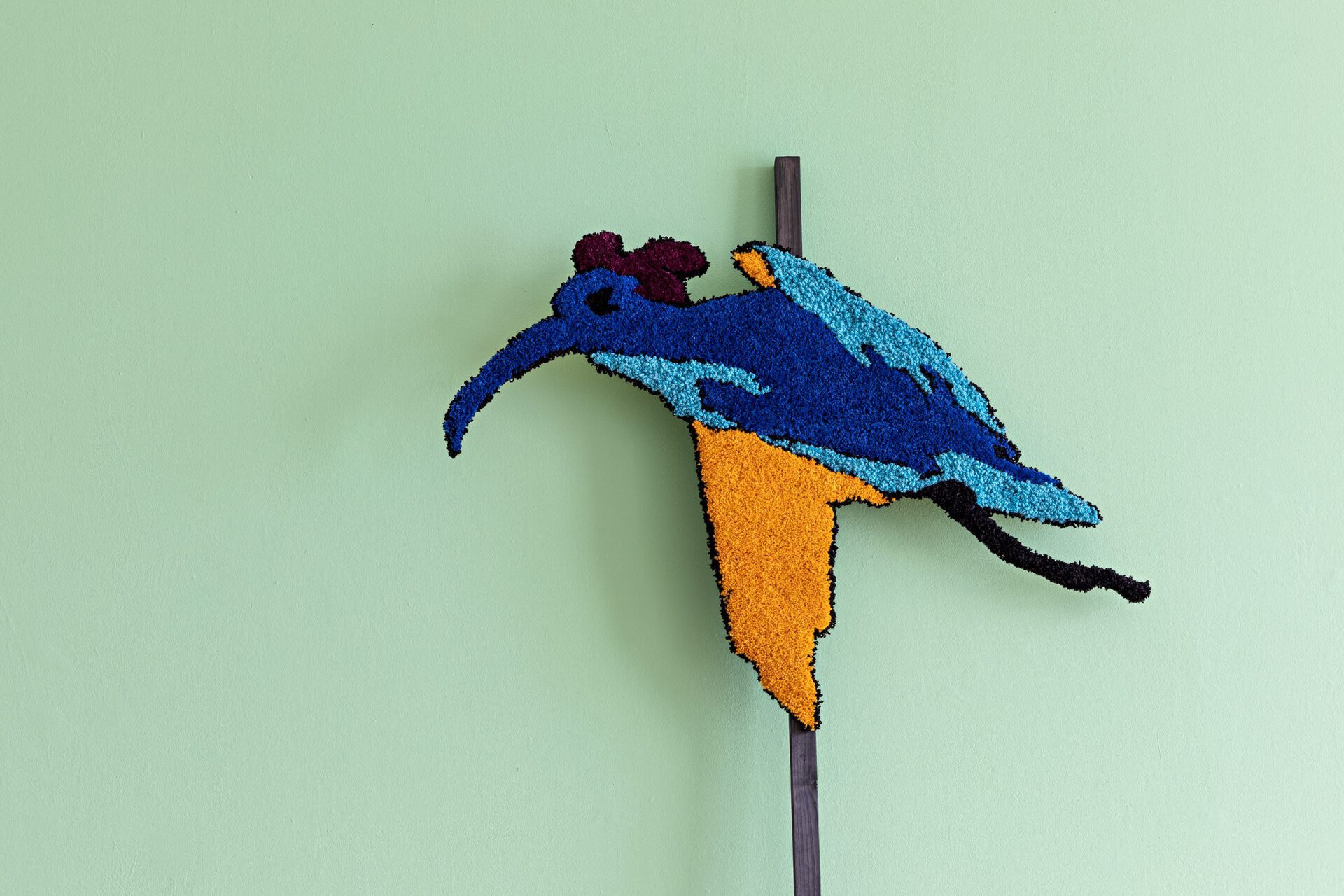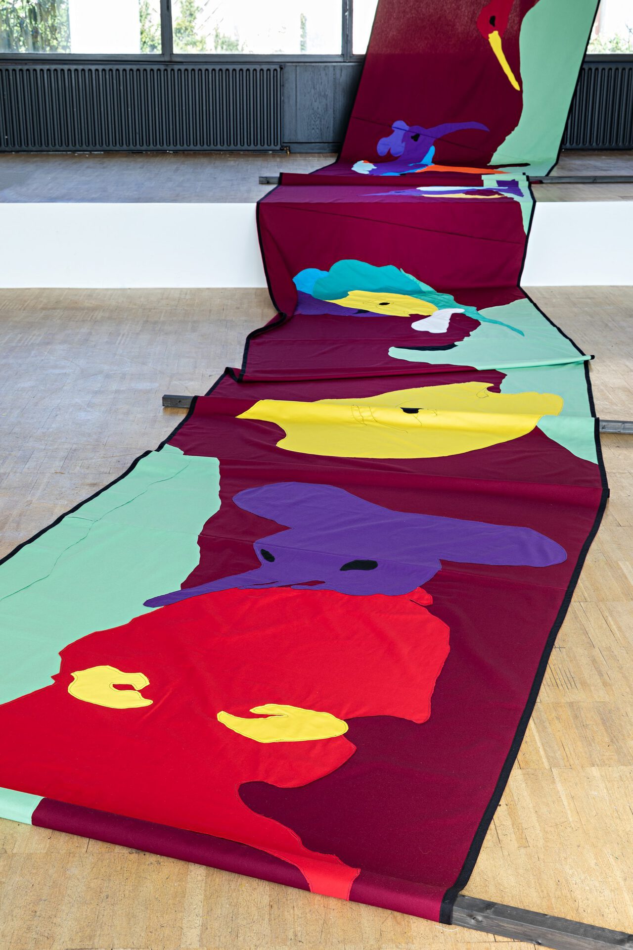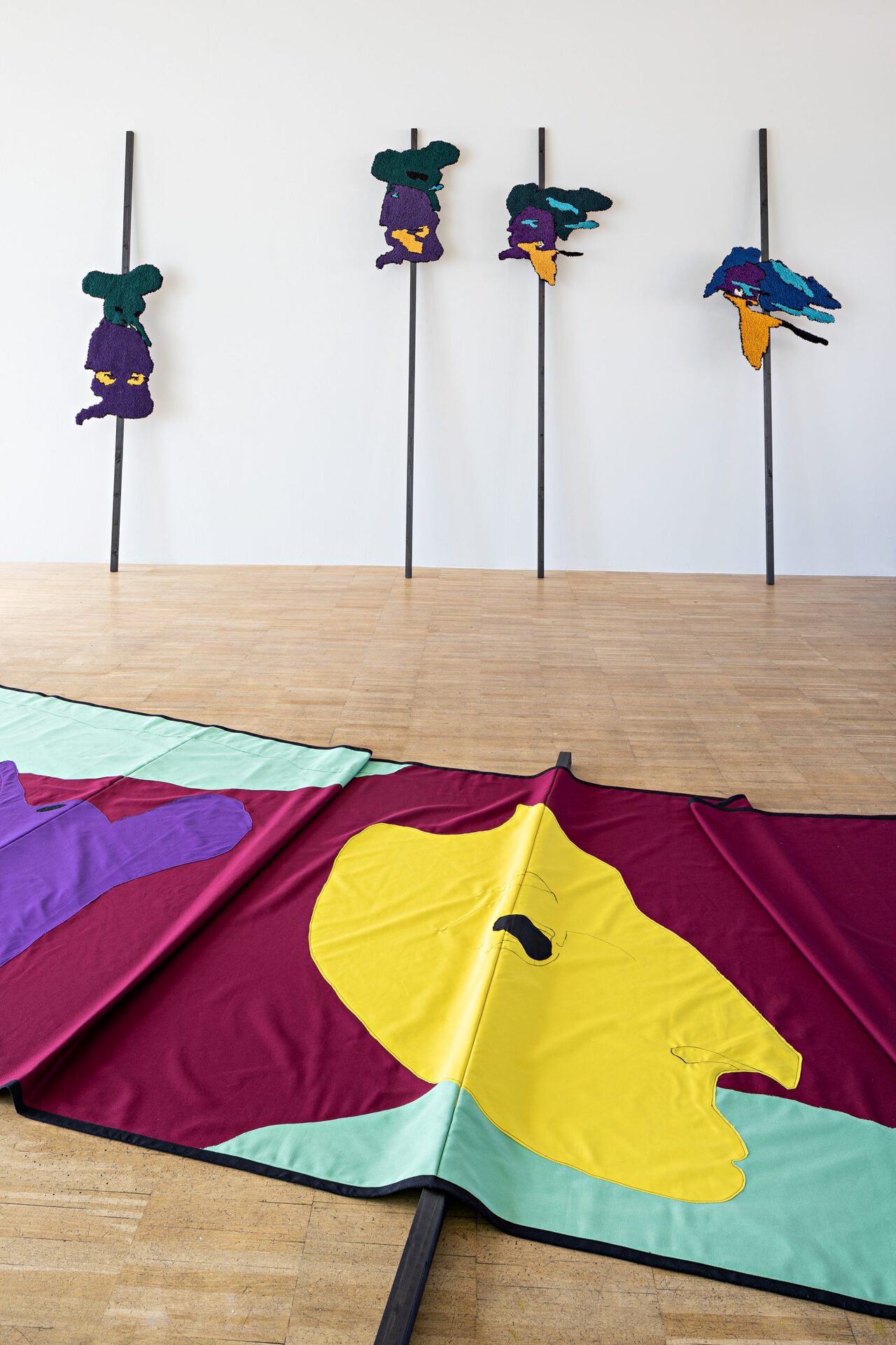 Laura Franzmann's artistic practice is characterized by an interest in the manifold communicative potentials of images. The artist explores the ways in which an image can tell stories, awaken associations, or trigger thought processes. A research-intensive, well-founded content-related examination of cultural-theoretical, philosophical and also political topics creates an intellectual basis as well as the motivation for Franzmann's work. The artist succeeds in combining aesthetic expression with complex theoretical issues. Laura Franzmann's objects and installations are found in scenarios she has created that allow for different options of perception and sometimes seem like snapshots of a process that has not yet revealed the end of its course. spring water tastes funny" illuminates the theme of "transformation" from multiple perspectives. The artist lets her works tell of transformations, initiates subtly orchestrated chains of associations, and lets viewers take on different receptive perspectives. Franzmann makes us think, about the man-made dualism of nature and culture, about the belief in the all-souledness of the environment and the possibility to look emphatically at the living beings that are different from us humans. "What words do we choose, and how do they determine our thoughts and actions? Is it enough to leave deep empathy to all living beings to our children, in fairy tales and picture books? To let animals and plants speak, to grant waters and insects a personality, an independent agenda, consciousness and a sense of pain? Which of our problems might be solved if we merely gave more importance to certain narratives more space in our lives?" Questions like these are explored by Laura Franzmann in her solo exhibition, questions that could hardly be more topical, especially in a present like ours, where the desire for touch, commonality, connection and hope, is very present and palpable.For the KVJ, Laura Franzmann has created a room-sized installation, produced using techniques predominantly used in lining and decorating interiors with textile appliqués, such as tufting, a technique for creating three-dimensional textile surfaces. The artist has changed the architecture of the exhibition space of the Kunstverein Jesteburg e.V., providing more light permeability and viewing possibilities from the outside. Her works emphasize the architecture of the former bank building in a special way. With virtuosity, Laura Franzmann makes it possible to experience a play of colors and surfaces in the space and in this way creates numerous connections, the discovery of which has a lasting effect.