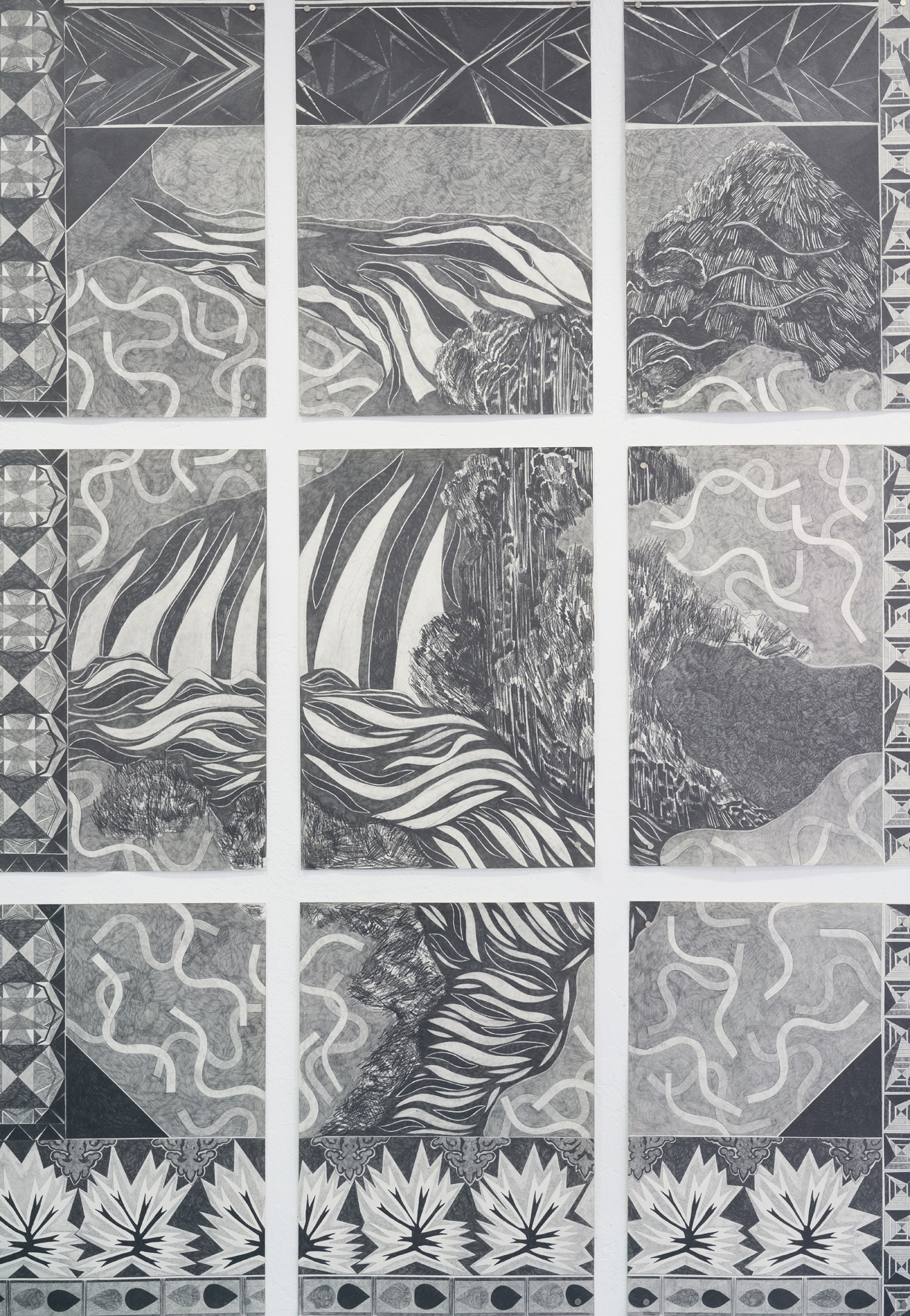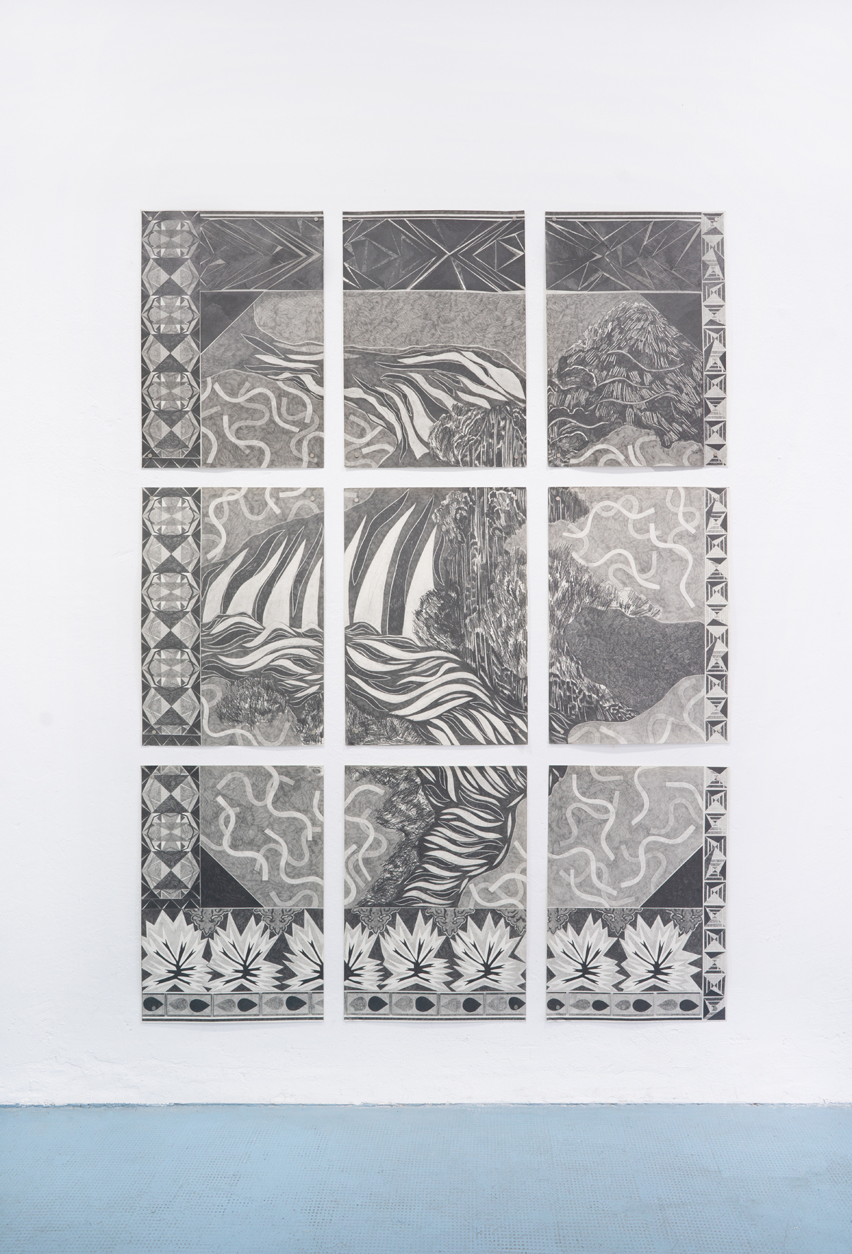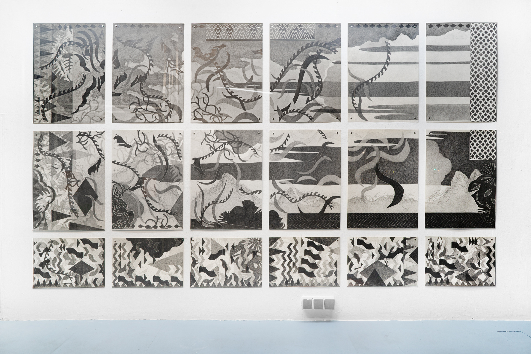 Ricarda Hoops Zeichnungen verweisen auf und erinnern an Wandteppiche. Die zusammengesetzten Arbeiten sind Orte von Reflexionen über Orte. Das Zeichnen, das Suchen, Schraffieren und Denken: Betrachtungen von topografischen Fragestellungen, imaginären und realen Orten, Abgrenzungen und Übergängen.