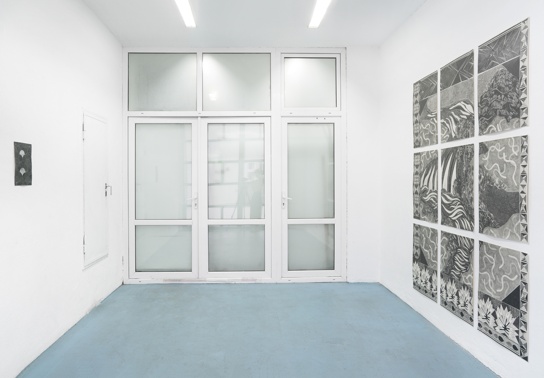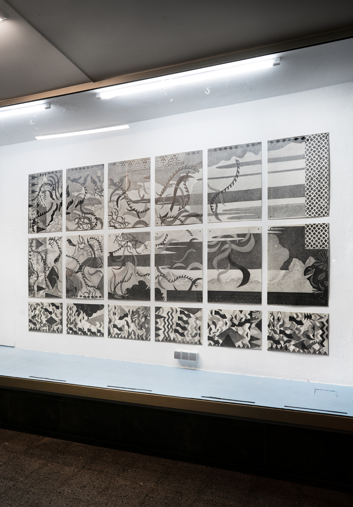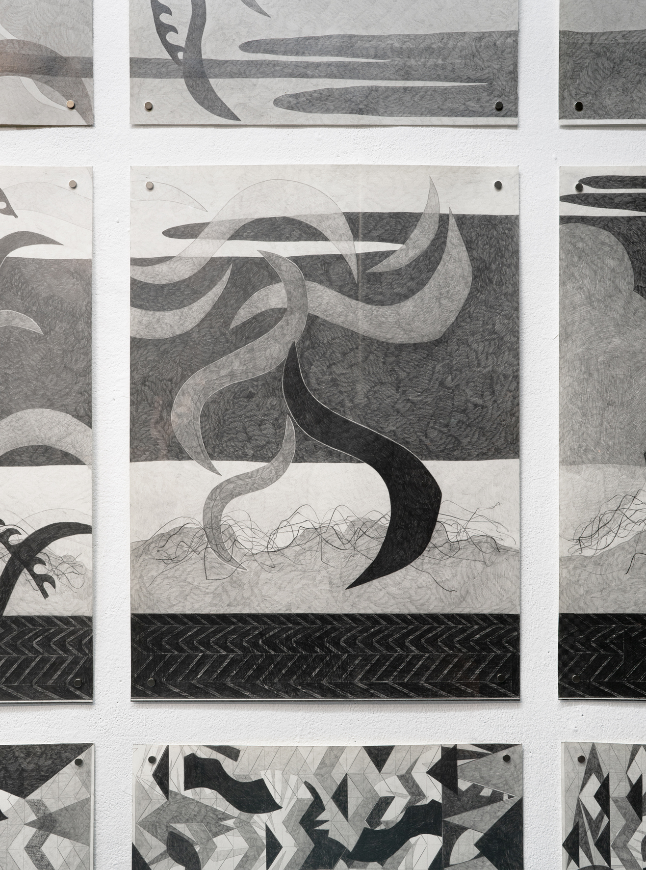 Ricarda Hoops Zeichnungen verweisen auf und erinnern an Wandteppiche. Die zusammengesetzten Arbeiten sind Orte von Reflexionen über Orte. Das Zeichnen, das Suchen, Schraffieren und Denken: Betrachtungen von topografischen Fragestellungen, imaginären und realen Orten, Abgrenzungen und Übergängen.