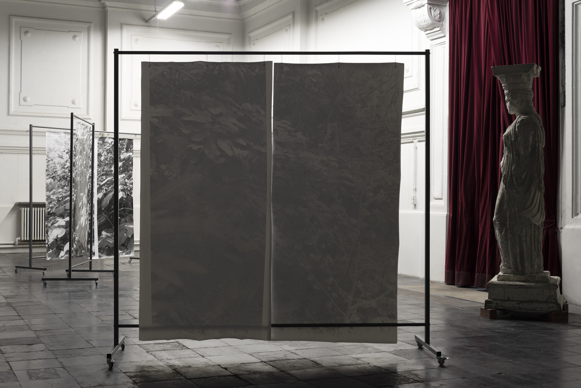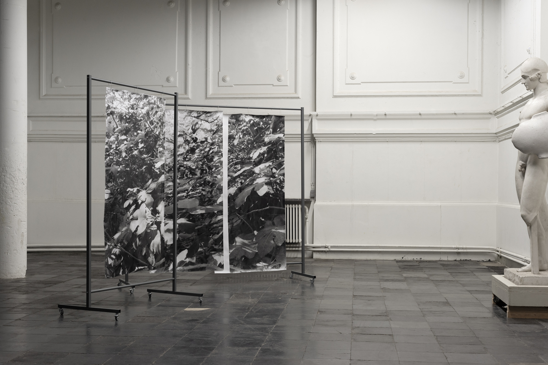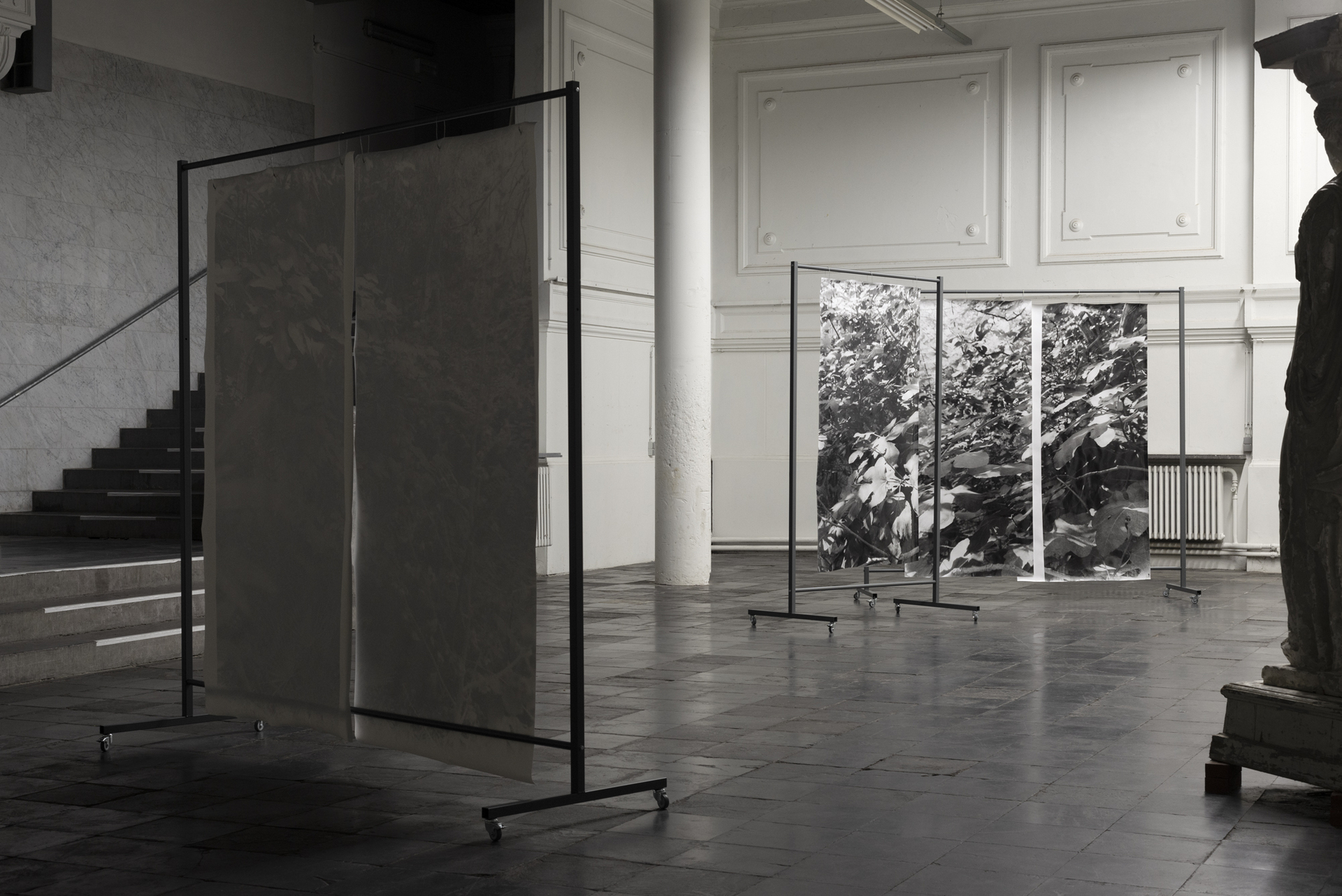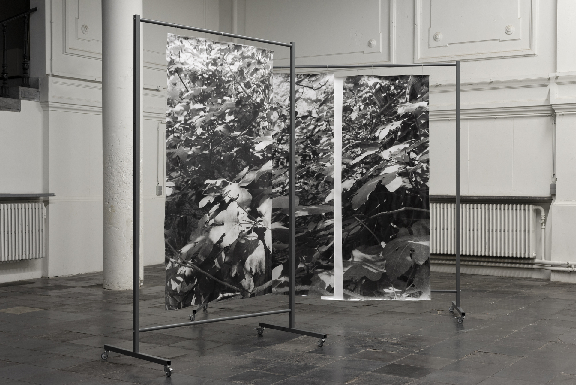 placement I, 2022, silver gelatin prints on baryta paper, mobile coated steel racks, 250x225x75cm and 250x150x75cm, unique copy, variable positionsText