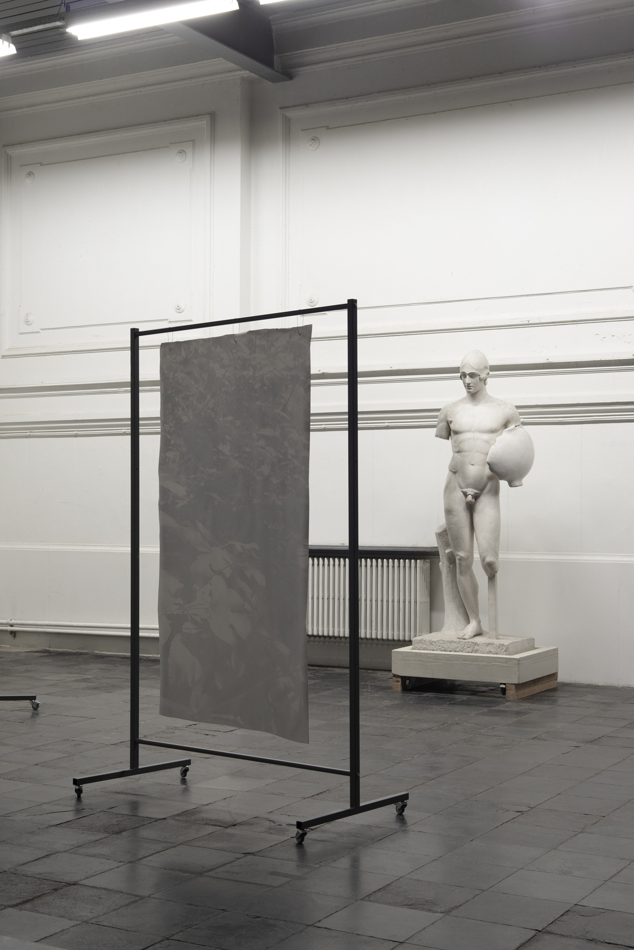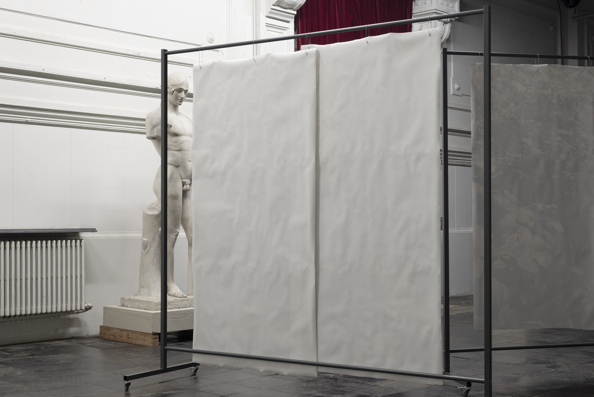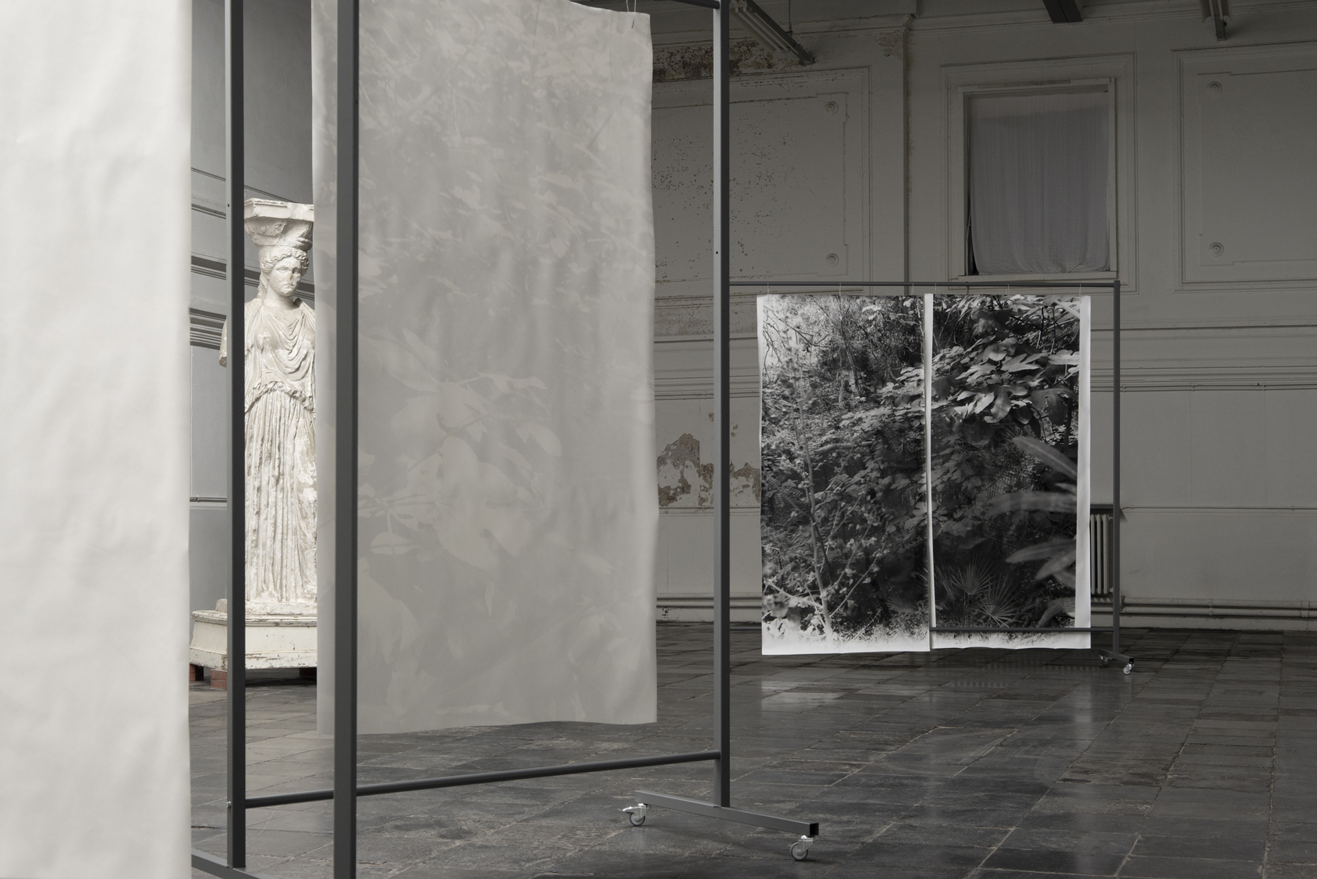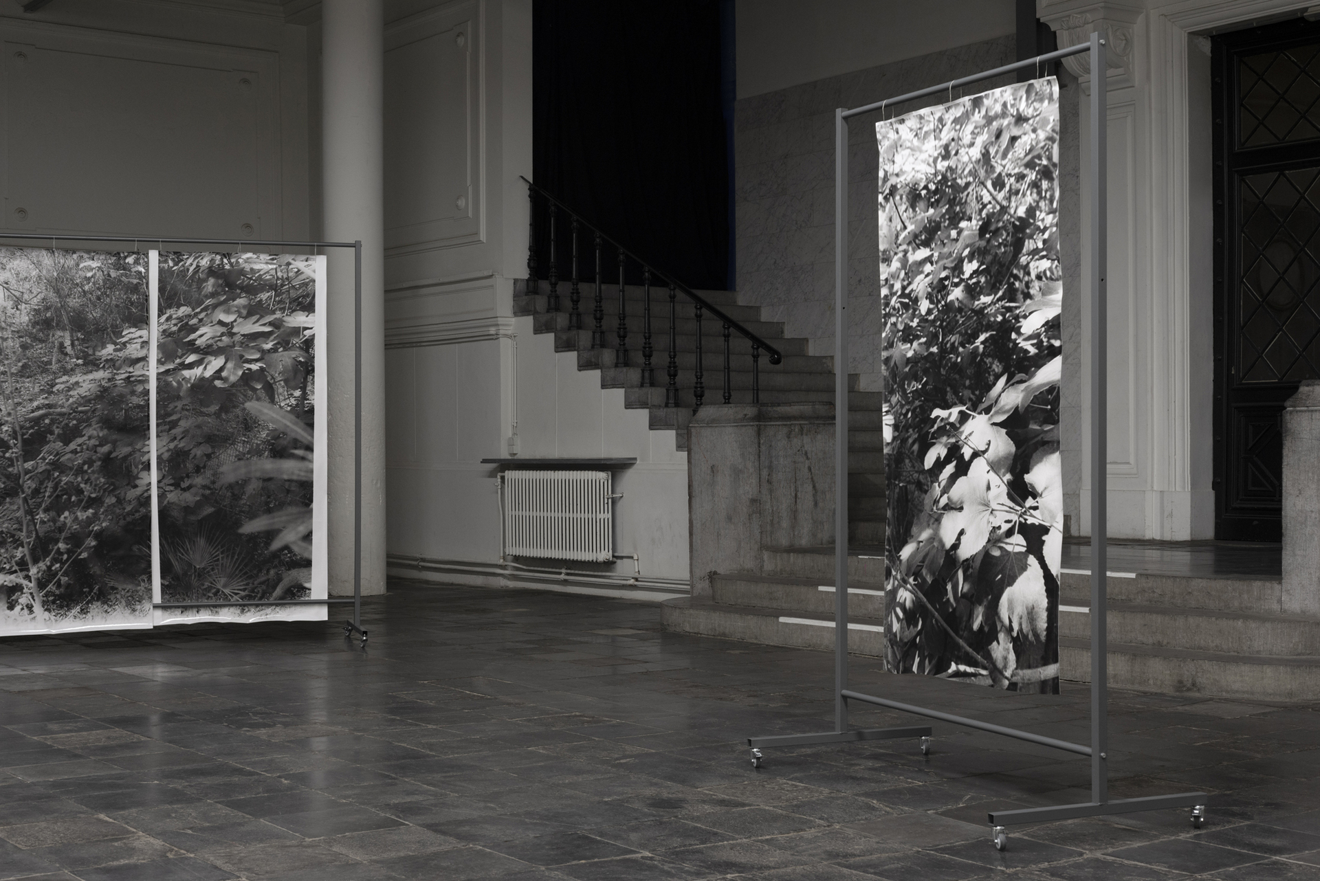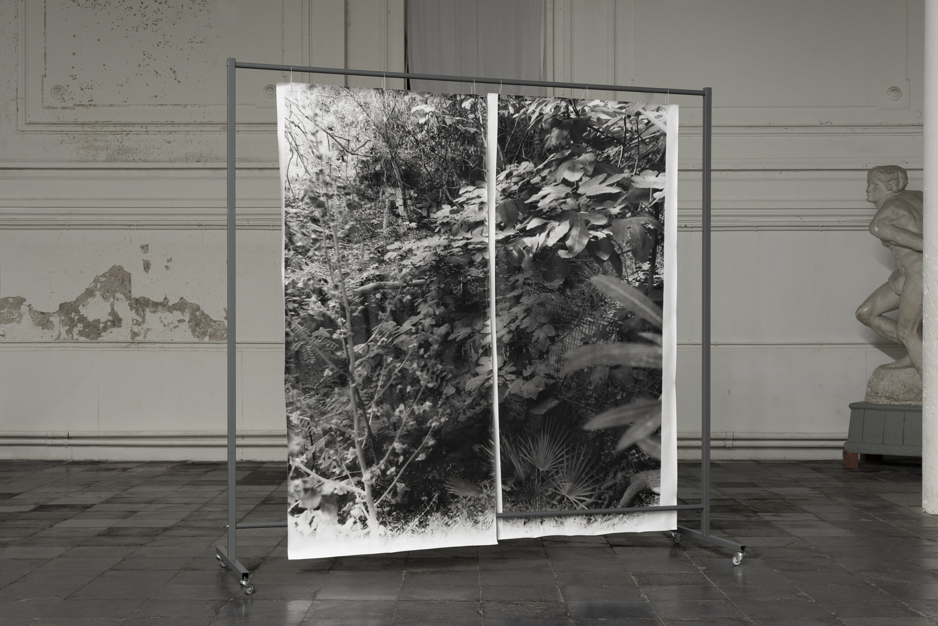 placement I, 2022, silver gelatin prints on baryta paper, mobile coated steel racks, 250x225x75cm and 250x150x75cm, unique copy, variable positionsText