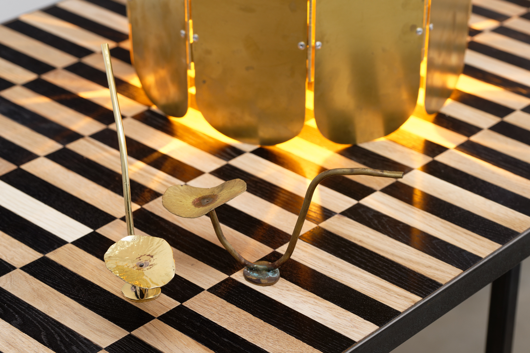 The foyer - or hearth - is the place where the fire is found, but also the hypocentre, the headquarters in a context of family or community. This core is represented physically in the gallery by the lamp surrounded by a brass firewall, like a central point from which the rays emitted by a source of light and heat diverge. The incandescence here comes from a sodium vapor bulb, the same found in street lights and other public lighting - but also, in some specific cases, in indoor plant growing. Almost impossible to look at with the naked eye, this light generates a change in sensory perception. In such a way, it allows the artist to split the space and to visualise the moment of the exhibition in two stages and two states: a sunrise, which gradually becomes the campfire of a dwelling.