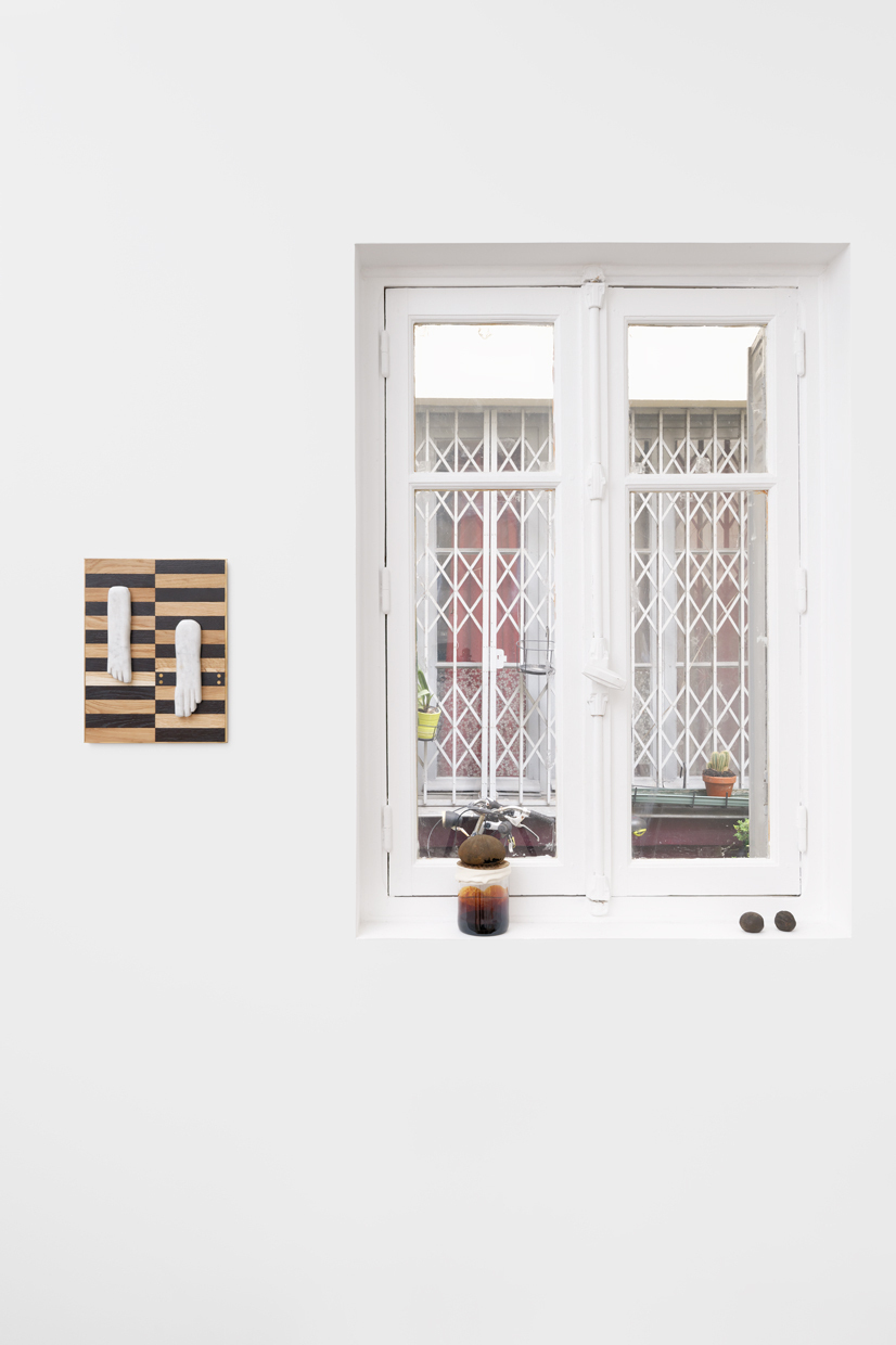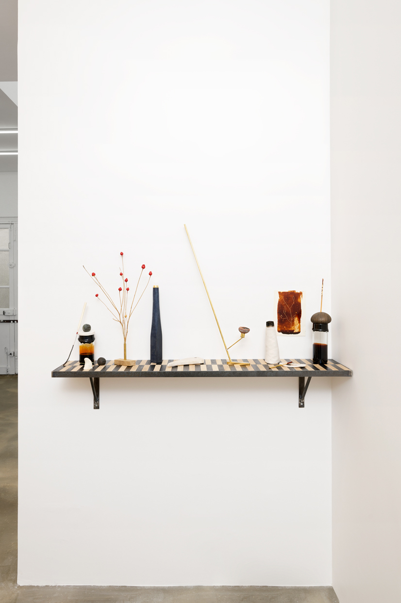 They also participate in the evolving character of the environment, modifying it with tiny disturbances and invisible growths related to the organic materials that the artist allows to spread. The weather, the light, but also the movement of visitors have an impact on the living forms. The proximity, the contact of the works upon the public, sometimes adds a therapeutic character to the ambience designed by Martin Belou. The brass utensils and the wooden and raw porcelain recipients belong to the realm of medical instruments or ancient pharmaceutical remedies. Inhaling from the cauldron relieves and relaxes a feverish mind. The artist chooses to allow the revelation of a mutation of certain resources and recipes that he elaborates from an infusion of plants or of fermenting grains and mushrooms. The weather of the foyer creates a phenomenon of erosion, in which certain topography transforms. From this, our perception is led to move itself between the birth and the death of the exhibition.