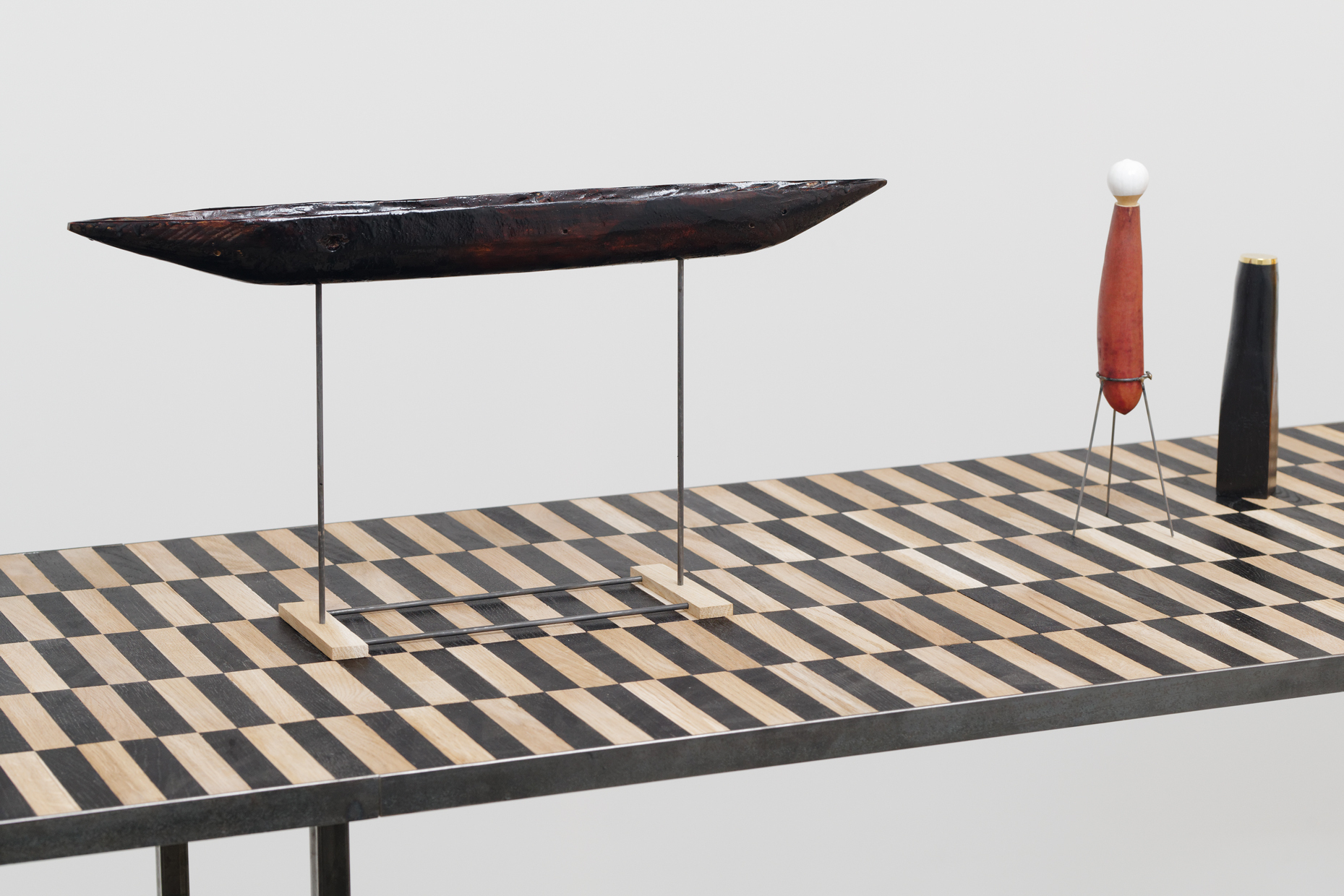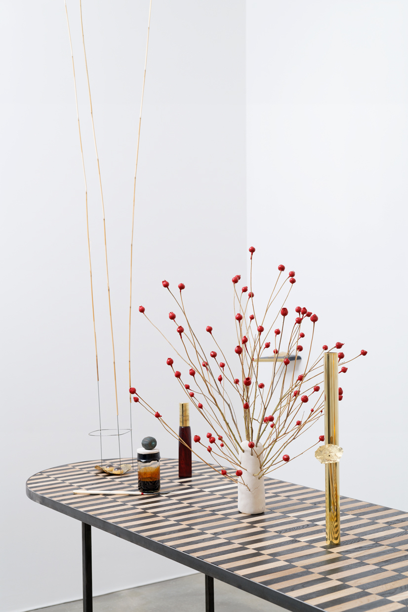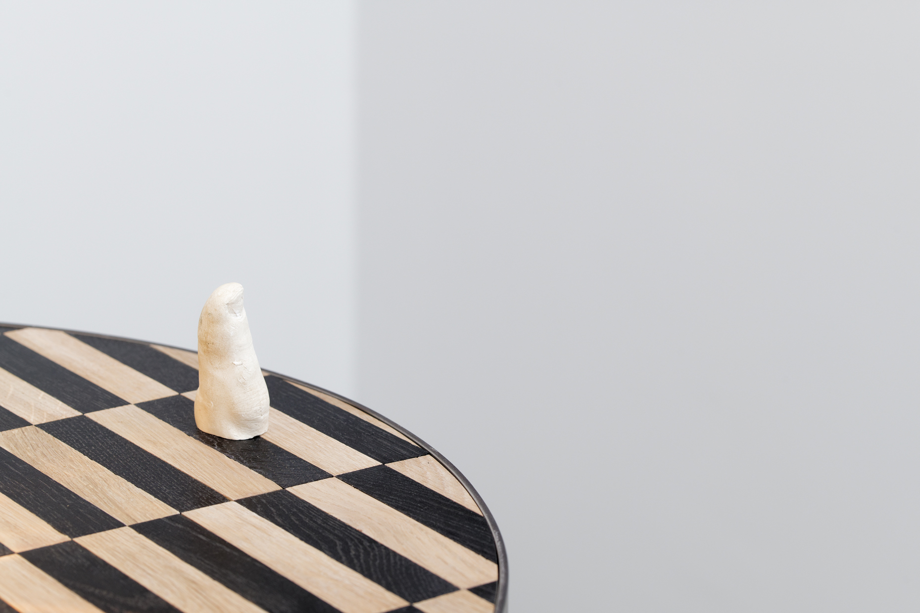 Martin Belou plays with the modular character of quotidian elements and of the furniture he fabricates, allowing them to integrate with the physical properties of the event space. Like a construction kit, a monumental set of Kapla, the artist constructs the space of this foyer with the help of a mosaic comprised of pieces of bicolored oak, customarily used in flooring design. The furniture motif leads us to an architectural construction, to the invention of perspective in the history of painting with the checkerboard which geometrizes a space. It usually determines the floor and the edges of a room. Here, the vanishing point is frontal, directed by the crosswise table, arranged like an altar.