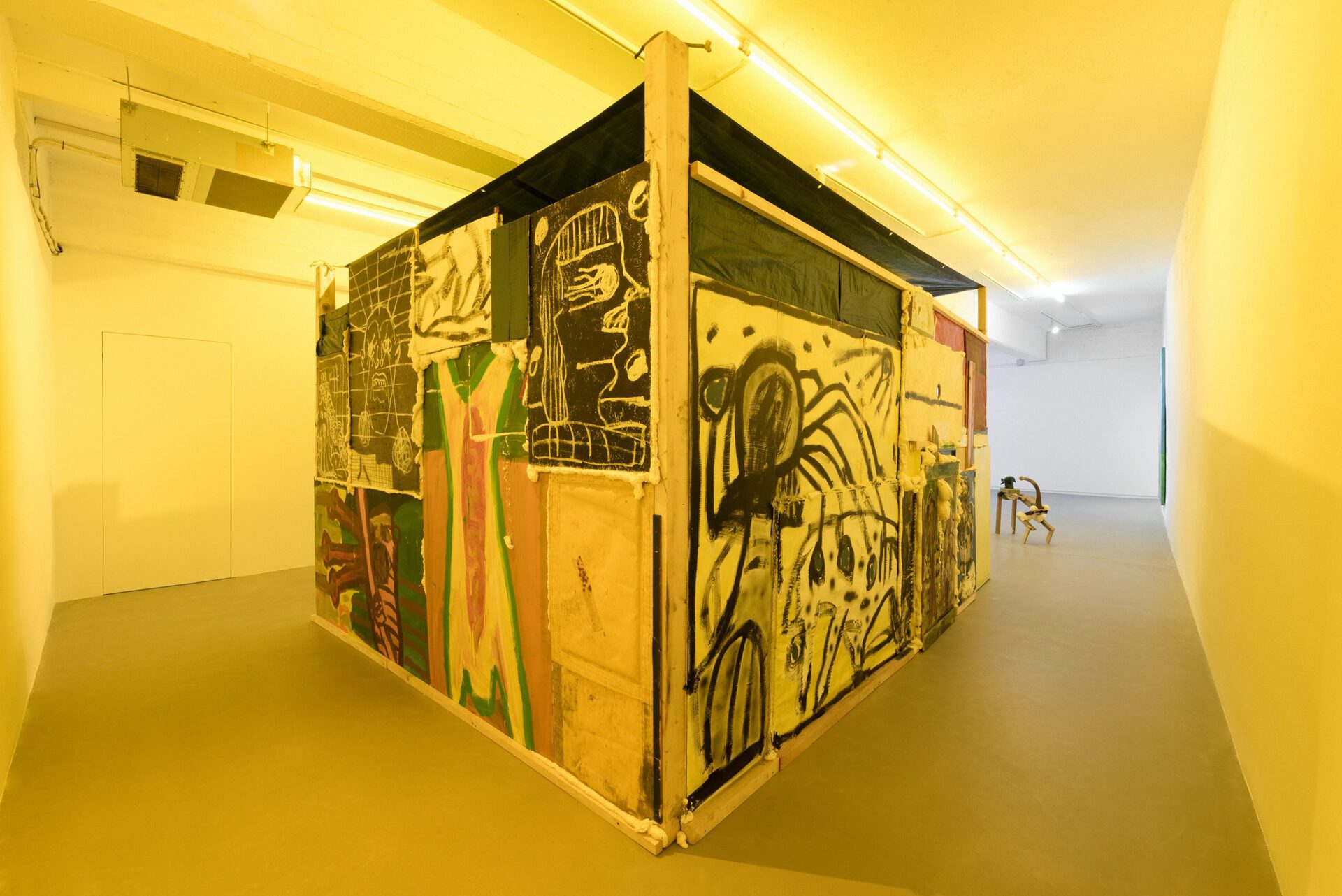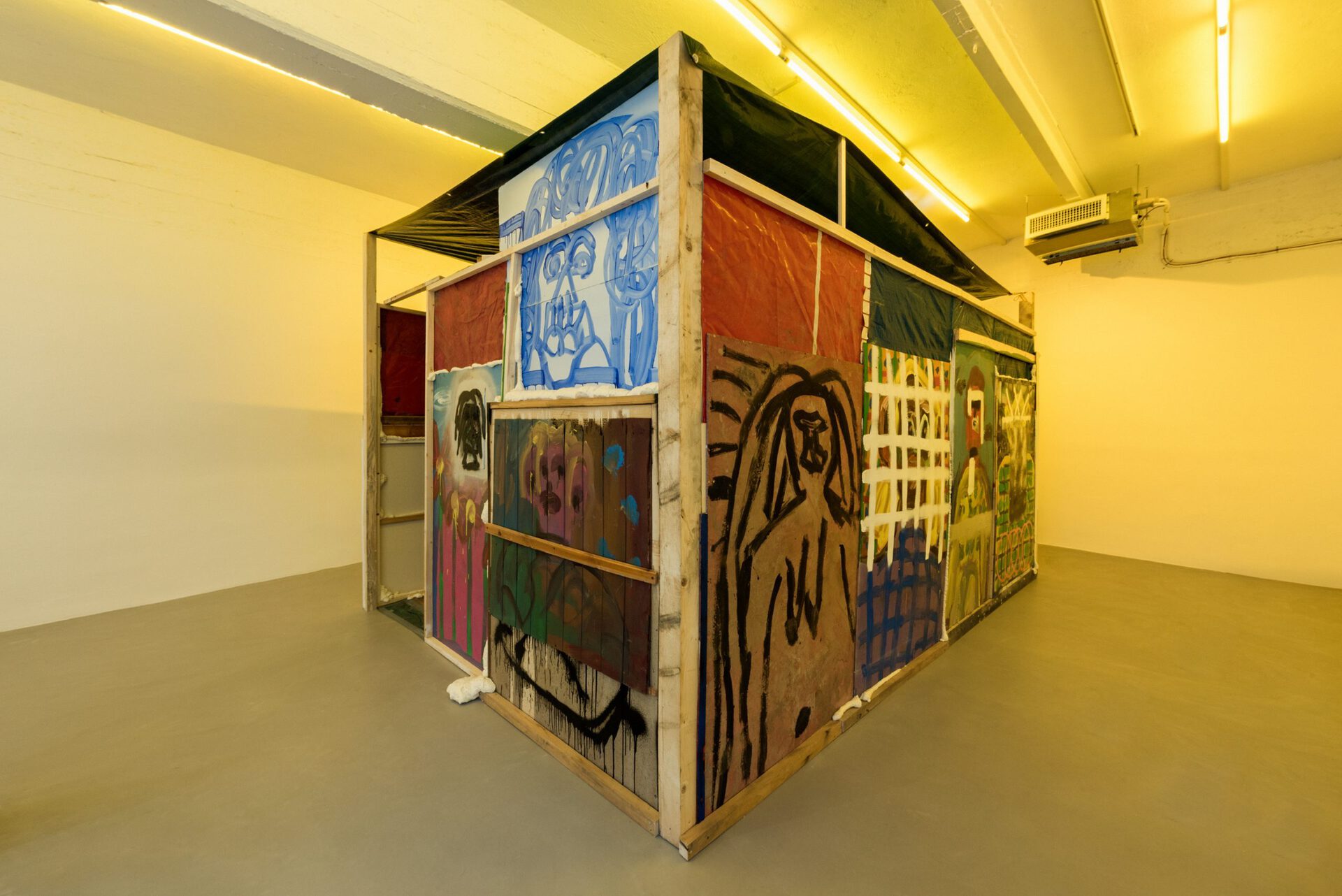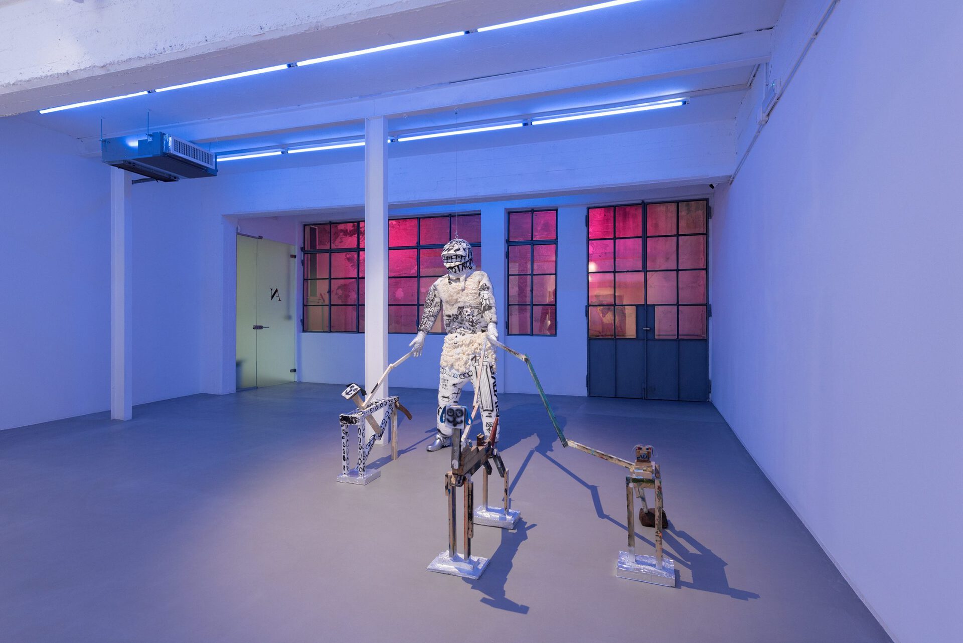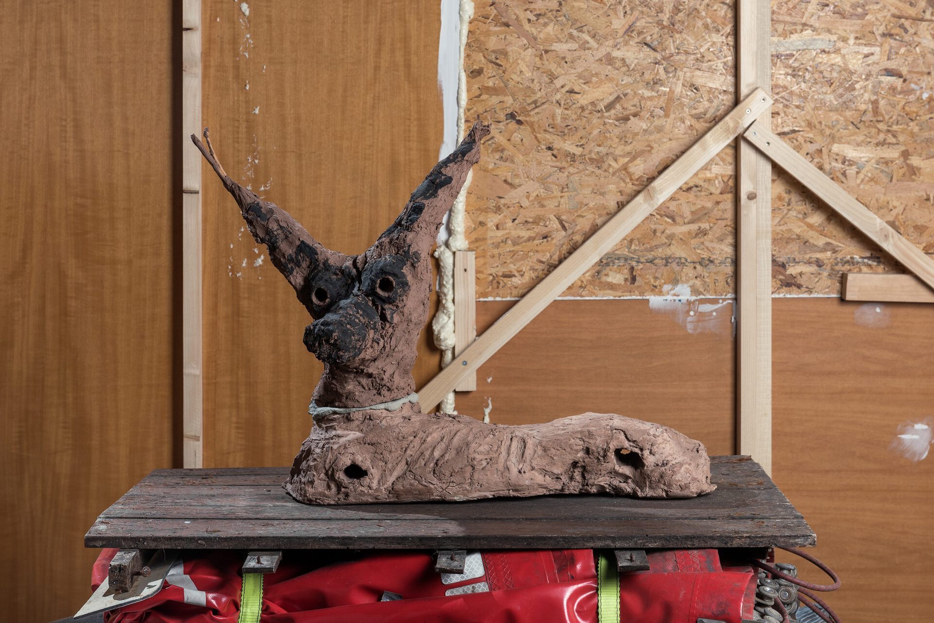 Let’s start from a postcard that draws on decidedly biographical aspects. Roberto Alfano, for those who don’t know him, grew up between the industrialised moors of the sub-rural area par excellence, the Lower Lodigiana, and the livelier and more flooded expanse of the Emilian plain. The postcard in question is an image or a memory that seems at first glance to rummage around with that neo-realist bucolic of the farmyard courtyard, children running in the fields, dogs and walks. And it will immediately seem as if the subjects of Miraggio Inferiore are dogs: dogs of wood, dogs of earth and clay and cement, dogs of cloth and sequins, spotted and striped, motionless and snappy. You will see that there is a shack, just like the abusive ones so often found at the base of motorway overpasses, where you never know whether the mist is actually pollution or vice versa. You will also notice the recurrence of figures and signs with childish features, and this is where we commence.