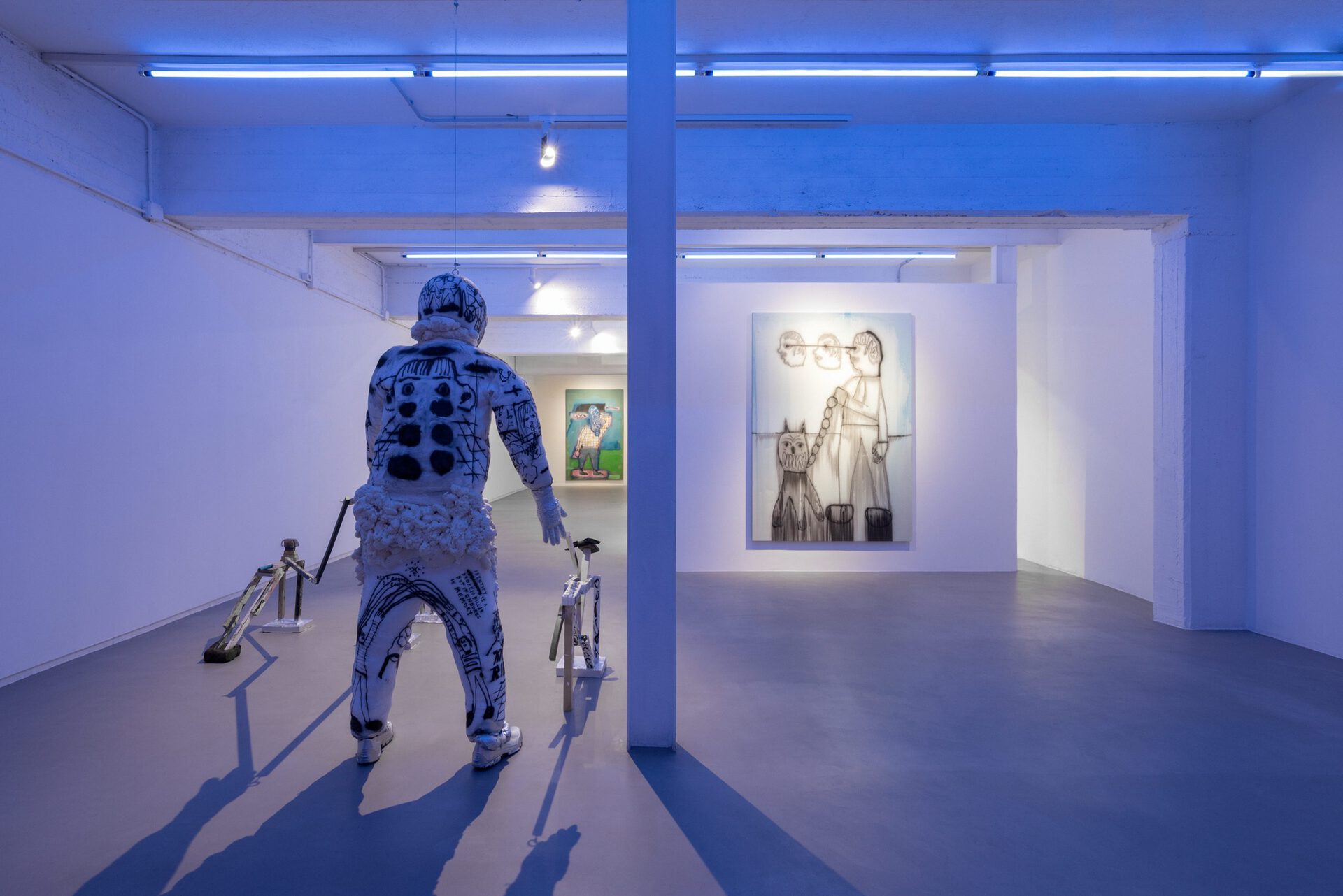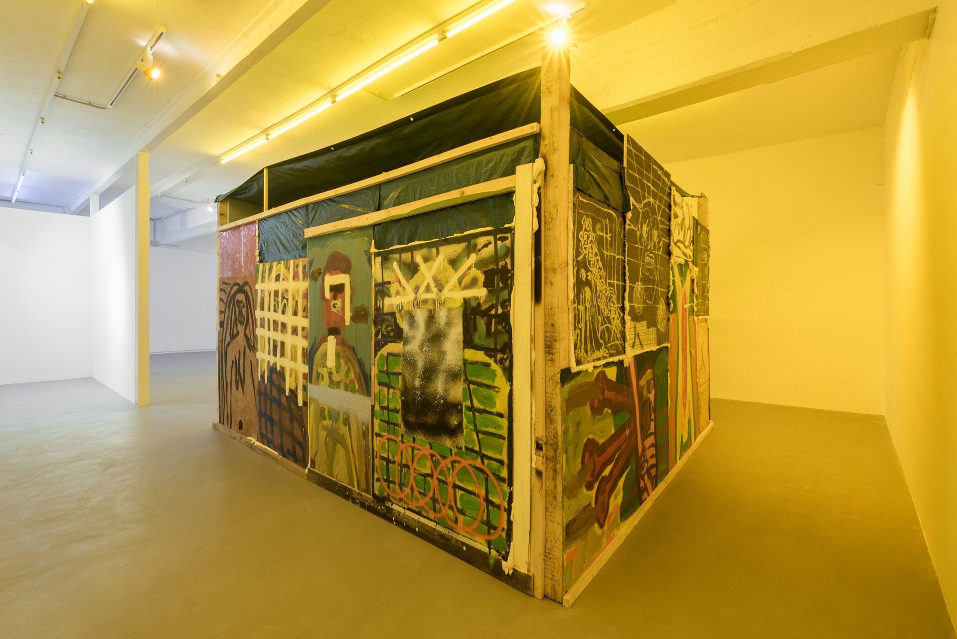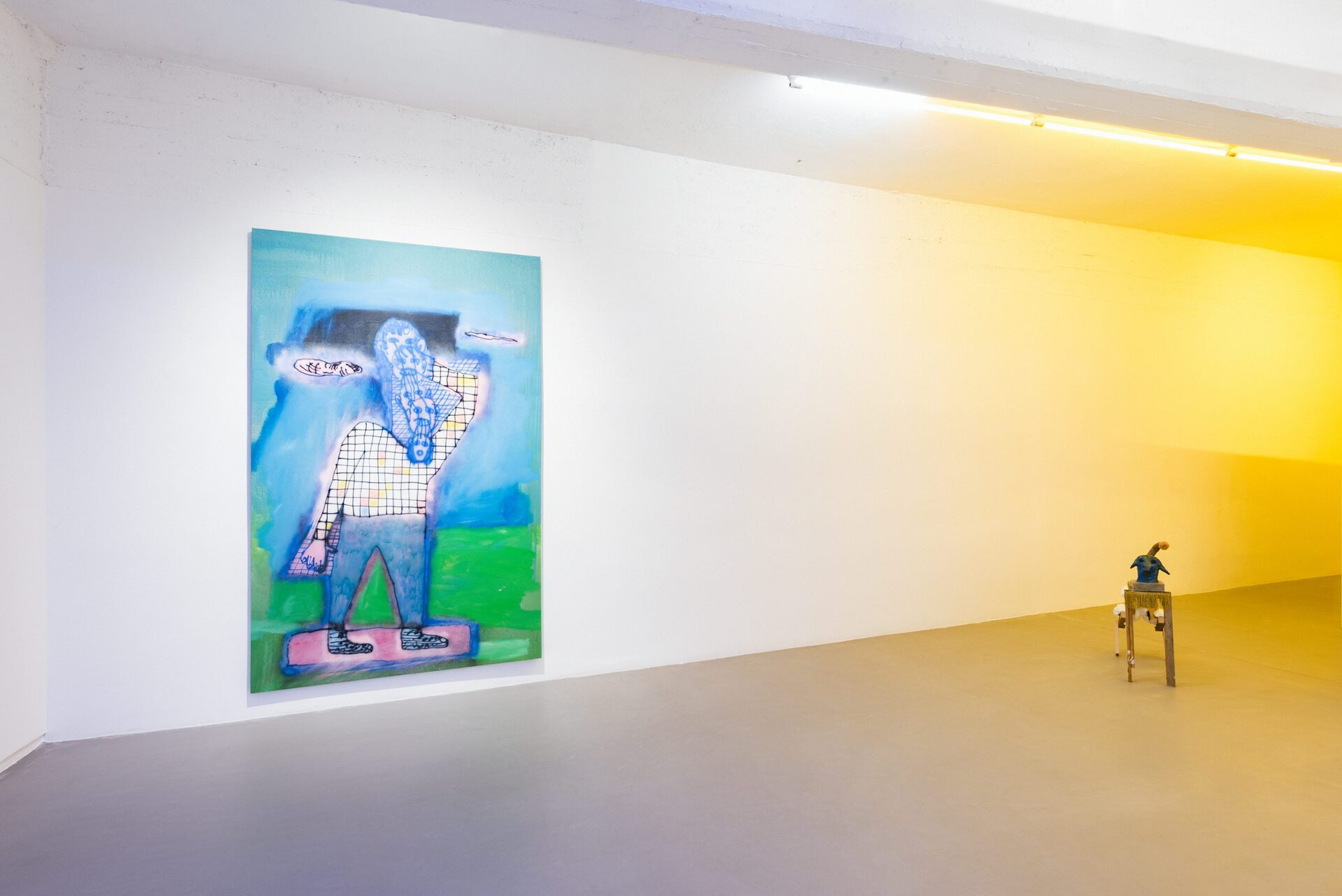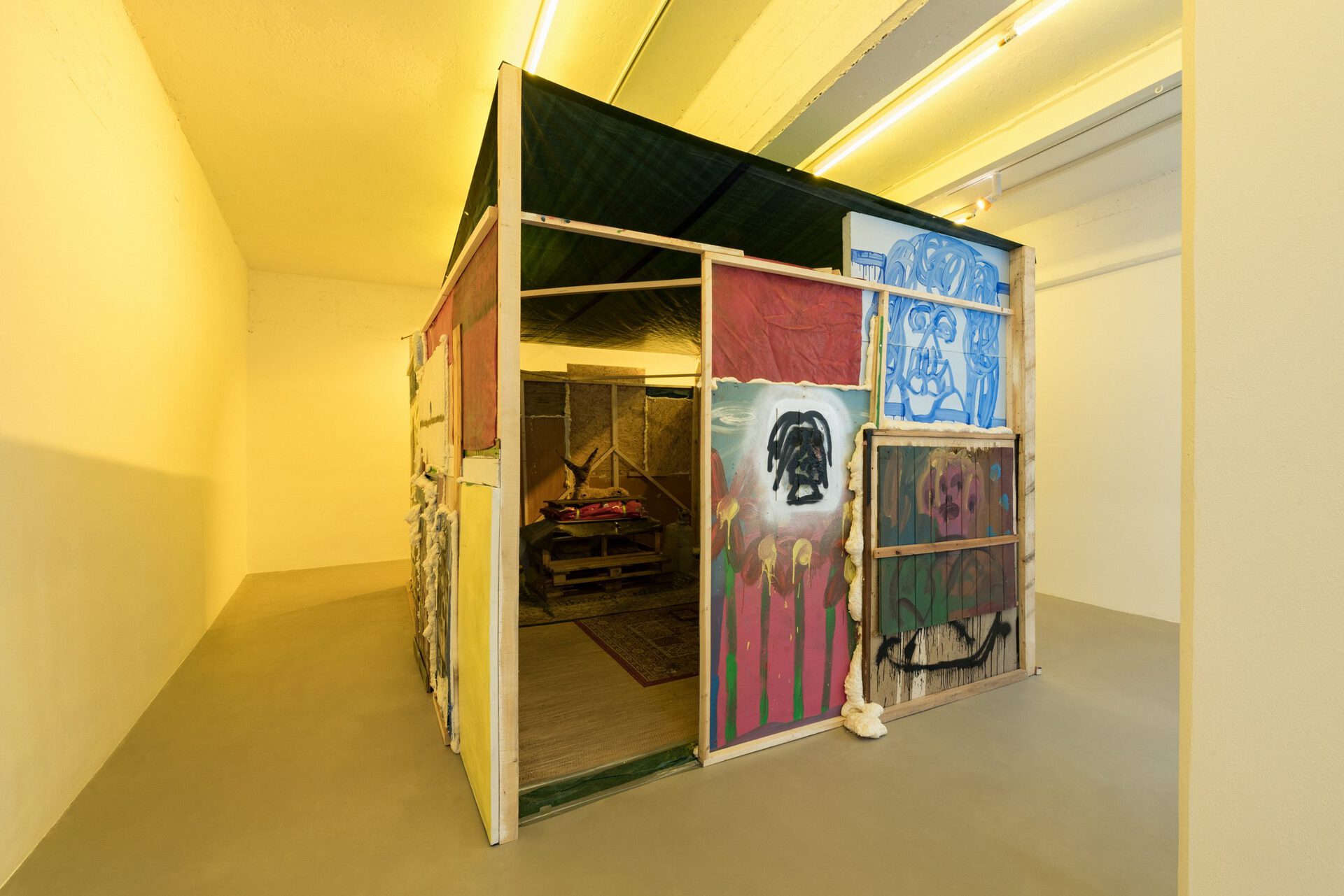 Let’s start from a postcard that draws on decidedly biographical aspects. Roberto Alfano, for those who don’t know him, grew up between the industrialised moors of the sub-rural area par excellence, the Lower Lodigiana, and the livelier and more flooded expanse of the Emilian plain. The postcard in question is an image or a memory that seems at first glance to rummage around with that neo-realist bucolic of the farmyard courtyard, children running in the fields, dogs and walks. And it will immediately seem as if the subjects of Miraggio Inferiore are dogs: dogs of wood, dogs of earth and clay and cement, dogs of cloth and sequins, spotted and striped, motionless and snappy. You will see that there is a shack, just like the abusive ones so often found at the base of motorway overpasses, where you never know whether the mist is actually pollution or vice versa. You will also notice the recurrence of figures and signs with childish features, and this is where we commence.